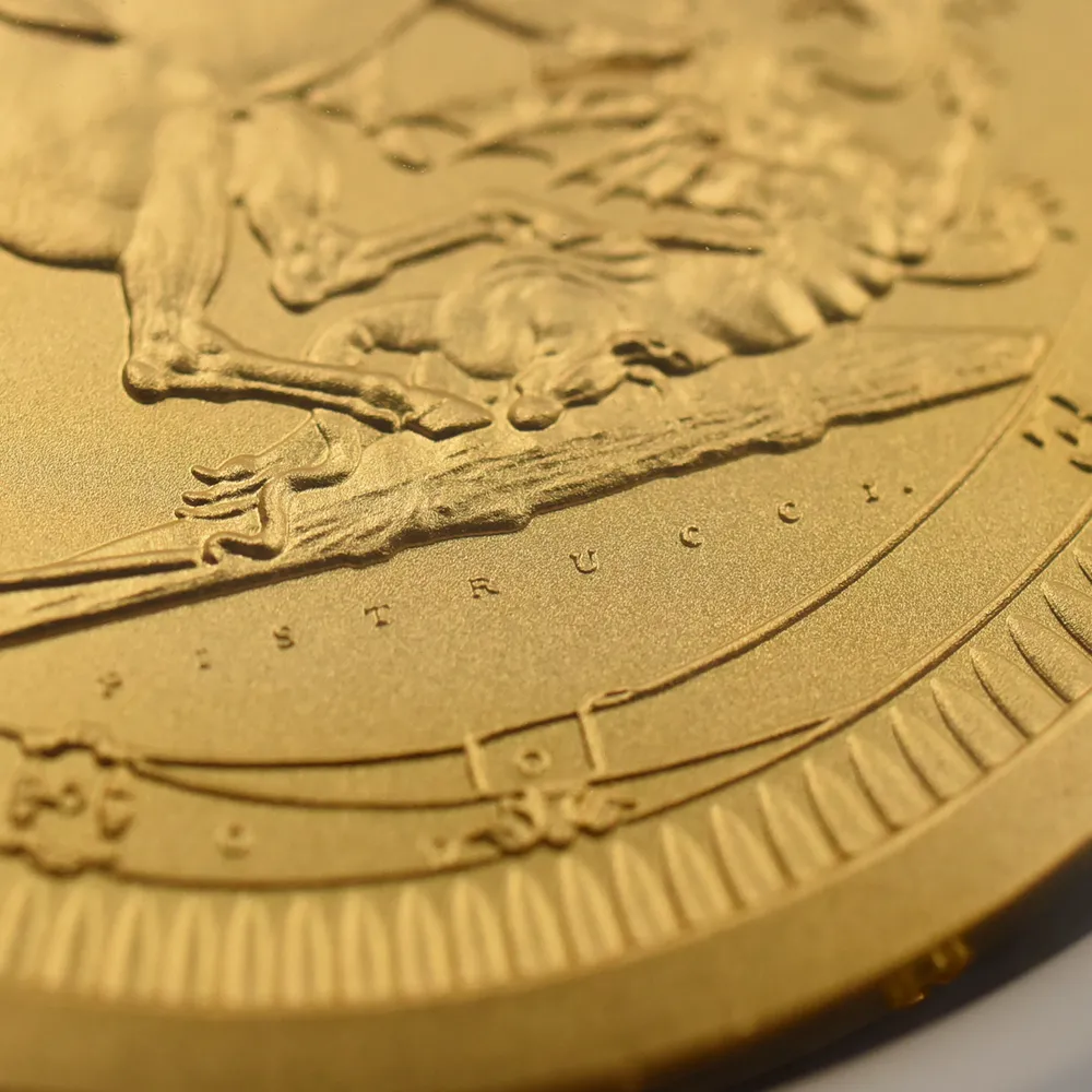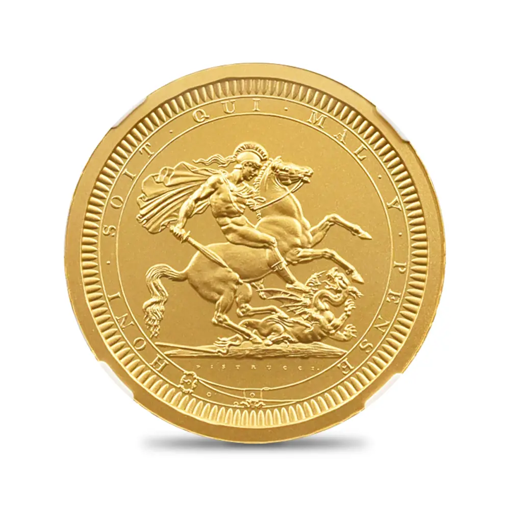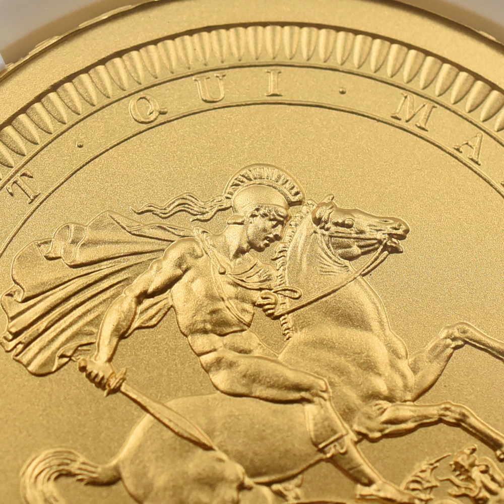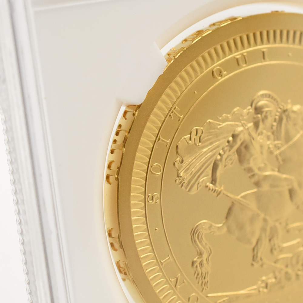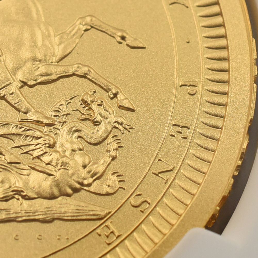 2022年9月8日のエリザベス2世の崩御に際して英国王位を継承した新国王チャールズ3世。「偉大なる彫刻家コレクション」の第4弾「ペティションクラウン」は、新国王を迎えたばかりの英国貨幣界が、モダンコイン屈指の人気コインシリーズの最新作として世に贈り、絶賛されました。それに続いてこの度解禁されることとなった第5弾は、ワイオンと並んで19世紀初頭の英国貨幣界を牽引した偉大なる彫刻家、ベネデット・ピストゥルッチ(1783-1855)の最高傑作「聖ジョージの竜退治」に捧げられます。ナポレオン戦争後の混乱の中、底知れぬ才能を秘めたこのイタリア人芸術家は、当時のロイヤルミント主任の招きに応じてイングランドに移り住み、そこを終生の地としました。ピストゥルッチの卓越した技量は当時のロンドンの上流階級の顧客層の愛顧を得て広まり、世に出たばかりのワイオンの職人技と双璧を成すほどに高く評価されていました。しかし二者の作風そのものは比較できない程に異なるものであり、また個性的でもありました。偉大なるコイン彫刻家一族の末裔として世に出たワイオンは生まれながらの職人肌の彫刻家であり、その仕事は非常に着実で安定していたと言われています。一方、ピストゥルッチはと言いますと、どちらかと言うと天才型の芸術家で、閃きに満ちた底光りするような強烈な作風を特徴としていました。ピストゥルッチが「聖ジョージの竜退治」の意匠を創造した頃の英国社会は、未だナポレオン戦争後の経済的荒廃から完全に脱却できていなかったものの、ロイヤルミントを中心とする英国貨幣界は金本位制を主軸とする新たな貨幣改革を推進する兆しを見せ始めていました。そのような社会背景の下に、一連の新たな貨幣の発行が急がれましたが、それらの新貨幣のデザインの一つとして採用されたのがこのピストゥルッチの「聖ジョージの竜退治」でした。古代ローマ時代の伝説の聖人ゲオルギウスの竜退治の場面を描くこの意匠は、古今東西の傑作コインの主題の中でも驚異的な人気を誇るものであり、同コレクションの第5弾として相応しいものであると言えます。また、ウィリアム・ワイオンとトマス・サイモンに続いて、ベネデット・ピストゥルッチの作品が選定されたことによって、歴史的コインコレクションとしての意義を強調しています。槍で悪の象徴であるドラゴンを退治する馬上の聖人の颯爽たる姿を、英国君主の仮の姿と見なすことも可能です。当復刻版の表面には、2023年5月6日に戴冠式を挙行したチャールズ3世の様式感溢れる「公式第1コイン肖像」が描かれています。コイン表裏に英国君主の威厳を掲げる当コインは、今日まで途切れることなく脈々と受け継がれてきた英国王室の未来永劫の安泰を象徴する新時代の傑作であると言えます。
