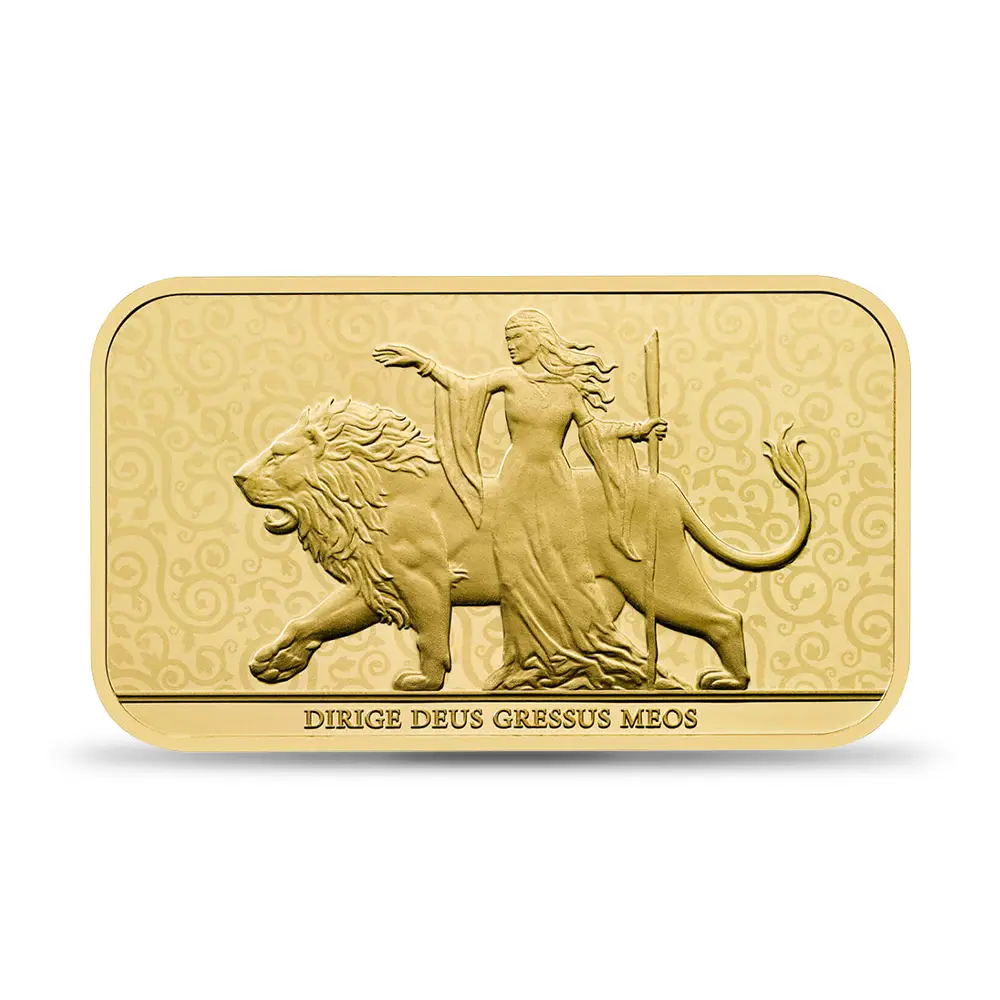 その実用性ゆえに世界的な注目を集める地金型コインの数々ですが、近年、連続的に発行されるようになったバータイプの地金型作品は、現代的なデザイン性と豊富なラインアップによって、細分化される英国の地金型作品の王道となりつつあります。今回ご紹介させていただく2024年度版「ウナとライオン」地金型バーの最新作は、エリザベス朝の文学的成果を漂わせなからも、いかにも21世紀的な斬新なデザインによって、この種の地金型作品の秀作としての地位を確立しています。また、当作品は、1839年のオリジナル「ウナとライオン」に対するオマージュとしての貴重な役割を果たすものでもあります。作家は、「エリザベス2世の第5公式コイン肖像」のデザインによって一世を風靡した、現代ロイヤルミント屈指の人気デザイナー、ジョディ・クラークです。フロント・サイドに描かれた意匠は、これまでに発表された同作品の数々のバリエーションとは描き方の点で完全に異なるものです。最も大きな違いは、ウナの唯一無二の親友であるライオンがウナの後ろに大きく描写されている点です。また、ウナの波打つ頭髪や衣装のドレープは女性美を強調しているように思われ、ライオンの男性美との絶妙な対比は必見に値します。英国の平和を象徴するとされる原作の「ウナとライオン」ですが、この地金型作品の解禁によって、英国のみならず全世界の理想的な近未来が約束されることでしょう。「ウナとライオン」の物語と精神性が英国貨幣界において再び蘇ったことを心から喜ばずにはいられません。