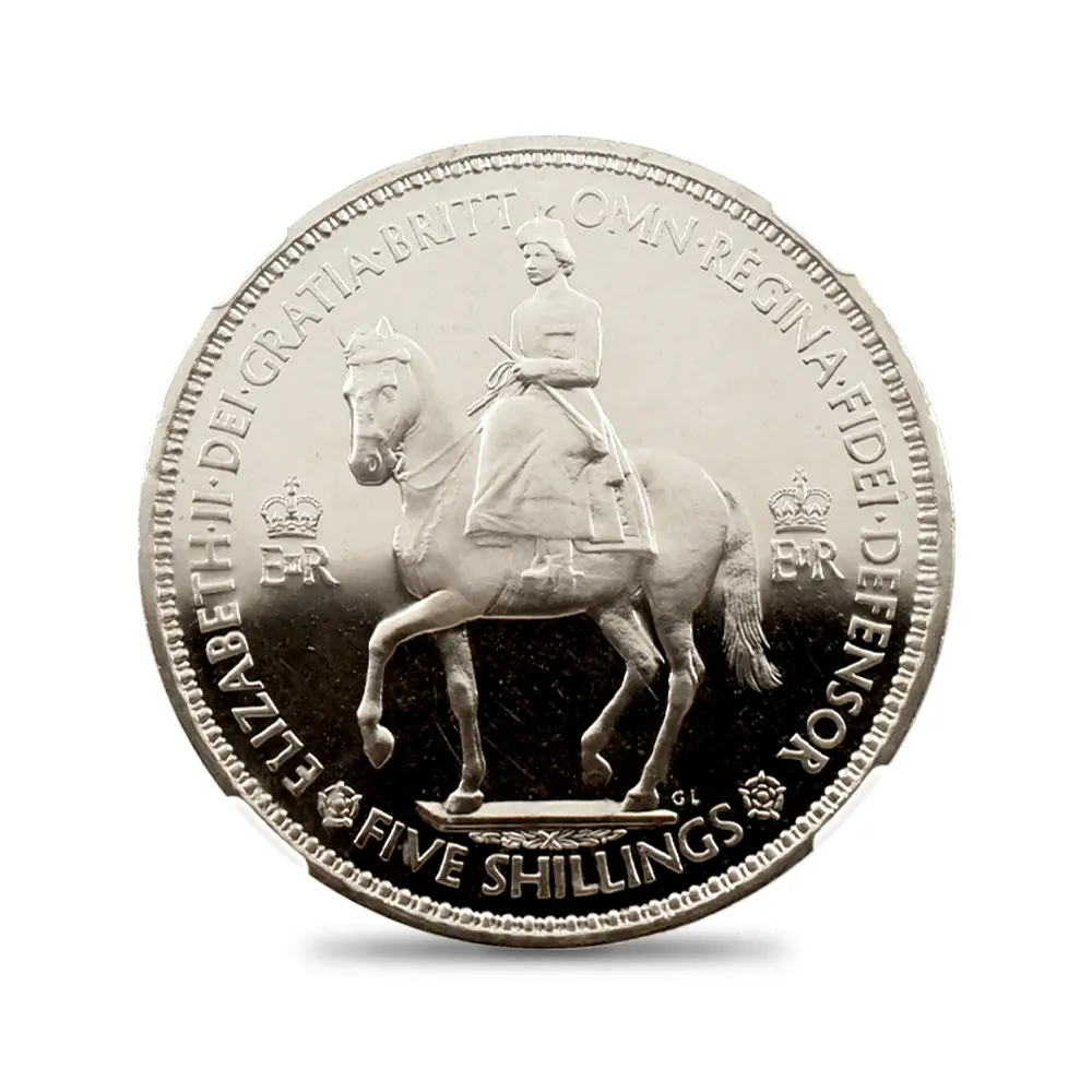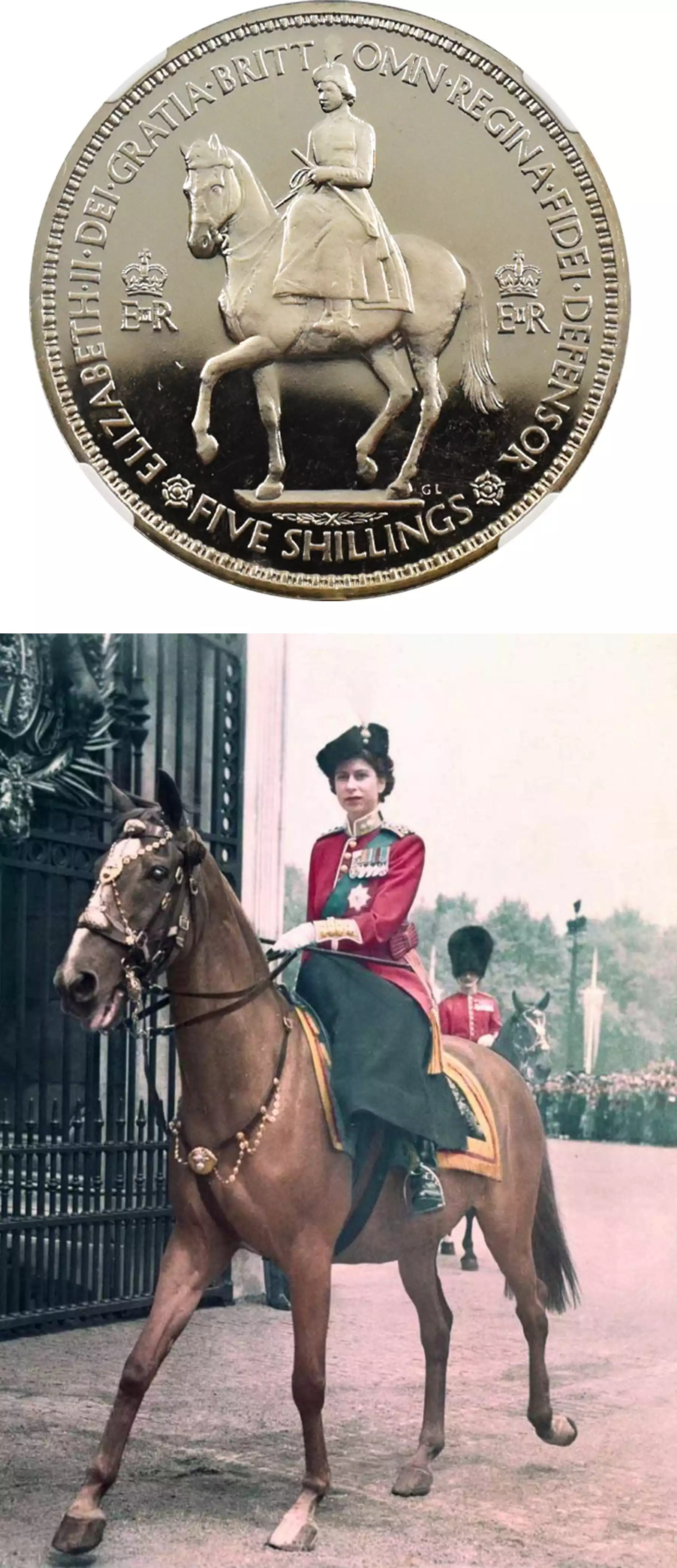 ©トゥルーピング・ザ・カラー式典でのエリザベス2世 1951 pinterest 1953年、エリザベス2世の世紀の戴冠式の年に発行された当5シリング貨は、若き日の女王の気品と今は無き戴冠式当時の古き良き英国の面影をノスタルジックに表現する最も古い時代に属するモダンコインの佳作です。