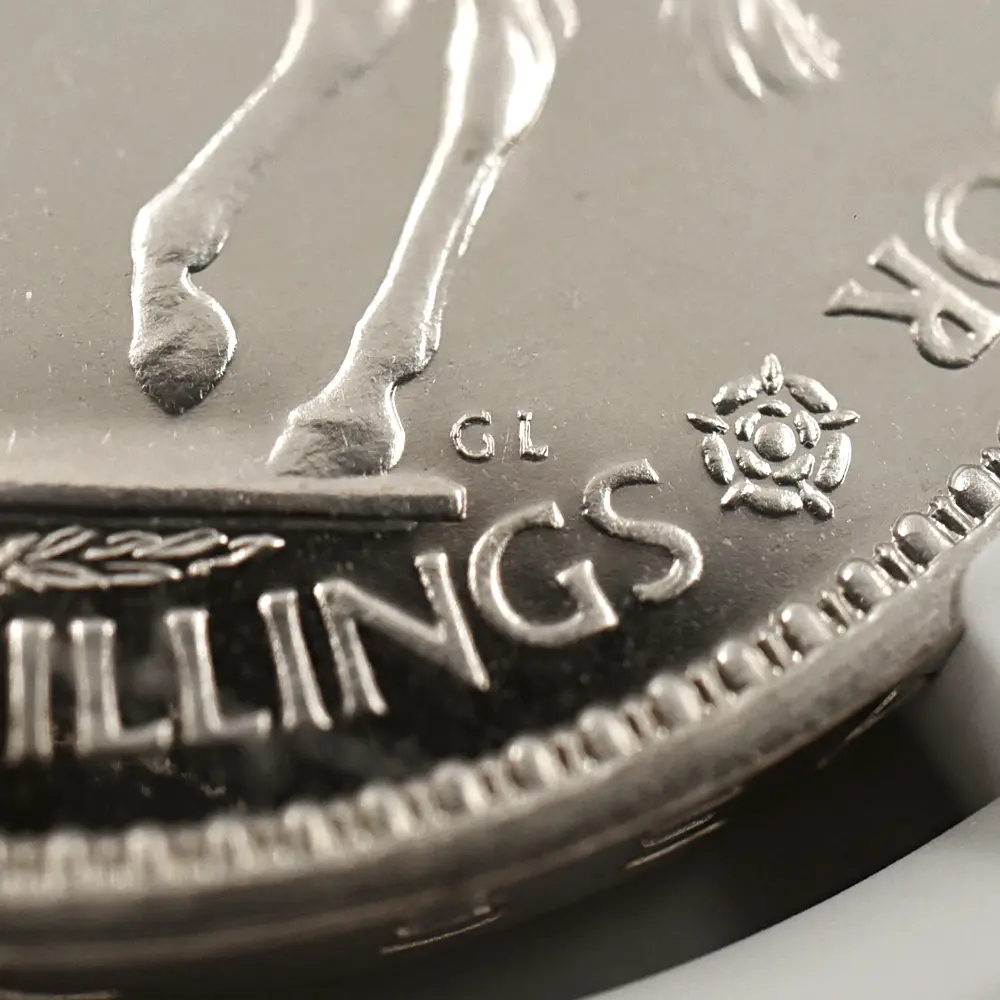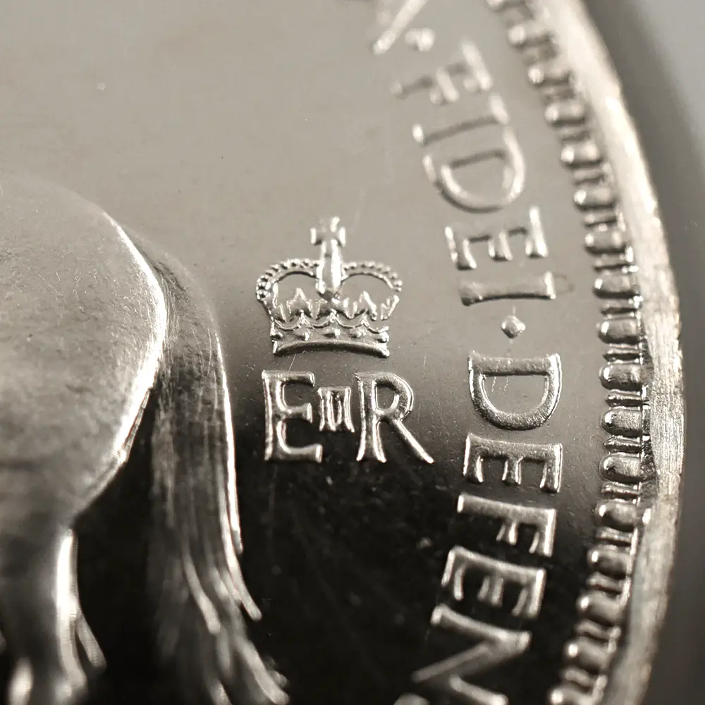 コイン表面には戴冠式当時若干27歳であった自身の愛馬ウィンストンに乗ずる制服姿のエリザベス2世が写実的に描かれています。英国屈指の馬主としても名高い女王陛下ですが、毎年6月中旬に開催される王室主催の競馬のイベント「ロイヤル・アスコット」の主催者として帽子の花が咲き乱れる場内に登場され、この夏の風物詩において一輪の薔薇の如く優美な存在感と共に自身の所有する馬に見入る姿をお見かけすることがあります。