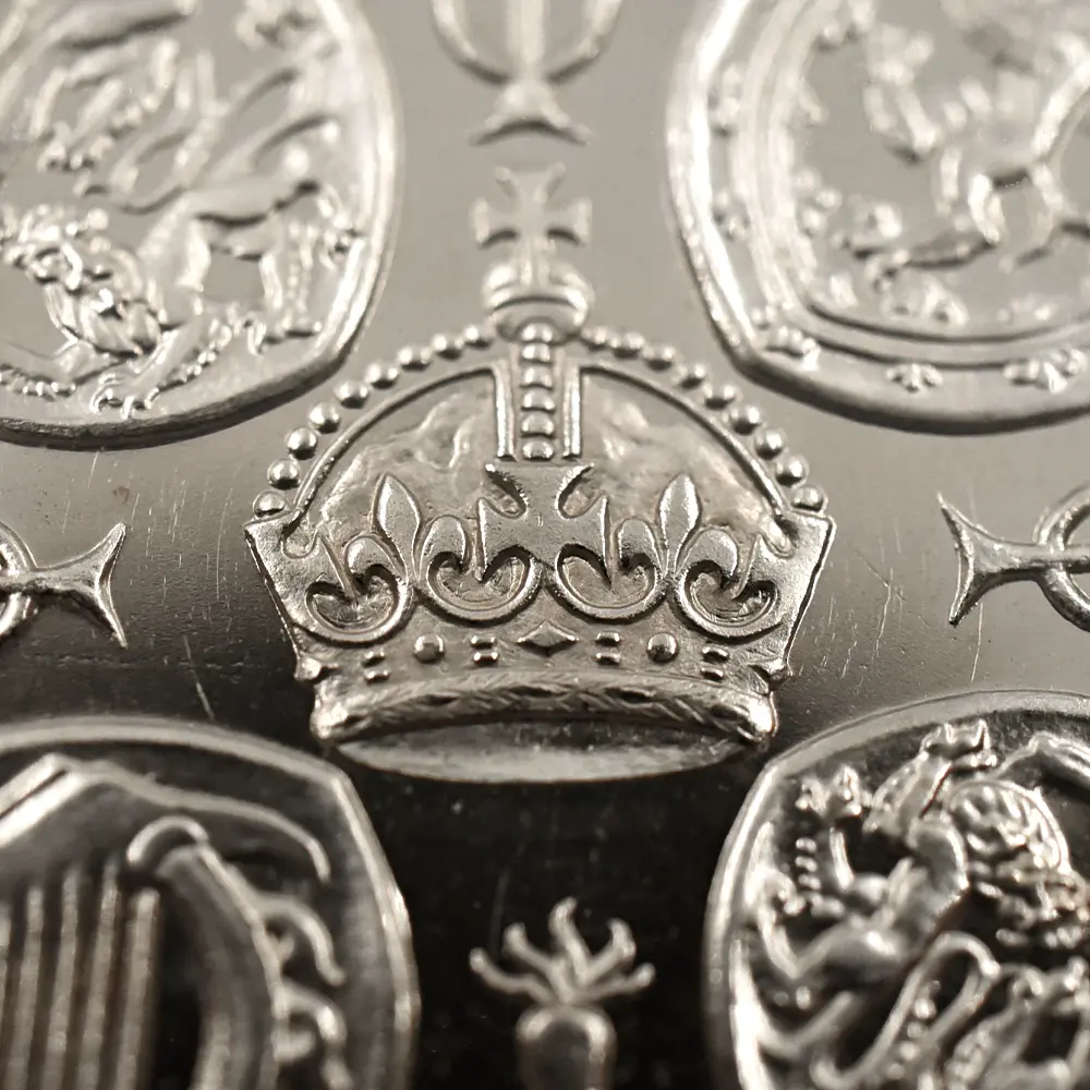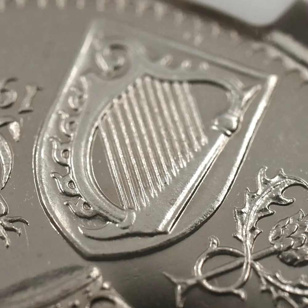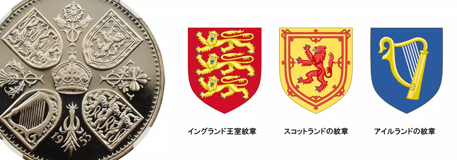 そしてコイン裏面にはイギリス連邦に属する4カ国の国章と共に、それぞれの国家を象徴する花が描かれ、中央に英国王位を示す王冠、さらにコイン下部には戴冠式の年を示す1953の数字が刻まれています。新女王の戴冠式を寿ぐ祝祭感で満たされた当5シリング貨は、その後半世紀以上にわたって英国民を導き、齢を重ねて存在感を増す英国女王の若き日の栄光の軌跡を永遠に刻むアニバーサリーコインの極致です。