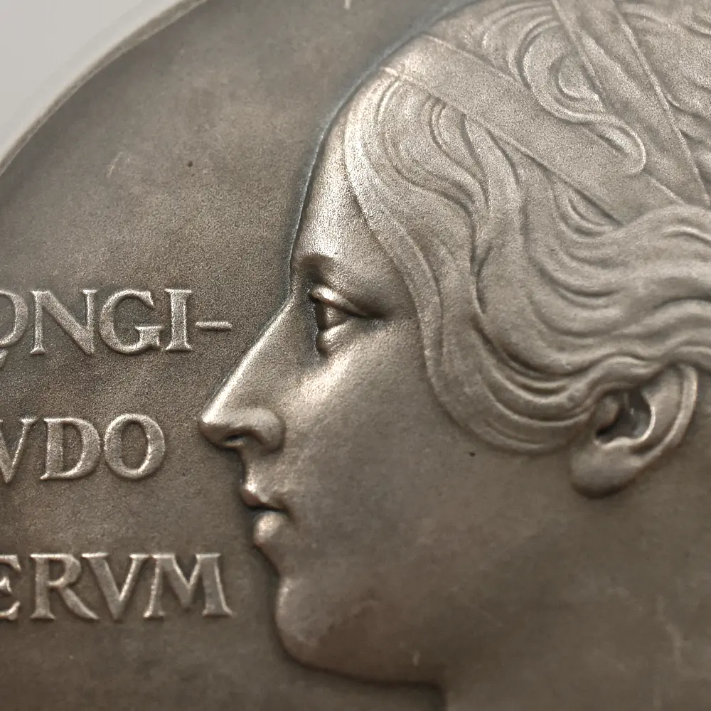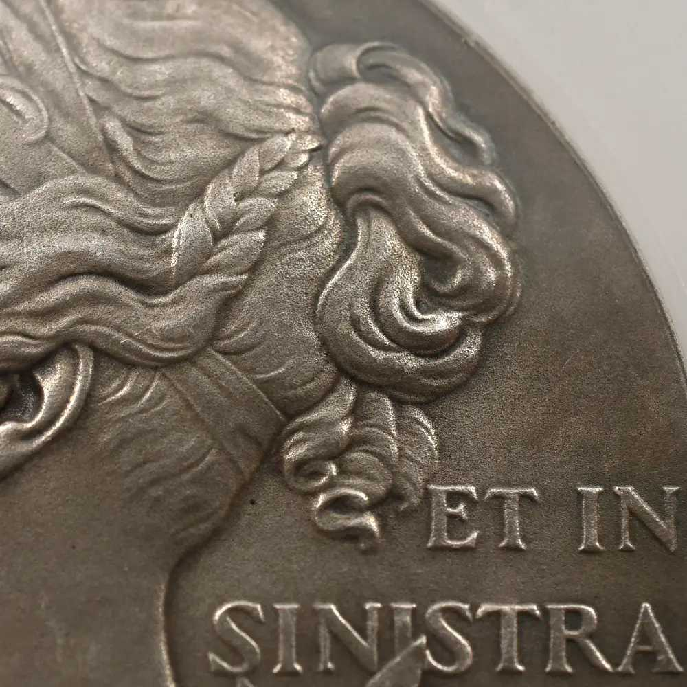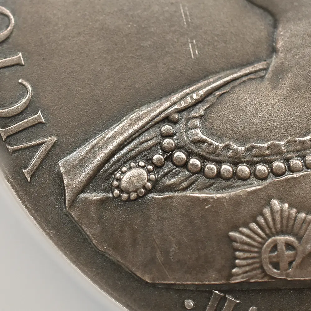 「英国人にとって女王とは何か」の問いに対する最良の答えとなるのが、ヴィクトリア女王の在位60周年記念、つまりダイアモンド・ジュビリーの年に発行されたこの美しいシルバー・メダルではないでしょうか。63年7か月の長きにわたって英国の女王であり続けたヴィクトリア女王の存在は、その在位期間ゆえに英国人に君主としての女王の一般的な印象を与え、長い年月を経て固定化されたとみて間違いないでしょう。これによって一般的に女王と言えば高齢の女性のイメージが強くなり、特にヴィクトリア女王の場合は肖像写真その他の影響から厳格で気難しい女帝のイメージが付きまといます。しかしそこには同時に国母としての性格が強調され、気高く近寄りがたい存在ながらもすべてを包み込む母性を兼ねた数々の肖像が生み出されることになります。1887年の在位50周年からわずか6年後の1893年に当時の代表的なコイン・デザイナーであったサー・トーマス・ブロックが創造した通称「ヴェールド・ヘッド」と呼ばれる女王のポートレートは、頭上のティアラから肩にかけて流れるようにしなやかなヴェールを着用する晩年のヴィクトリア女王の孤高の表情を表現力豊かに描き出した傑作です。なぜその4年後に控えていた在位60周年「ダイアモンド・ジュビリー」を待たずしてこの名作が誕生したかについては諸説ありですが、恐らくは既に高齢に達していた女王自身が60周年を迎えること自体を想定していなかったためではないでしょうか。そしてそれはその後見事に覆され、女王78歳の年、1897年には無事ダイアモンド・ジュビリーを迎えることになります。その例外的な長期在位を記念して生み出されたのがこの傑作ダイアモンド・ジュビリー・シルバー・メダルに他なりません。晩年の女王を描くメダル表面の肖像は、その4年前にリリースされた「ヴェールド・ヘッド」のデザインを忠実に踏襲しています。そして裏面に刻まれた「ヤング・ヘッド」と呼ばれる若き日の女王の肖像は、即位当時18歳であった女王の最初のコイン・ポートレートをインスピレーションの源とするものです。これら2種のポートレートを表裏に再現し、ダイアモンド・ジュビリーに相応しい記念メダルのデザインへの昇華は、ヴィクトリア朝後期の英国を代表するメダル制作家、ジョージ・ウィリアム・デ・ソールズの類まれなる芸術的手腕の賜物です。表面のラテン語碑文は「1897年6月20日にヴィクトリアは幸福にも自身の在位60周年を完結させました」の意で、具体的な日付と共に女王の超然の在位に祝意を捧げています。そして裏面の碑文は「その右手は在位の日数を握りしめ、左手は栄光を掲げる」という内容を意味し、英国を牽引し、インドの女帝の称号までを手中に収めた稀代の帝王の前人未到の偉業を見事に表現しています。白銀の輝きと共に21世紀に伝授されるヴィクトリア期の正真正銘のアンティークであるこの名作メダルは、今後更なる価格推移を実現するであろう実物資産であると同時に、英国史の最盛期であった大英帝国時代の頂点を象徴する歴史的文化遺産としての付加価値を併せ持ちます。