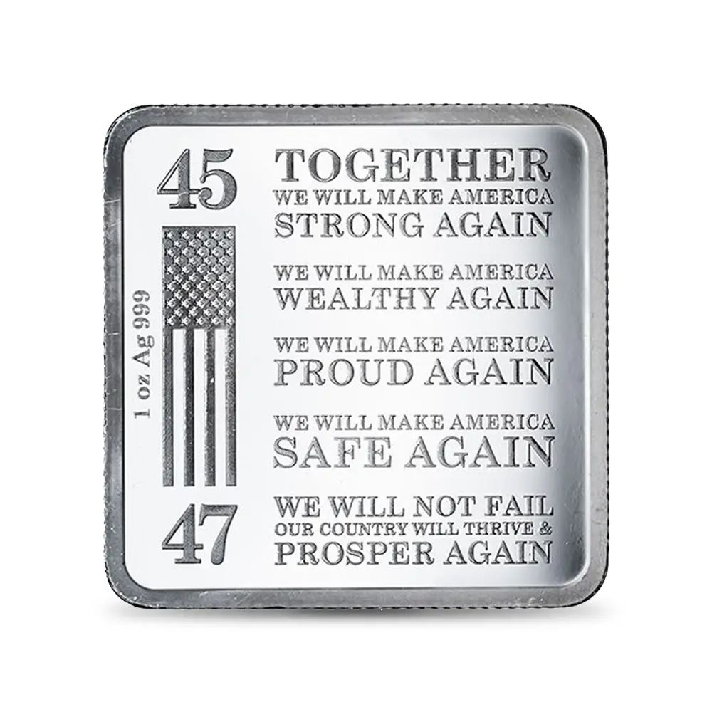 2024年は、アメリカ合衆国前大統領ドナルド・トランプ氏にとって生涯忘れ得ぬ特別な一年となるに違いありません。同年7月13日にペンシルバニア州バトラー近郊で開催された2024年度大統領選挙のための選挙集会に出席していたトランプ氏が、銃撃されたものの一命を取り留めたとの速報が全世界を駆け抜けたのは日本時間の14日のことでした。事件の犯人であるトーマス・マシュー・クルックスが演説台から約120メートル離れたビルの屋上からライフルで8発発砲し、聴衆一人を死亡させた他、トランプ氏を含む3人を負傷させ、シークレットサービスの対襲撃部隊の狙撃手によって射殺されました。トランプ氏は銃撃の直後、負傷したとみられる頭部を押さえて演説台の後方に身を隠し、シークレットサービスのエージェントに守られながら退場しました。その瞬間を捉えたAP通信の報道カメラマン、エヴァン・ヴッチが撮影した写真は、後にSNS上で拡散され、国際的な注目を集めました。その時に何かを思い出したかのように急に立ち上がったトランプ氏が、拳を振り上げて「Fight=戦え」と繰り返し叫びながら不屈の精神を露にした瞬間は、世界にとっても決して忘れ得ぬ強烈なメッセージとなったことでしょう。トランプ氏自身は右耳に軽傷を負ったものの大事には至らず、現地時間の同日午後9時30分ごろには病院を退院したとのことでした。翌15日には共和党全国大会に右耳全体を包帯で覆って出席し、健在ぶりをアピールしました。トランプ氏はまたかねてより2024年の大統領選への出馬を示唆しており、早くも2022年11月15日には次期大統領選挙への立候補を正式に表明しました。そして2024年11月初旬に山場を迎えた大統領選挙の開票の結果、対立候補のカマラ・ハリス前副大統領への票を押さえて第一位となり、第47代大統領としてホワイトハウスに帰り咲くことが確定しました。今回ご紹介の作品は、ドナルド・トランプ氏のカリスマ的魅力満載のデザインを描く地金型1オンス銀の延べ板です。疾走する機関車の上には、アメリカ合衆国の国旗である星条旗を掲げるトランプ氏の全体像が描かれており、コミカルな描き方が特徴的でありながらも国家を支える中心人物としての氏の権威を感じさせるものです。デザイン部の下部には「トランプ・トレイン」の文言が見られ、観る者にユーモアと共に強い印象を与えることでしょう。また機関車の側面には「アメリカを再び強国にしよう」の一文が浮かび上がっていますが、今後、氏が果たすはずの公約として注目に値します。さらに裏面の左側には、第45代、第47代大統領としてアメリカの政局を担うことになったトランプ氏への祝意として、45と47の数字が刻まれており、星条旗がそれら二つの数字を繋いでいます。そして中央から右側にかけての広い空白には、トランプ氏が掲げる公約を含めたスローガンの数々が刻まれています。「みんなでアメリカを再び強国にしよう」に続き、「再びアメリカを裕福にしよう」、「再びアメリカの誇りを取り戻そう」、「再びアメリカの安全を取り戻そう」、「決して負けずに再びアメリカに繁栄をもたらそう」と4つのスローガンが刻まれています。「アメリカ・ファースト」を掲げ、世界に向けての国家の強化を重要視するトランプ氏ですが、その強硬な政治的姿勢が反映された当地金型作品は、氏の精神性とホスピタリティーを具象化する新しいタイプの地金型作品に他なりません。