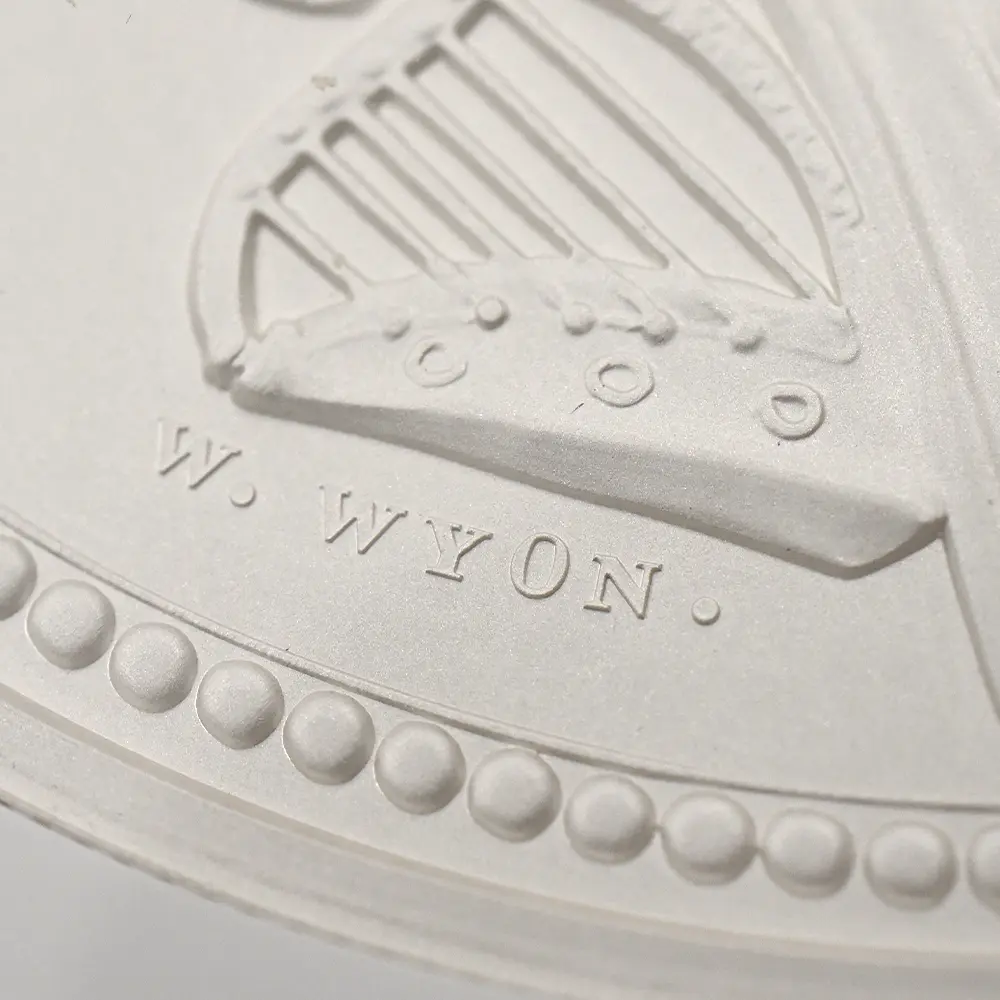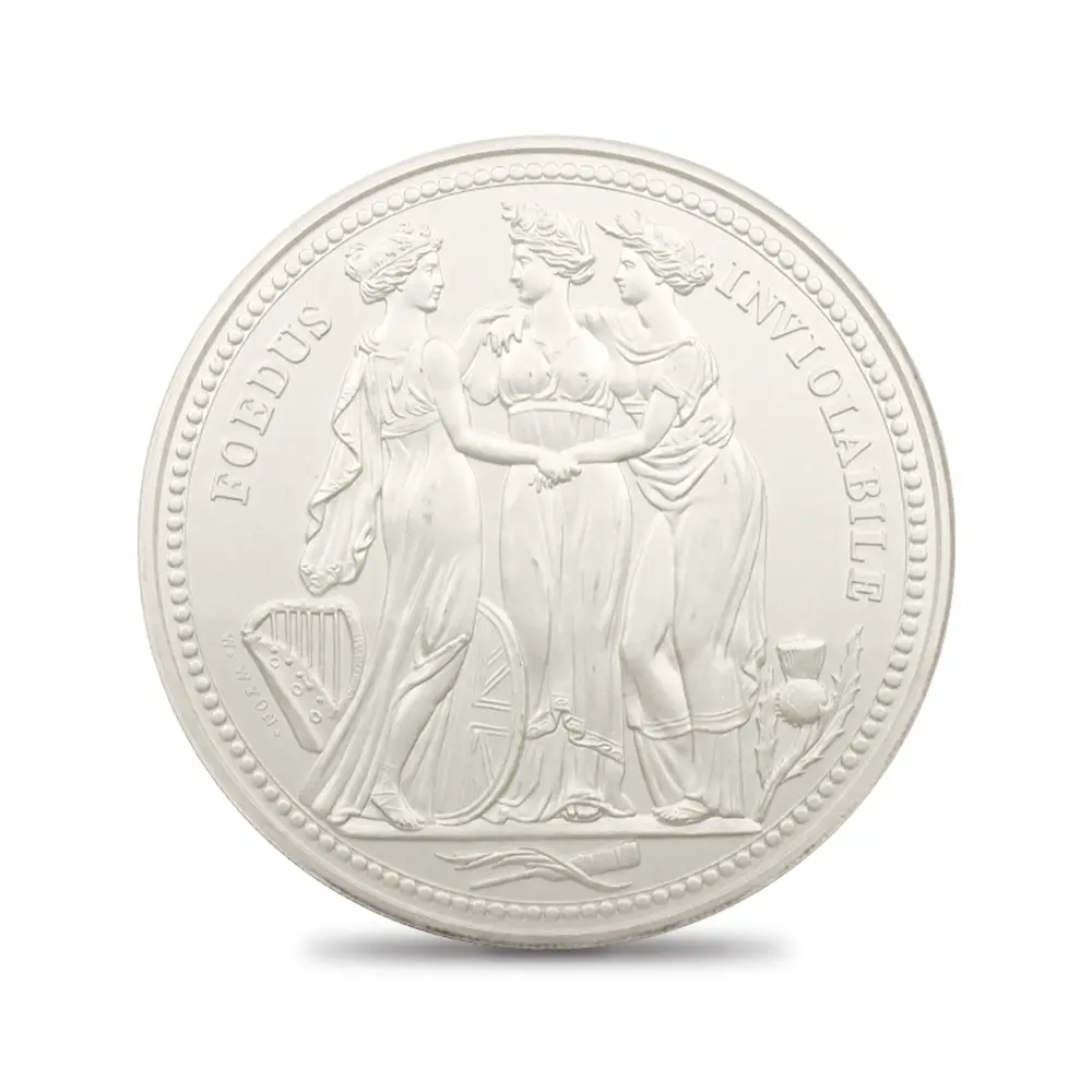 ナポレオン戦争後の英国と同盟各国との協調関係と恒久的な平和を絵画的に表現したその優れた意匠は、ジョージ王朝末期からヴィクトリア朝初期の英国において一世を風靡した芸術様式として知られる新古典様式のコイン上における一典型として、貨幣学史上において特筆されるべき内容を持つものです。同様式の粋を極めたワイオンならではの魅力あふれる作風は、英国コインの永遠の主題として、21世紀の今日まで脈々と受け継がれて来ました。