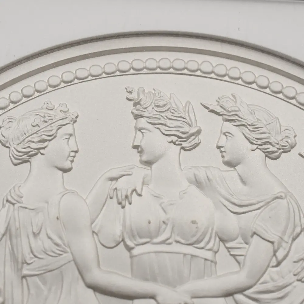 ギリシャ神話の最高神ゼウスを父とする3人の娘達を描くワイオン版「スリーグレーセス」は、19世紀前半に最盛期を迎えていたイタリアの大彫刻家アントニオ・カノーヴァの一連の彫刻群からインスピレーションを得て制作された貨幣芸術の精華です。立体性を表現手段とする彫刻から着想を得ているにもかかわらず、平面的なコイン上に対象を描き立体感を表出するワイオンならではの手法は、この作品上において遺憾なく発揮されていると言えます。