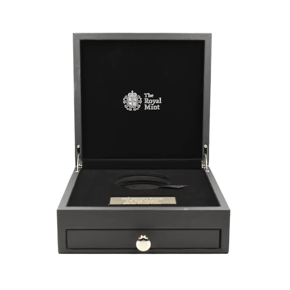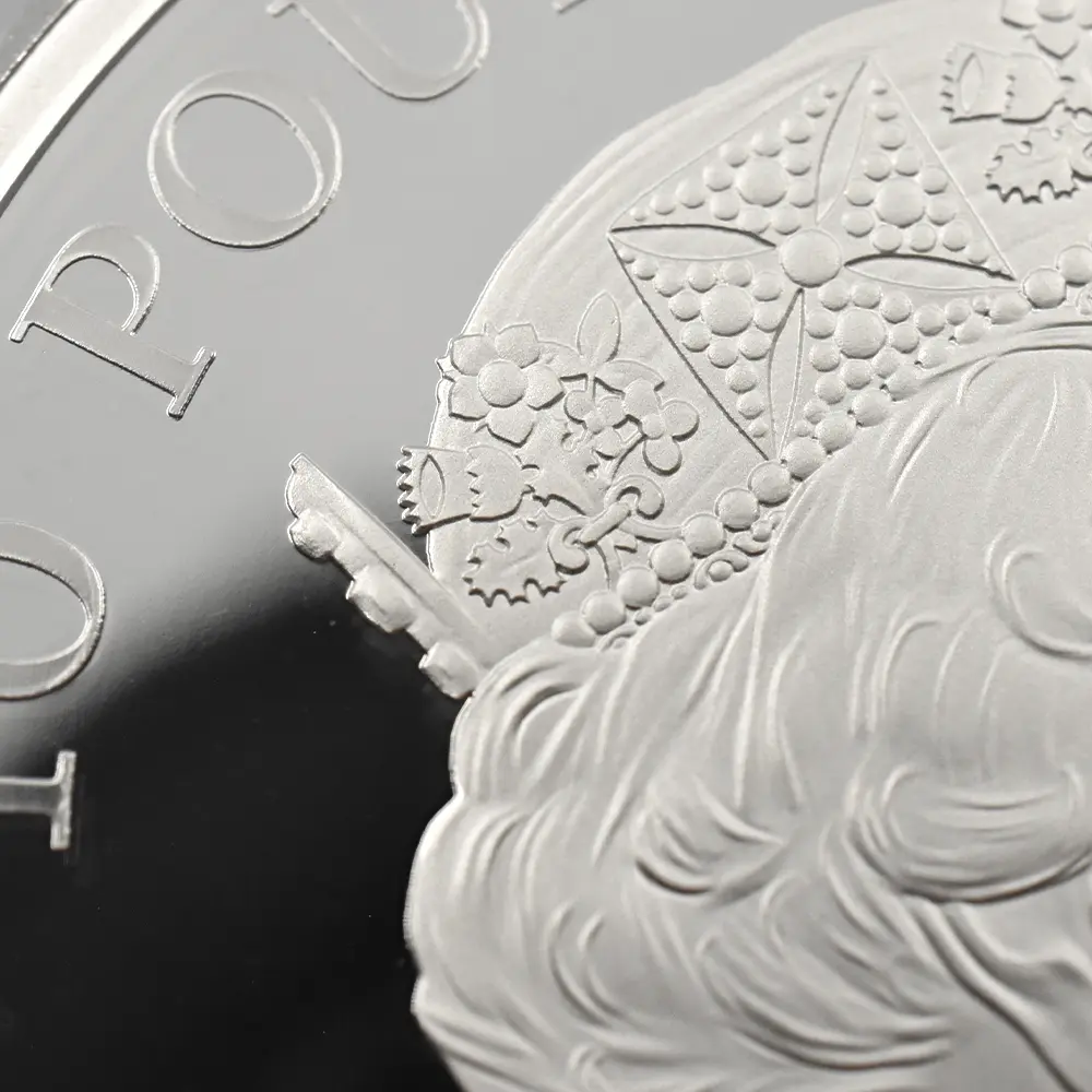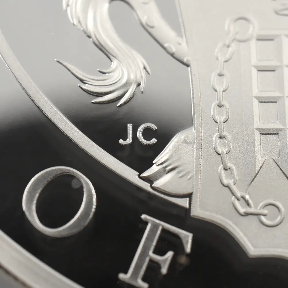 美しくも理想化された伝説上の動物「ビューフォートのイェール」は、クイーンズビースト・シリーズの中に含まれる架空の動物群を代表する存在です。野生のシカやヤギのような角を持つこの神話上の動物は、これまでにも多くの造形芸術家のインスピレーションを刺激し、創作意欲を掻き立てて来ました。それらの作品が描くイェール像は、優美さと気品を感じさせると同時に、生命力と決断力を想起させる外観を特徴とするものが主流でした。具体的には、頭上の角がそれらを暗示しているとされ、特に中世期に描かれた絵画においては、あらゆる方向に向かって伸びる多種多様な形状の角が描かれていました。知性を象徴する角とは対照的に、その口元には猪の牙のような物も同時に描かれることもあり、この神聖な動物の獣性を包み隠さず表現していました。この魅惑的な空想上の動物は、薔薇戦争を終結させ、イングランドにおける中世期の終焉を決定づけた稀代の支配者、ヘンリー7世の母マーガレット・ビューフォートの名に因んで「ビューフォートのイェール」と命名されました。螺旋形の角を持つユニークなイェールが胸に掲げる盾には、ヘンリー7世を象徴する落し格子が描かれており、在りし日のテューダー朝の栄華を偲ばせます。そしてそのすぐ上には戦塵の巷を駆け巡り、遂に天下を統一するに至ったヘンリー7世の正統な王位を象徴する大型の宝冠が光り輝いています。伝説上の動物であるこの「ビューフォートのイェール」が同コレクション全体に神秘的な性格を与えていることは間違いなく、人間の想像力の産物であるこの動物の存在がいかに当シリーズを魅力的なものにしているかを思い知らされます。500有余年の時を経て英国モダンコインのデザインとして蘇ったイェールを描く当コインは、中世から現王室に至る英国王室史の変遷を象徴する十大守護獣を扱う「クイーンズビースト・シリーズ」ならではの面白さを凝縮した単独の名作として、今後、長きにわたって伝説として語り継がれて行くことでしょう。