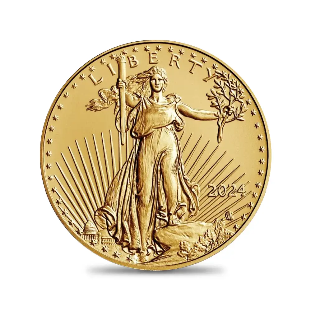 ©ドナルド・トランプ(ホワイトハウス) 2024年11月上旬、アメリカ大統領選挙の開票が進められていましたが、カマラ・ハリス副大統領との接戦が繰り広げられた結果、ドナルド・トランプ前大統領が第47代合衆国大統領として再び選出されることが確定しました。同氏がアメリカ合衆国の大統領として、連続した任期ではなく再選によって二度大統領の地位に帰り咲いたことは19世紀のグロバー・クリーブランド以来の快挙とされ、史上まだ二人を数えるに過ぎないとのことです。真のリーダーとしての活躍が期待される中での同氏の選出は、アメリカ国民の同氏に対する期待の大きさの表れではないかと思われます。2024年はトランプ氏にとっては激動の年であったことでしょうが、同氏の大統領再選出を予期させる奇跡的な出来事が事前に起こっていたことも事実です。7月13日、ペンシルバニア州バトラーにて大統領選のための集会に参加していたトランプ氏は、当時20歳の犯人にライフルで銃撃され、耳を負傷するという事件が起こり世間を騒がせたことは記憶に新しいことです。犯人は即座にシークレットサービスの狙撃手によって射殺されましたが、死者1人と、トランプ氏を含む8人の負傷が確認されるや否や世界に激震が走りました。会場を後にして病院へと移送される際に、トランプ氏は思わぬ行動に出ます。拳を天空に突き上げ「Fight=戦え」の一語を何度も叫んで自身の不屈の精神をアピールしようとしていました。シークレットサービスの隊員が制しても止めようとしないトランプ氏の姿に、近い将来の真のアメリカのリーダー像を重ねて見た人も少なくなかったことでしょう。この事件を機に、強運の持ち主としての新しいドナルド・トランプ像が確立されることになります。歯に衣着せぬ発言によって時に賛否両論の嵐を巻き起こすことも多々あった過去のトランプ氏ですが、今後は世界の情勢を鑑みて、強力なリーダーシップを発揮することでしょう。今回ご紹介のコインは、過去にアメリカ合衆国が発行するコイン上に描かれたデザインとしては最も人気の高い二つのシンボル、アメリカンイーグルとリバティと呼ばれて親しまれている自由の女神を掲げる25ドル1/2オンス金貨です。これらの意匠はアメリカコインのデザインとしては古典の部類に入るものですが、時を経てなおも人々に愛され、21世紀の今日に継承されています。今回の2024年度版において特筆すべきは、鑑定を受けたコインのみに付されるスラブケースの内側に張られたラベルにトランプ氏の写真がプリントされている点です。同氏の2024年度大統領選挙での快挙は政治の世界に与える影響のみならず、今やアメリカ貨幣界にとっても大きなインパクトとなりつつあります。コイン表裏にアメリカコインを代表する表象が掲げられた当25ドル金貨にトランプ氏の肖像写真が付されるということから、今回の当選がいかに国家的慶事と見なされているかを窺い知ることができます。改めてトランプ氏の歴史的な勝利に祝意を捧げたいと思わずにはいられません。
