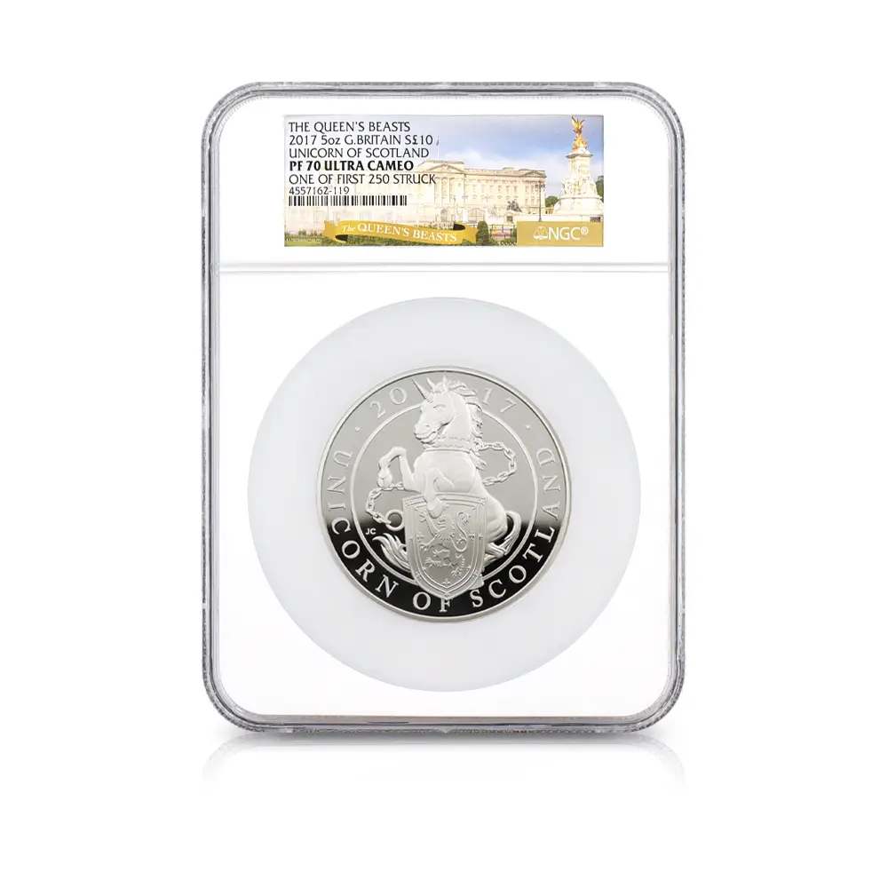 2017 エリザベス2世 クイーンズビースト スコットランドのユニコーン 10ポンド5オンス 銀貨 ファースト 250 ストラック NGC PF70UC