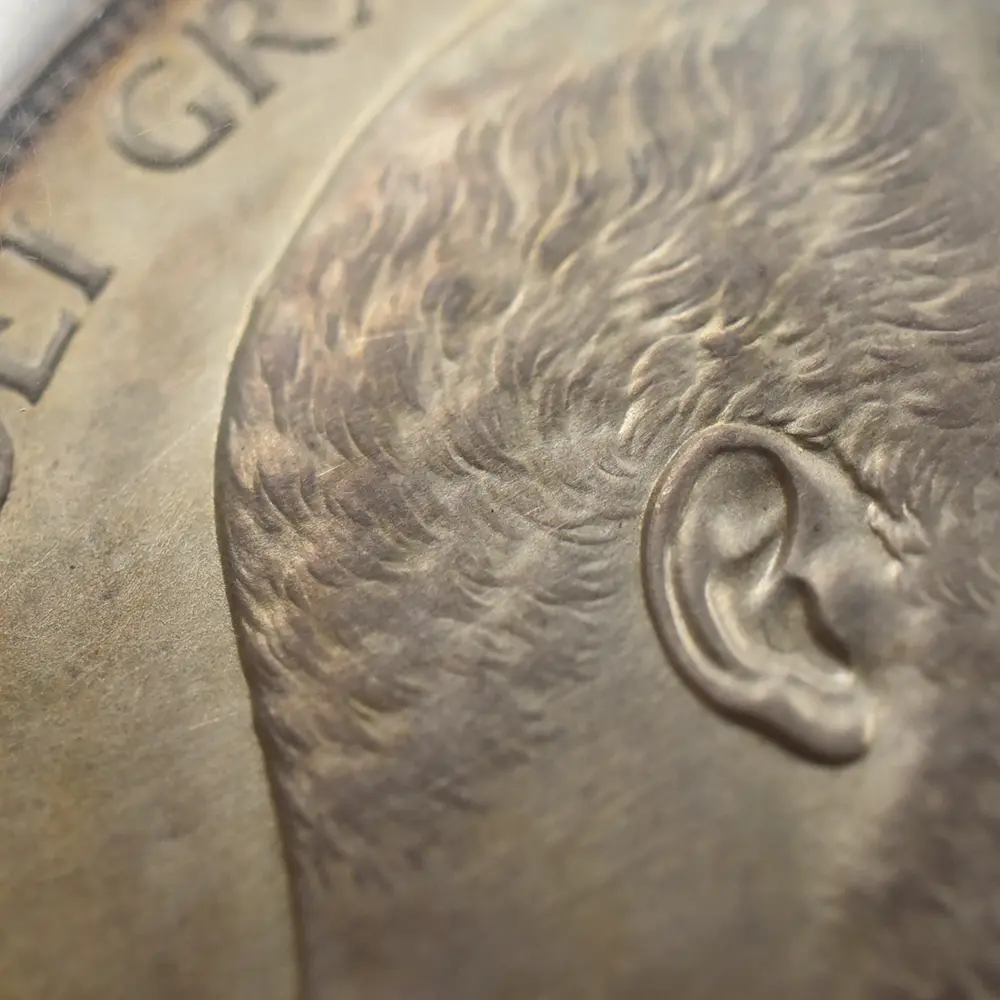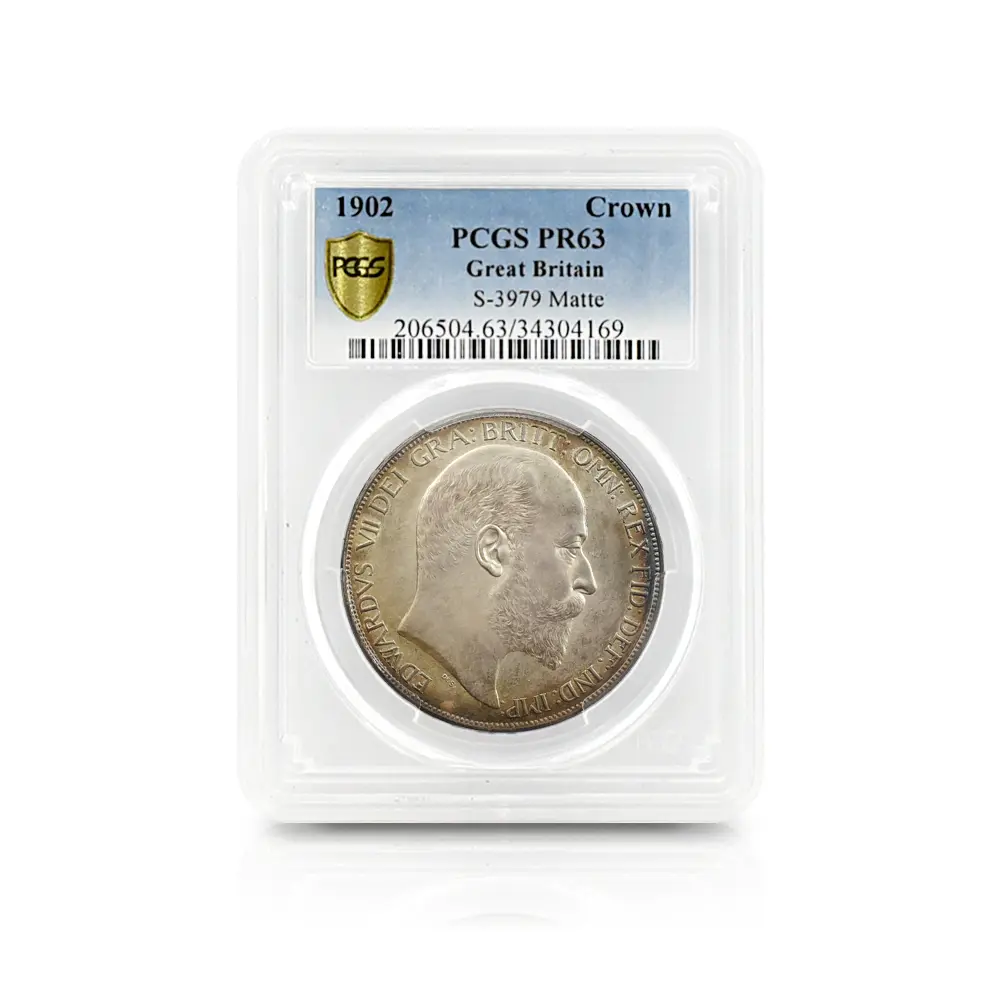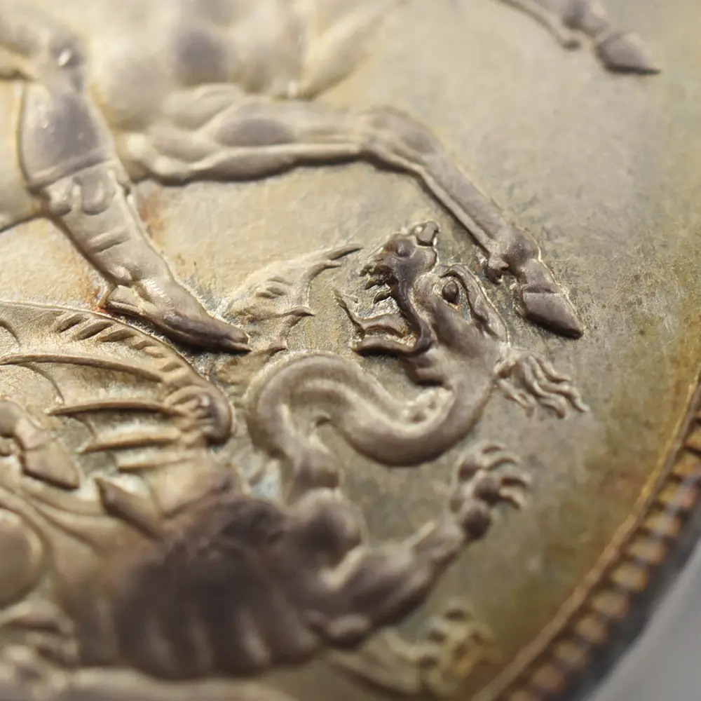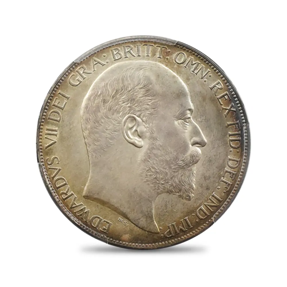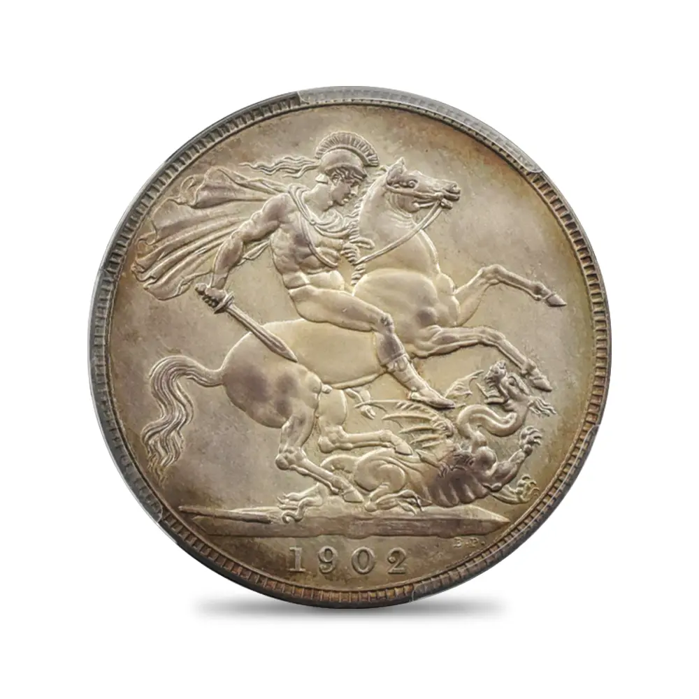 1901年、ヴィクトリア女王の崩御に際して英国王位並びにインド皇帝位を推戴された新国王エドワード7世。翌1902年にロンドンのウェストミンスター寺院にて挙行された王の戴冠式は、ヨーロッパ各国の王室を代表する名だたる君主の参列によって英国史上最後の壮麗豪華な儀式として行われ、20世紀初頭の英国史を華々しく飾りました。生涯を通じて英国内を始めヨーロッパ各国への訪問を遂行し、歴史上最も頻繁に行幸を重ねた英国君主として知られているエドワード7世。そんな国王は一人の人間として人生を謳歌した人物としても歴史上に名を残しています。恋多き人であったことでもよく知られているエドワード7世は、当時フランス社交界の華と謳われた一世一代の名歌手にして絶世の美貌の持ち主であったシャンソン歌手ミスタンゲット(1873年-1956年)の熱烈なファンであることを公言していました。残念ながら実らぬうたかたの恋に終わってしまったようですが、フランス語を得意とする王が頻繁に花の都パリを訪問する真の理由はそこに在ったのかもしれません。今回ご紹介させていただくクラウン銀貨は、60歳を目前に控えて英国王位を継承した王の歴史的な戴冠式を記念して発行された記念貨です。壮年期の王の威厳のある風貌を浮かび上がらせる人物描写は見事の一語に尽き、当時のコイン制作技術の驚異的なレベルを誇示しています。自然な写実性を特徴とするその微笑ましい無冠のポートレートの周囲には、大英帝国君主としての王の権威を象徴する厳かなタイトルがラテン語にて記されています。裏面には19世紀前半の英国ロイヤルミントを代表するコイン彫刻の達人ベネデット・ピストゥルッチ(1783年-1855年)の芸術家人生の総決算と言っても過言では無い「聖ジョージの竜退治」の意匠が誇らしく刻まれています。悪を暗示するドラゴンを退治する馬上の騎士を描写するこのデザインほどに、コイン上に歴代英国王の権威を表す題材として相応しいものは他に見当たりません。当クラウン銀貨の最大の特徴として、淡い褐色を見せる両面のマットプルーフ仕上げが挙げられます。同じデザインによる通常のプルーフ仕上げのコインの総発行数が256,000枚であったことに対し、同マットプルーフ版のそれは15,000枚と極端に少なく、空前の希少価値を生んでいることは確かです。アンティークコインとして今年120歳を迎える当コインは、老大国英国の黄昏の時節であったエドワード朝の永遠の追憶に捧げられる歴史的大作に他なりません。