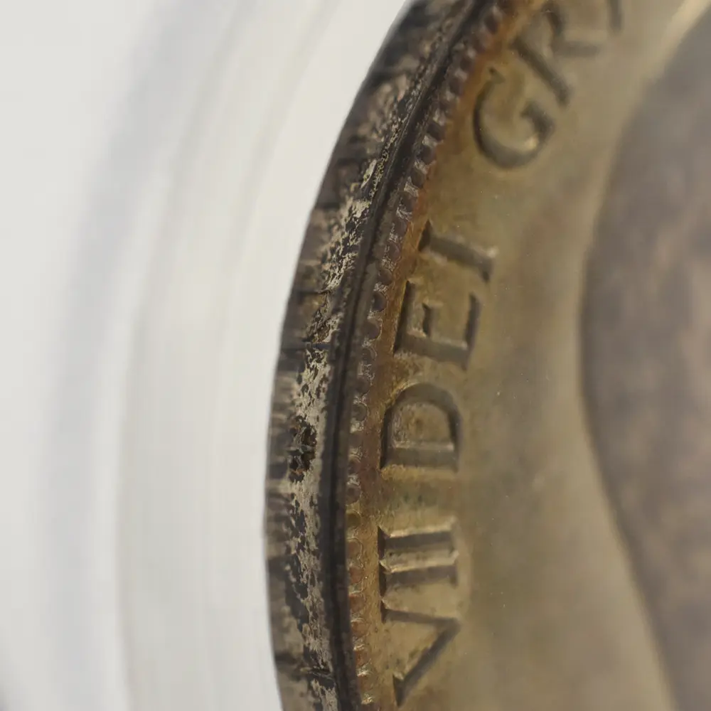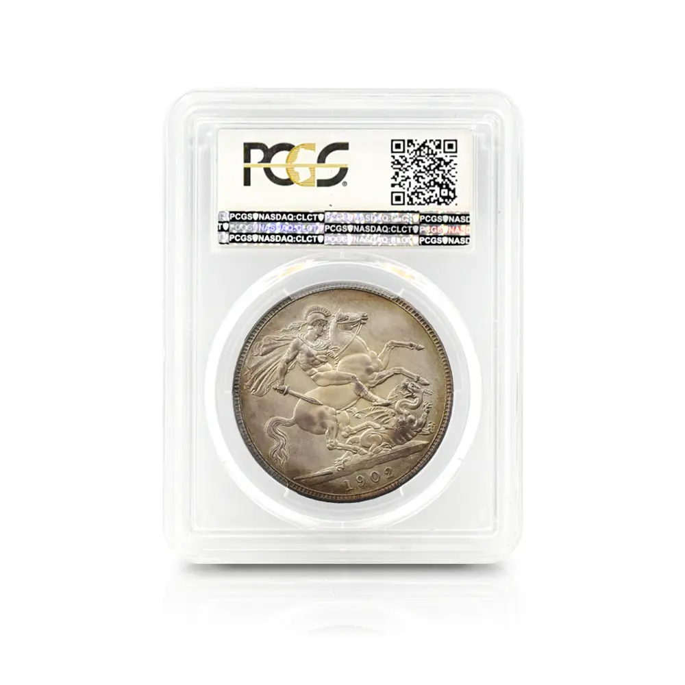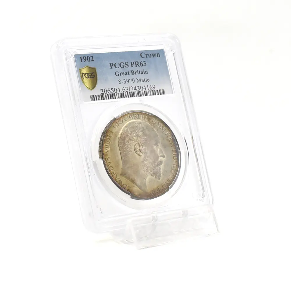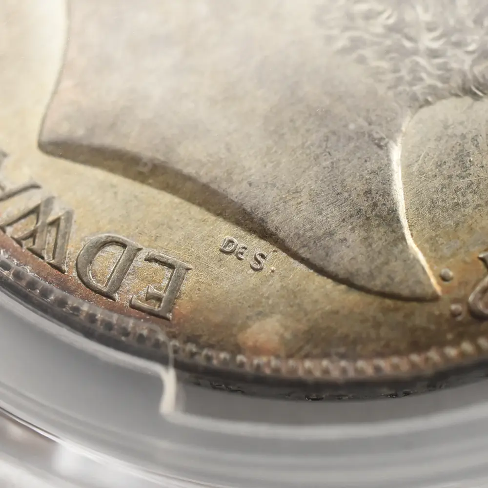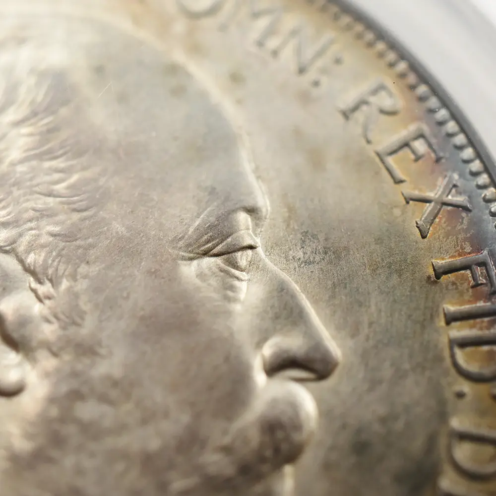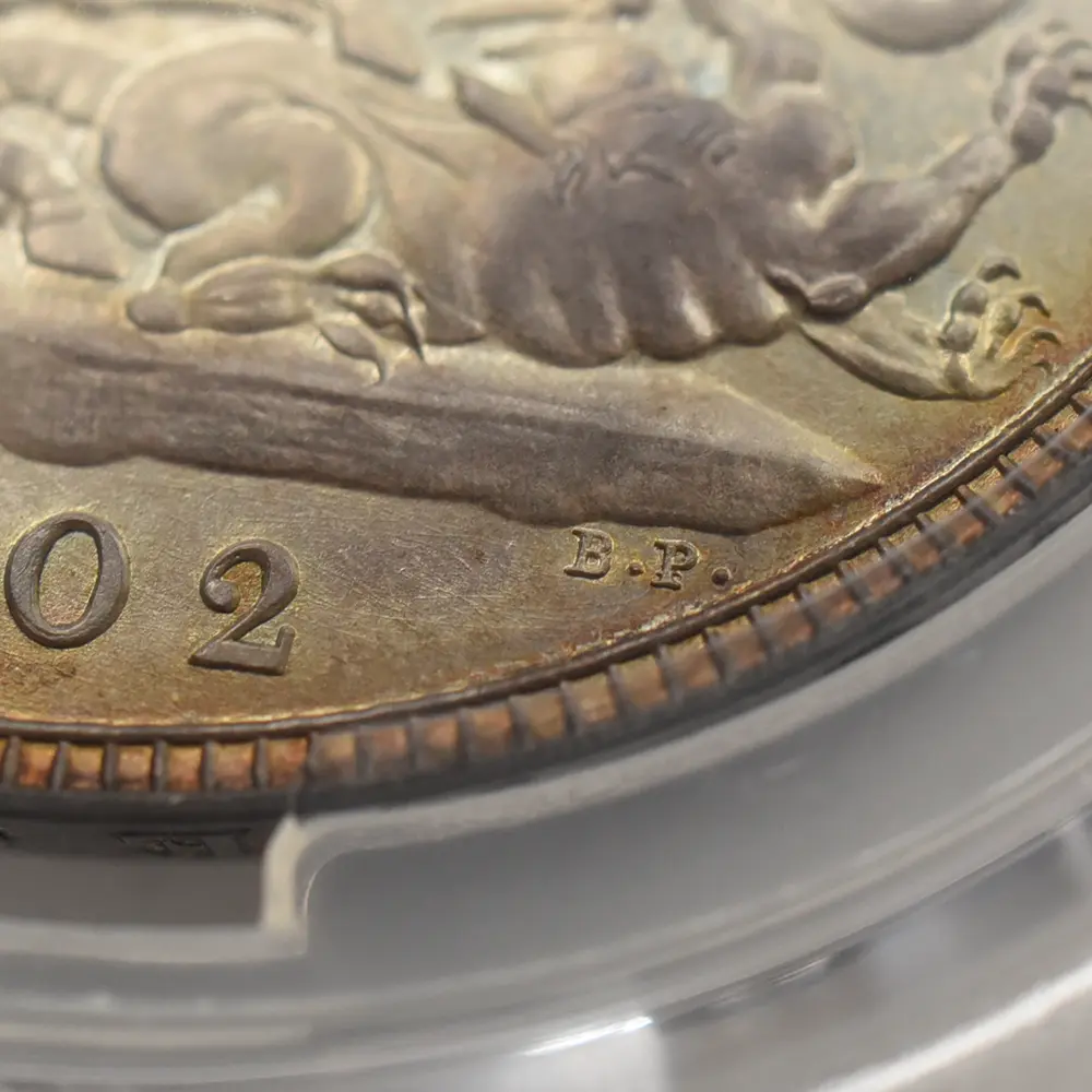 1901年、ヴィクトリア女王の崩御に際して英国王位並びにインド皇帝位を推戴された新国王エドワード7世。翌1902年にロンドンのウェストミンスター寺院にて挙行された王の戴冠式は、ヨーロッパ各国の王室を代表する名だたる君主の参列によって英国史上最後の壮麗豪華な儀式として行われ、20世紀初頭の英国史を華々しく飾りました。生涯を通じて英国内を始めヨーロッパ各国への訪問を遂行し、歴史上最も頻繁に行幸を重ねた英国君主として知られているエドワード7世。そんな国王は一人の人間として人生を謳歌した人物としても歴史上に名を残しています。恋多き人であったことでもよく知られているエドワード7世は、当時フランス社交界の華と謳われた一世一代の名歌手にして絶世の美貌の持ち主であったシャンソン歌手ミスタンゲット(1873年-1956年)の熱烈なファンであることを公言していました。残念ながら実らぬうたかたの恋に終わってしまったようですが、フランス語を得意とする王が頻繁に花の都パリを訪問する真の理由はそこに在ったのかもしれません。今回ご紹介させていただくクラウン銀貨は、60歳を目前に控えて英国王位を継承した王の歴史的な戴冠式を記念して発行された記念貨です。壮年期の王の威厳のある風貌を浮かび上がらせる人物描写は見事の一語に尽き、当時のコイン制作技術の驚異的なレベルを誇示しています。自然な写実性を特徴とするその微笑ましい無冠のポートレートの周囲には、大英帝国君主としての王の権威を象徴する厳かなタイトルがラテン語にて記されています。裏面には19世紀前半の英国ロイヤルミントを代表するコイン彫刻の達人ベネデット・ピストゥルッチ(1783年-1855年)の芸術家人生の総決算と言っても過言では無い「聖ジョージの竜退治」の意匠が誇らしく刻まれています。悪を暗示するドラゴンを退治する馬上の騎士を描写するこのデザインほどに、コイン上に歴代英国王の権威を表す題材として相応しいものは他に見当たりません。当クラウン銀貨の最大の特徴として、淡い褐色を見せる両面のマットプルーフ仕上げが挙げられます。同じデザインによる通常のプルーフ仕上げのコインの総発行数が256,000枚であったことに対し、同マットプルーフ版のそれは15,000枚と極端に少なく、空前の希少価値を生んでいることは確かです。アンティークコインとして今年120歳を迎える当コインは、老大国英国の黄昏の時節であったエドワード朝の永遠の追憶に捧げられる歴史的大作に他なりません。