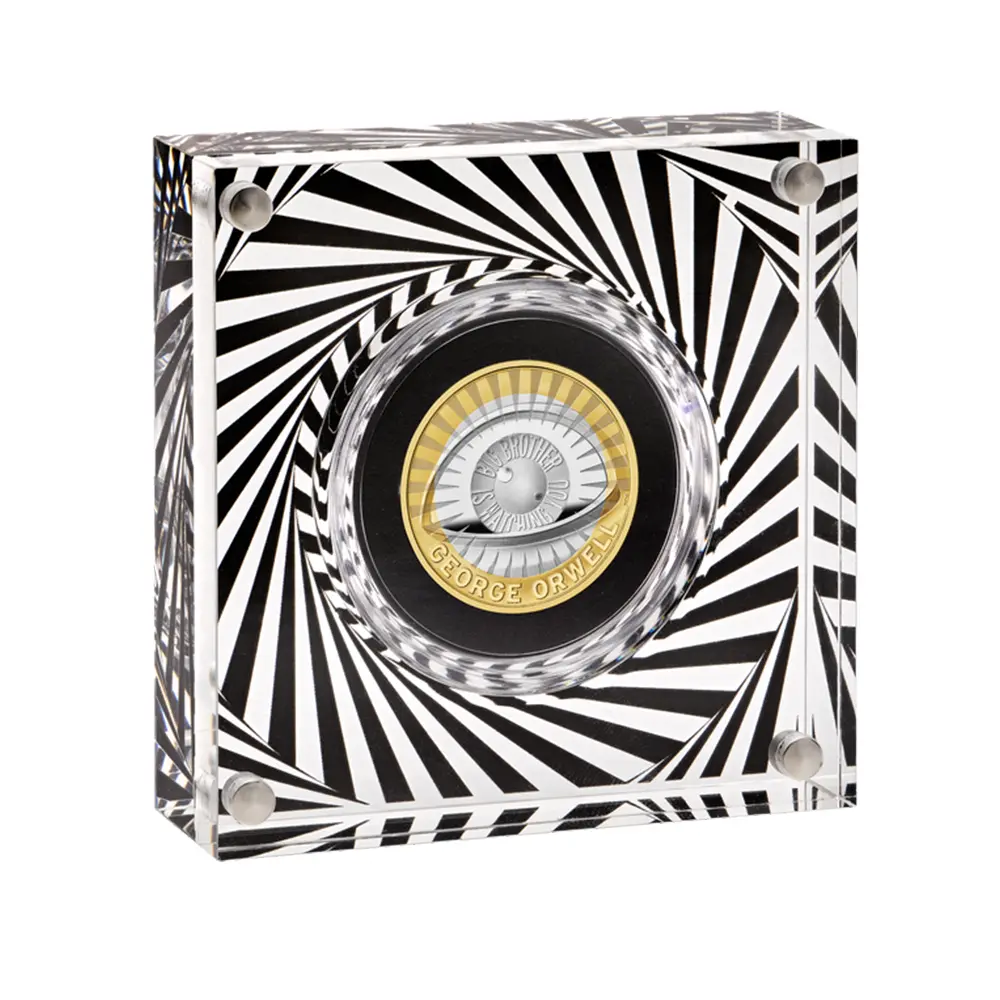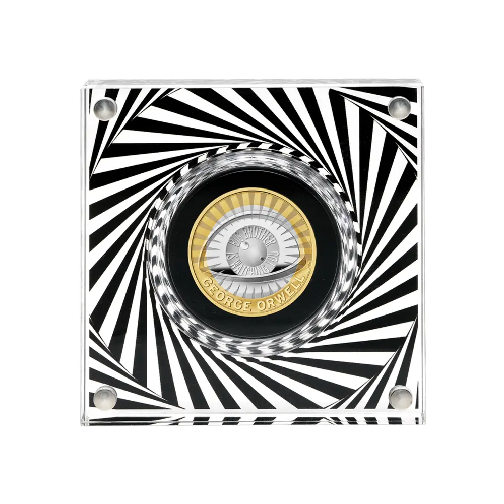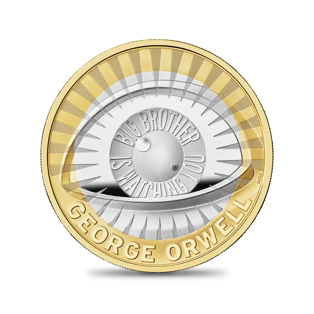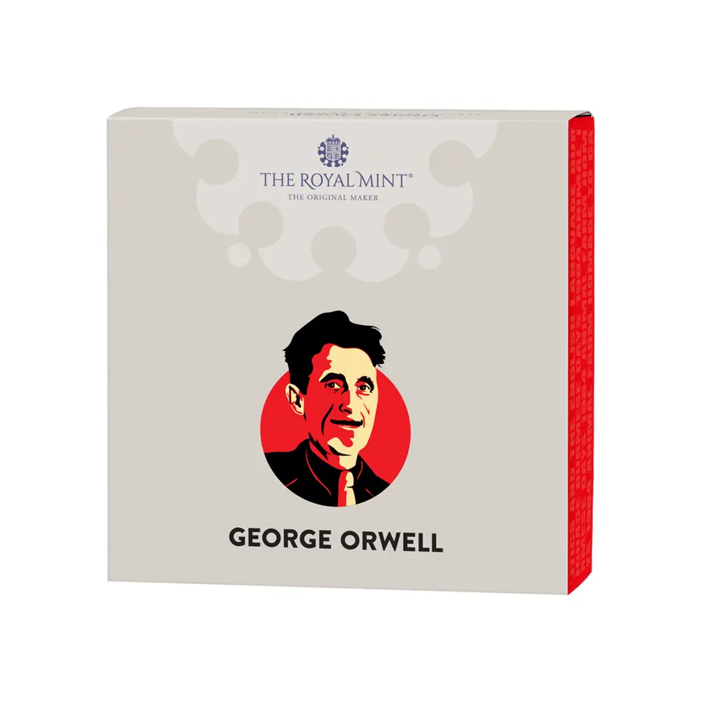 鋭い洞察力とウィットに富んだ文章によって世界的な共感を得ている20世紀前半のイギリスを代表する作家ジョージ・オーウェル(1903―1950)。2025年の年頭にロイヤルミントがリリースする当コインは、オーウェルと、とりわけ彼の代表作として歴史的に知られる小説「1984年」へのオマージュとして企画されたものです。イギリス植民地時代のインド生まれの作家ジョージ・オーウェルこと本名エリック・アーサー・ブレアの生涯については意外と一般的には知られていないことと思われます。社会主義者として活躍した若き日のオーウェルは、1936年12月にスペイン内戦で無政府主義者らに感化され、翌1937年には民兵組織「マルクス主義統一労働者党」という共和派の義勇軍に参加します。しかし、「トロツキー主義者」のレッテルを張られた同党に対するスターリン率いるソ連共産党による粛清の開始とともに監視されるようになったため、国外に脱出します。この件を機に、スペインのフランコ政権によるファシストより、味方であるはずのソ連のスターリニストの方がはるかに悪辣であることを体感し、ソ連の粛清を嫌悪する民主社会主義者となります。これらの経験から、次第に反共産主義・反ファシズムの反全体主義思想に傾倒するようになります。第2次世界大戦中の1945年には、ソ連のスターリン主義と共産主義への痛烈な批判から、人間の農場主に対して革命を起こした動物たちが、動物の代表によって熾烈な支配を強いられる過程を描いた風刺小説「動物農場」を執筆し、一躍ベストセラー作家となります。また戦後の1949年には、全体主義国家の本質や恐怖を詳細にわたって描写した20世紀文学の傑作「1984年」を発表します。「1984年」で描写されているような監視管理社会は、今日、作者のオーウェルの名に因んで「オーウェリアン」と表現されることもあるほどです。20世紀文学の最高傑作と目される「1984年」が1998年にランダム・ハウスのモダン・ライブラリーが選んだ「英語で書かれた20世紀の小説ベスト100」、1999年にはル・モンド紙の「20世紀の100冊」、また2002年にはノルウェー・ブック・クラブ発表の「史上最高の文学100」に選出されたことからも、いかにオーウェルが20世紀のイギリスを代表する知性と見なされているかがよく分かります。