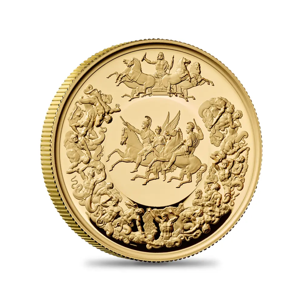 ©第6弾-連合国代表 & 第7弾-勝利 これまでに過去の歴史的なコインやメダルのデザインを復刻し、シリーズ化されたコレクションとしては傑出した成功を収めた「偉大なる彫刻家シリーズ」。とりわけ第1弾の「ウナとライオン」は高い評価を獲得し、単独でのモダンコインとしては短期間での好調な相場高騰を実現しました。その後も「スリーグレーセス」や「ゴチッククラウン」などの古典的な名作を次々と世に送り出した同シリーズでしたが、第6弾にして初となる古今東西のメダルの傑作「ワーテルロー・メダル」の解禁は、歴史的にも名高い同作品初のモダンコイン化ということで各界からの例外的な注目を集めました。19世紀初頭のナポレオン戦争における連合国側の勝利を浮き彫りにする同メダルの繊細華麗なデザインは、ウィリアム・ワイオン(1795-1851)と並んで19世紀初頭の英国貨幣界での人気を二分したイタリア・ローマ出身の大彫刻家ベネデット・ピストゥルッチ(1783=1855)が30年以上もの歳月をかけて完成させた第一級の芸術作品です。2024年に先にリマスターされた同メダル表面のデザインは、ナポレオン戦争の終盤戦に当たるワーテルローの戦いにおけるイギリス軍の圧倒的勝利を意匠化したもので、当時イギリスの摂政王太子であったジョージ4世とロシア皇帝アレクサンドル1世と並んで、連合国側の中枢として参加したオーストリア・プロイセン両国軍の代表の横顔が刻まれていて壮観の趣です。古代戦車チャリオットを様々なバリエーションによって描く周囲のデザインも見事であり、ピストゥルッチならではの美意識と表現力を感じさせます。19世紀初頭から10年以上もの長期戦となったナポレオン戦争が1815年のワーテルローの戦いによって閉幕を迎えた史実は、今もなお英国軍の勝利と共に伝説として語り継がれていますが、この優れた劇的効果を特徴とするデザインが通常の記念コイン上にではなく、より三次元的な立体性を可能とするメダルとして発表された点に大いなる意義を見出さずにはいられません。そしてこの度、同メダルのオリジナル裏面の意匠が「偉大なる彫刻家シリーズ」の第7弾として華々しくリリースされるに至ったことは。英国貨幣界の快挙として長きにわたって語り継がれることと思われます。