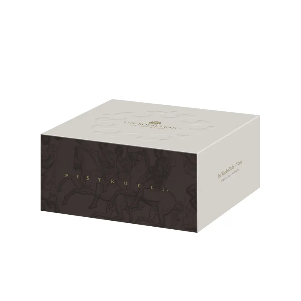 ©The Royal Mint 「偉大なる彫刻家シリーズ」の第7弾を数えるこの度の「ワーテルロー・メダル」裏面デザインの発表は、ピストゥルッチ畢生の大作として英国貨幣界に刻まれる同作品の全貌を世に伝える重要な役割を果たすものです。作品裏面には、前作と同様の戦闘シーンのバリエーションが連続的に描かれており、千変万化する戦意の高揚が見事に意匠化されていて圧巻です。戦闘シーンと言いますと、通常は残虐であったりすることが殆どではないかと思われますが、ピストゥルッチの感性に触れますと完璧にコントロールされた純粋な美感によってろ過され、一枚の絵画を見るかのような深い感動を与えます。