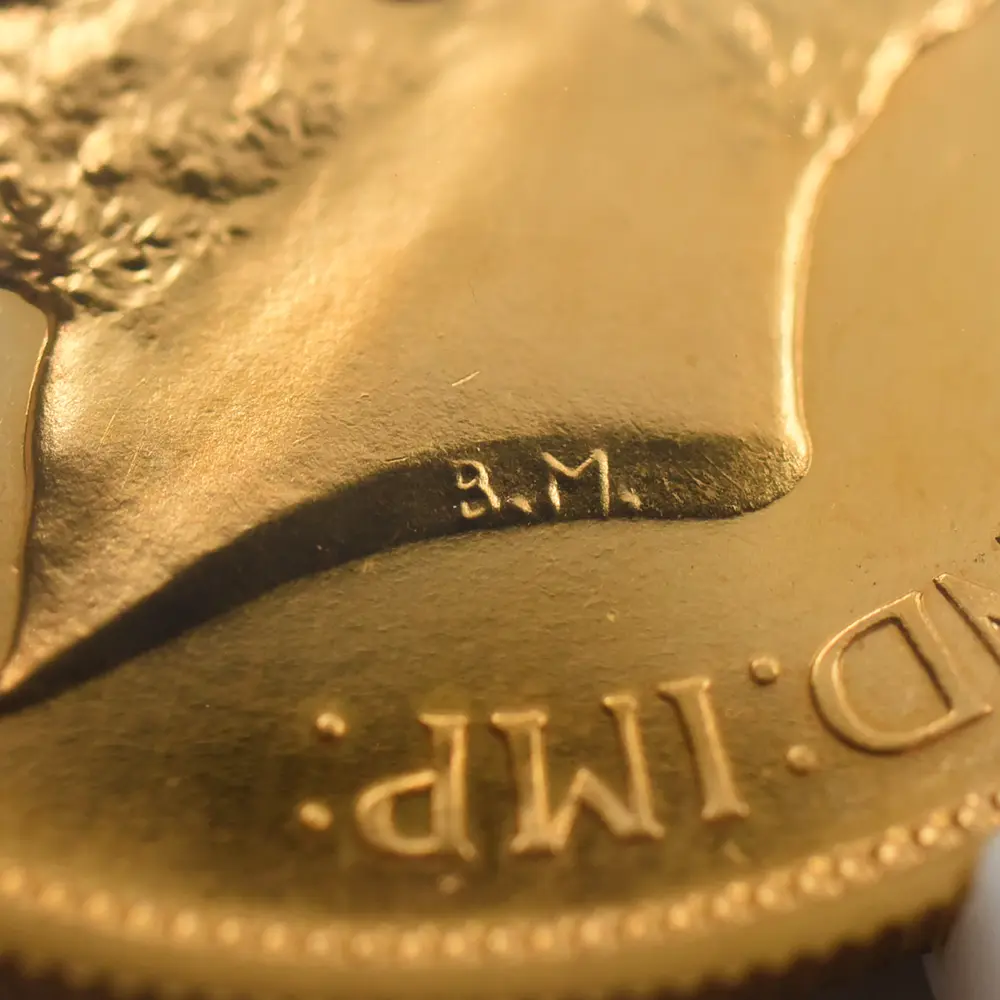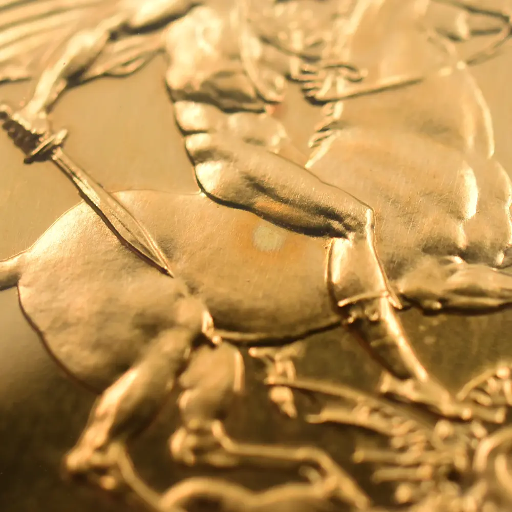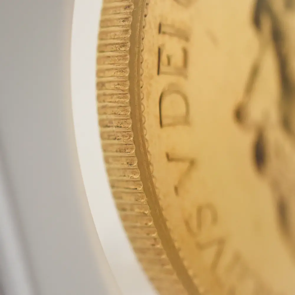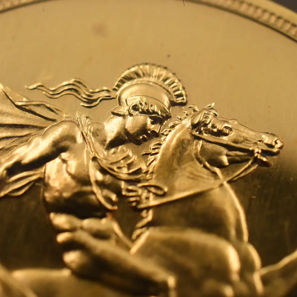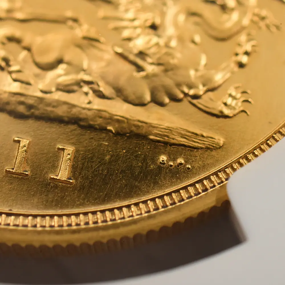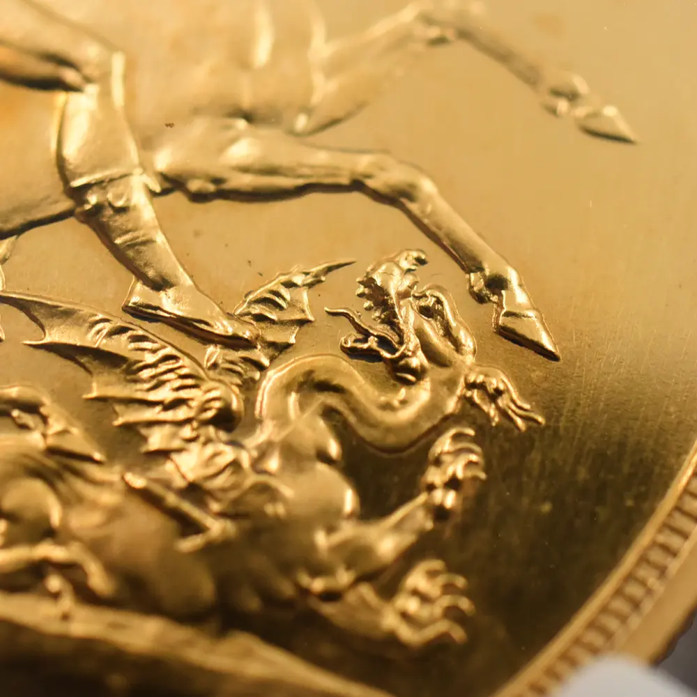 忠誠の擁護者にしてインドの皇帝」の文言がジョージ五世の至高の身位を物語っています。裏面にはマントを翻して駿馬に跨るセントジョージの雄姿が刻まれており、悪の象徴であるドラゴンを退治するその一途な姿は、命を賭して国を守る帝王の仮の姿と捉えることが出来ます。この一世一代の豪華絢爛たる戴冠式の記憶は1911年の年代とともにコイン上に深く刻まれ、後世に受け継がれるべき究極の記念品として不変の価値を有しているように思われます。