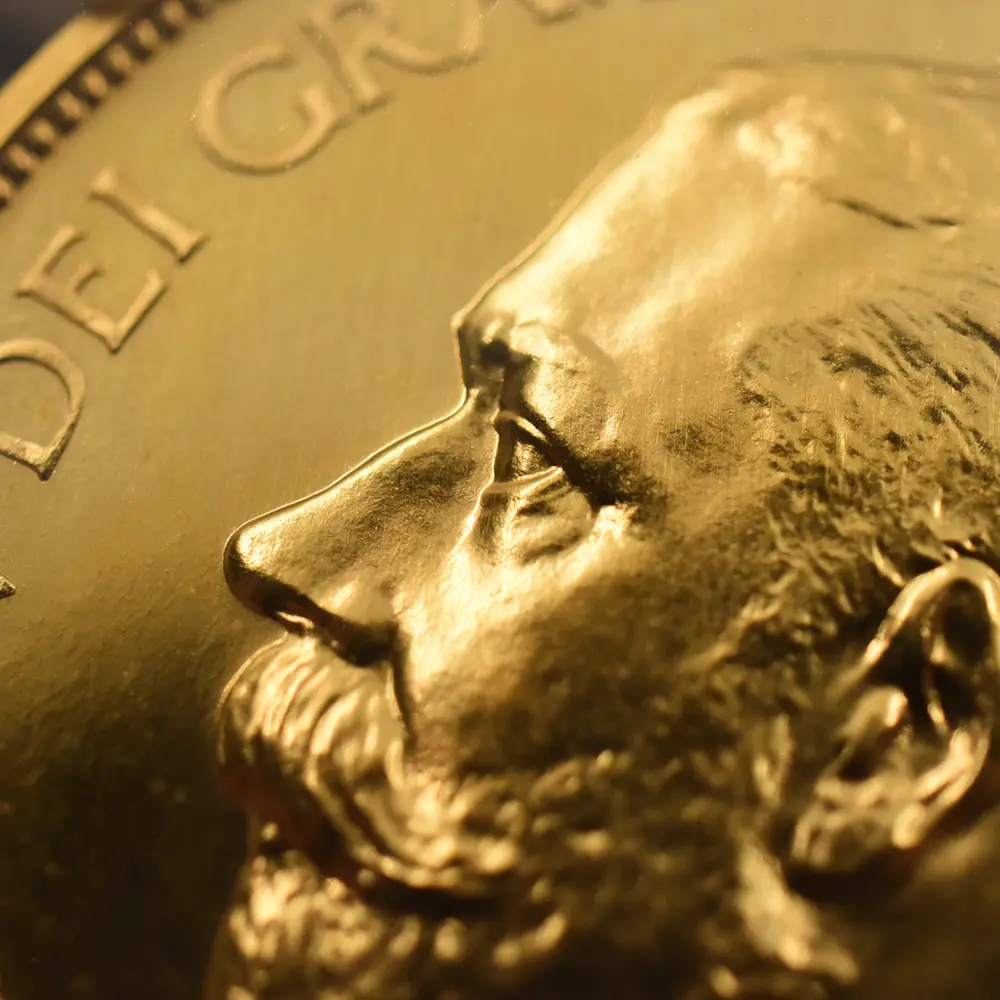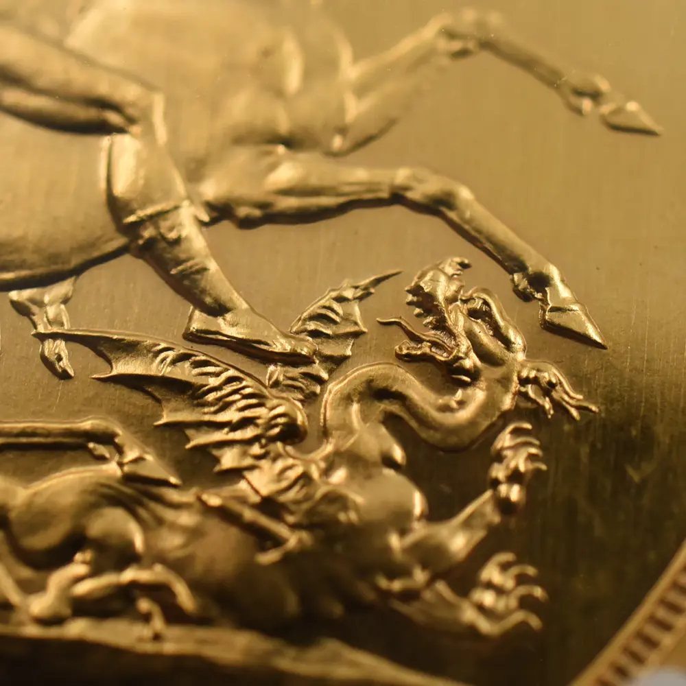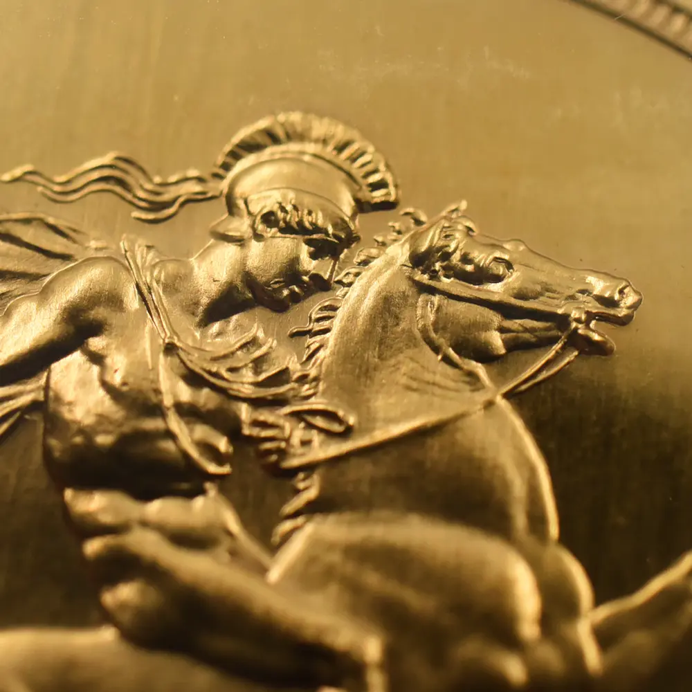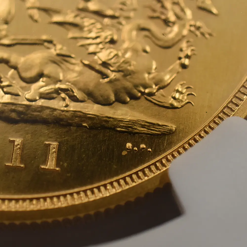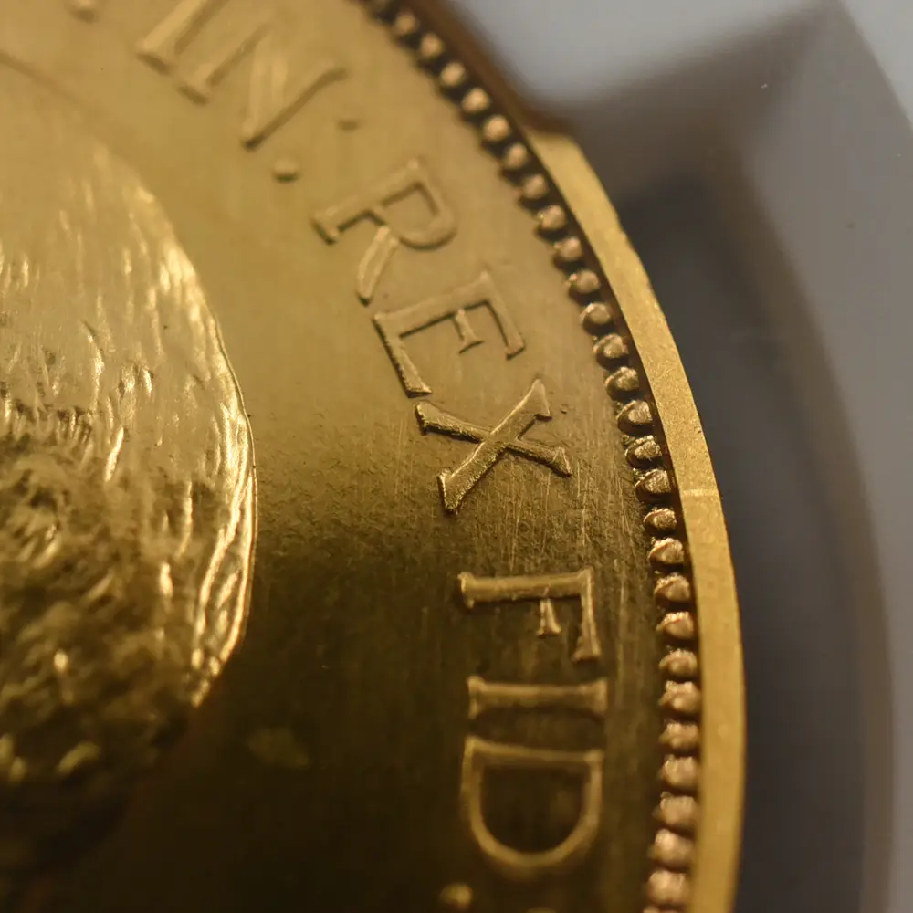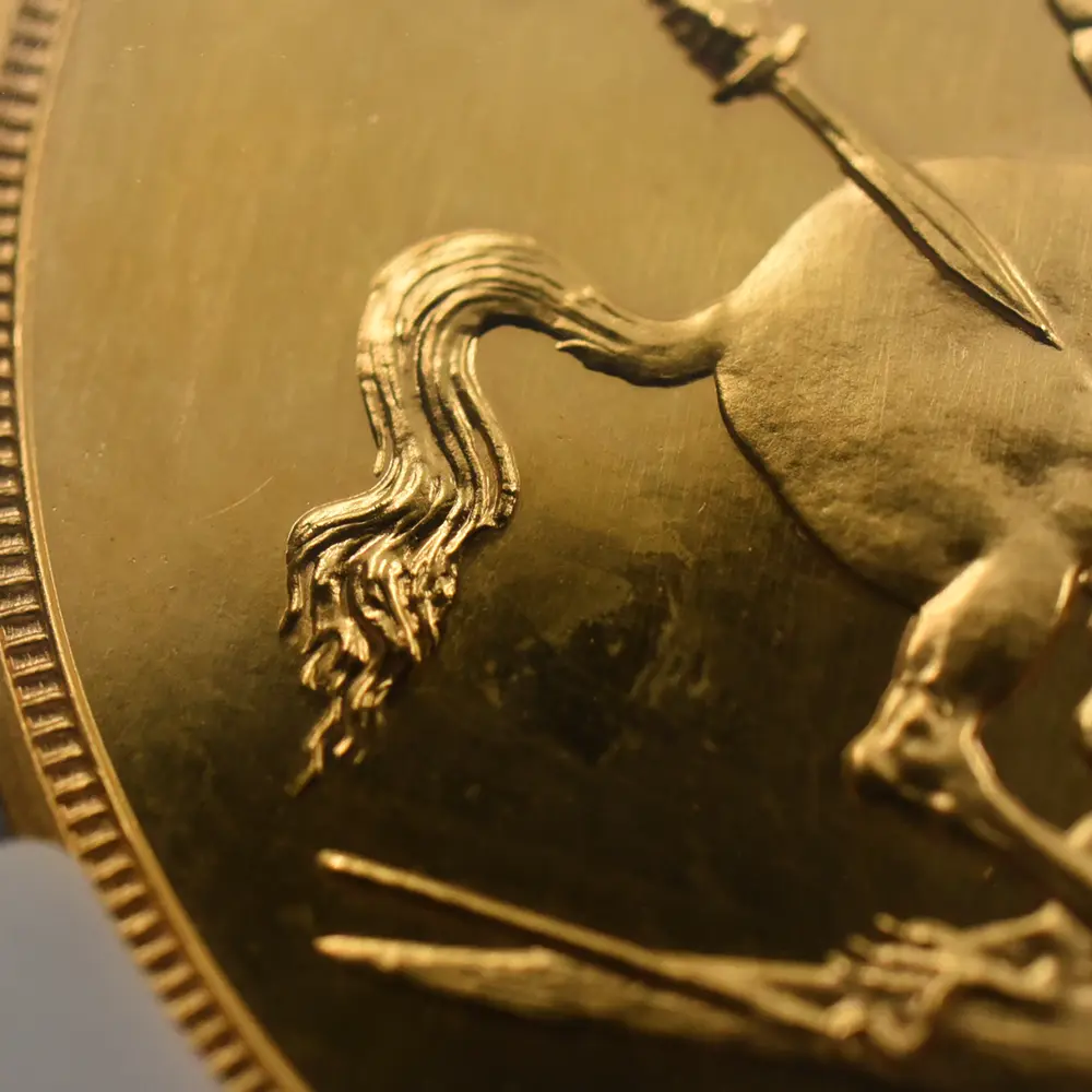忠誠の擁護者にしてインドの皇帝」の文言がジョージ五世の至高の身位を物語っています。裏面にはマントを翻して駿馬に跨るセントジョージの雄姿が刻まれており、悪の象徴であるドラゴンを退治するその一途な姿は、命を賭して国を守る帝王の仮の姿と捉えることが出来ます。この一世一代の豪華絢爛たる戴冠式の記憶は1911年の年代とともにコイン上に深く刻まれ、後世に受け継がれるべき究極の記念品として不変の価値を有しているように思われます。