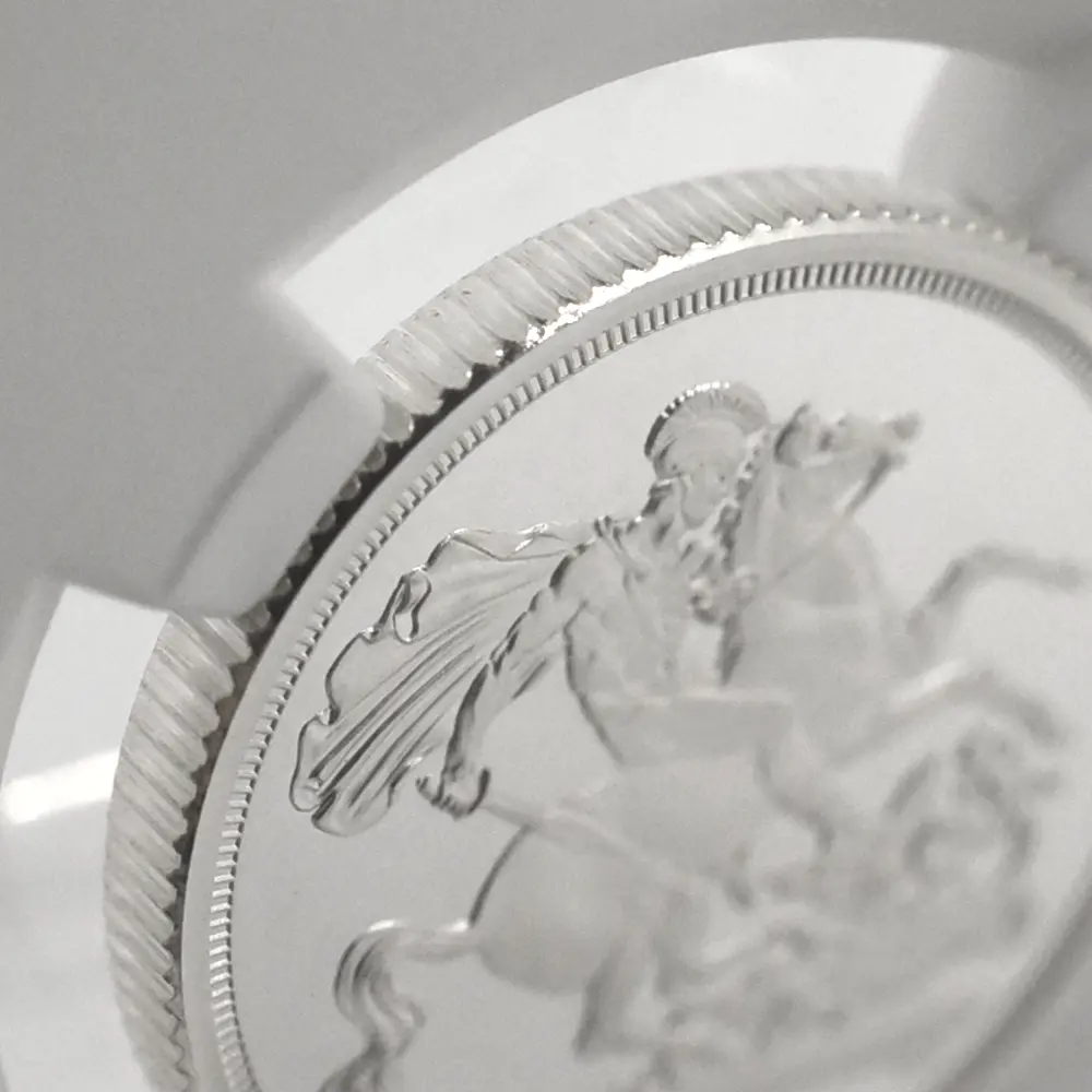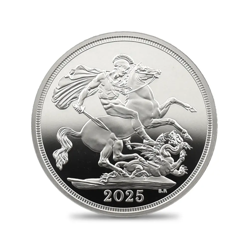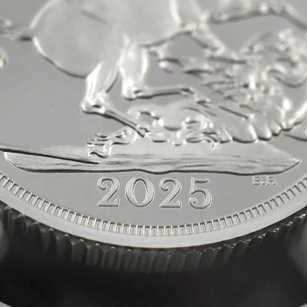 19世紀初頭に奇跡的な復活を果たしたソブリン金貨。その後もハノーヴァ朝の国王を始め、歴代英国君主たちの庇護の下に最上位に君臨する英国金貨としての名声を保ち続けました。中でも1936年に即位した伝説の英国王エドワード8世の僅か11か月の在位期間の後にごくわずかな数のみ発行されたソブリン金貨は、オークション史上最も高値を付けた英国金貨の傑作として、その存在は今日、半ば伝説化しています。今回ご紹介させていただく商品は、2025年度のモダンコインとして本年発表されたソブリン貨の銀貨バージョンです。金貨の代名詞とされるソブリン貨ですが、ここに銀貨のバージョンが誕生したことは稀有な事例として英国貨幣史上に記録されることでしょう。コイン裏面には、19世紀初頭の新生ソブリン貨の誕生と共に産声を上げた英国貨幣デザインの永遠の定番「聖ジョージの竜退治」が刻まれています。近代以降の歴代君主たちのソブリン貨の裏面を代々彩ってきたこの名デザインは、ウィリアム・ワイオンと並んで19世紀前半の英国貨幣界での人気を二分した天才芸術家、ベネデット・ピストゥルッチ(1783-1855)畢生の大作として知られる意匠に他なりません。そしてコイン表面には、2022年の前英国王、エリザベス2世の崩御に際して英国王位を継承した新国王チャールズ3世の「公式第1コイン肖像」が掲げられています。ロイヤルミントの名匠マーティン・ジェニングスによる精緻な表現力を特徴とするこの気高いポートレートは、国王自身の推挙を得て英国貨幣界の新たな顔となりました。表面には君主の肖像、また裏面にはピストゥルッチの「聖ジョージの竜退治」と、至って典型的な2種のデザインを両面に描く当銀貨ですが、英国貨幣ならではの古典美を堪能するのにはうってつけであり、またソブリン貨の本質と今後の英国貨幣界の方向性を明確に示唆する第一級の芸術作品でもあります。