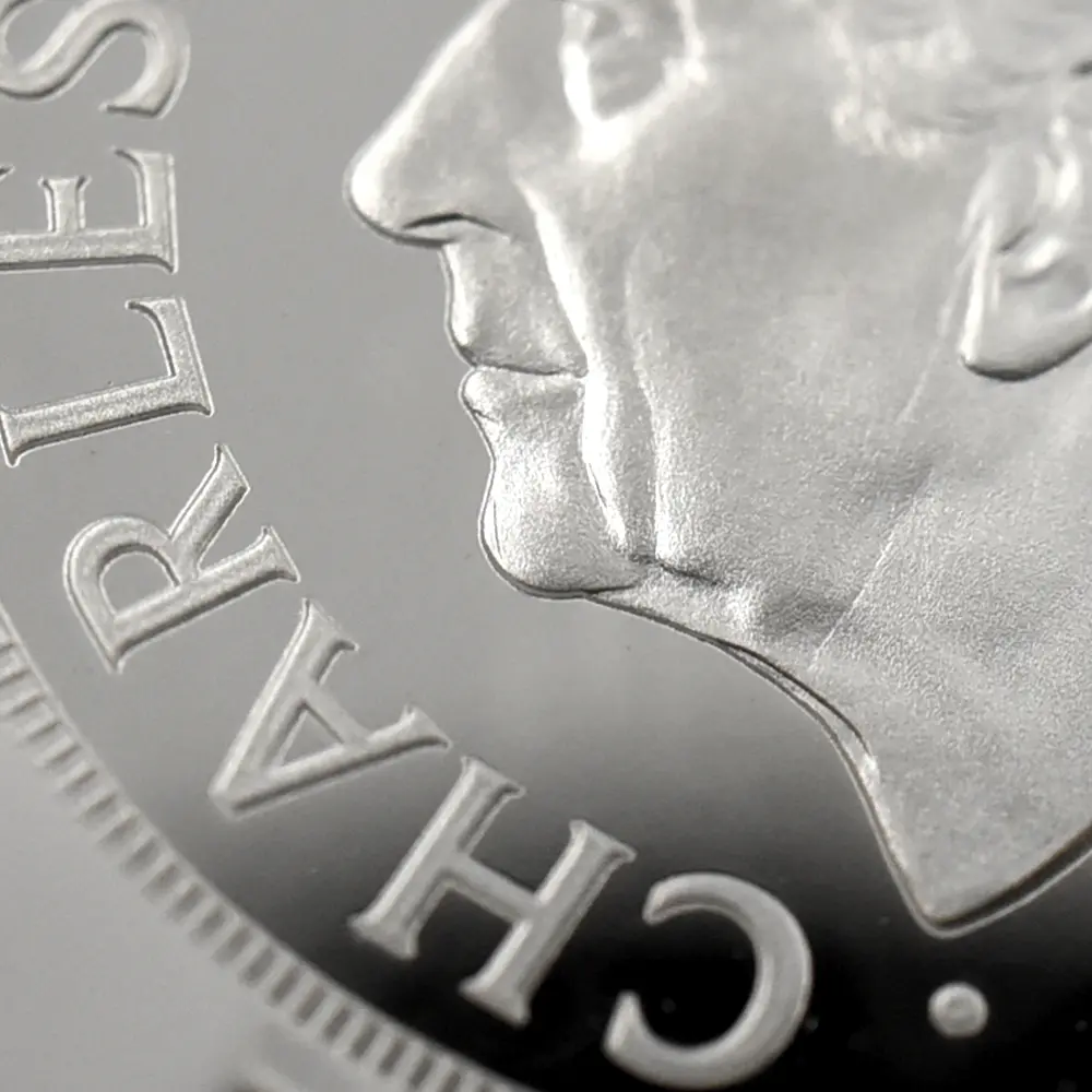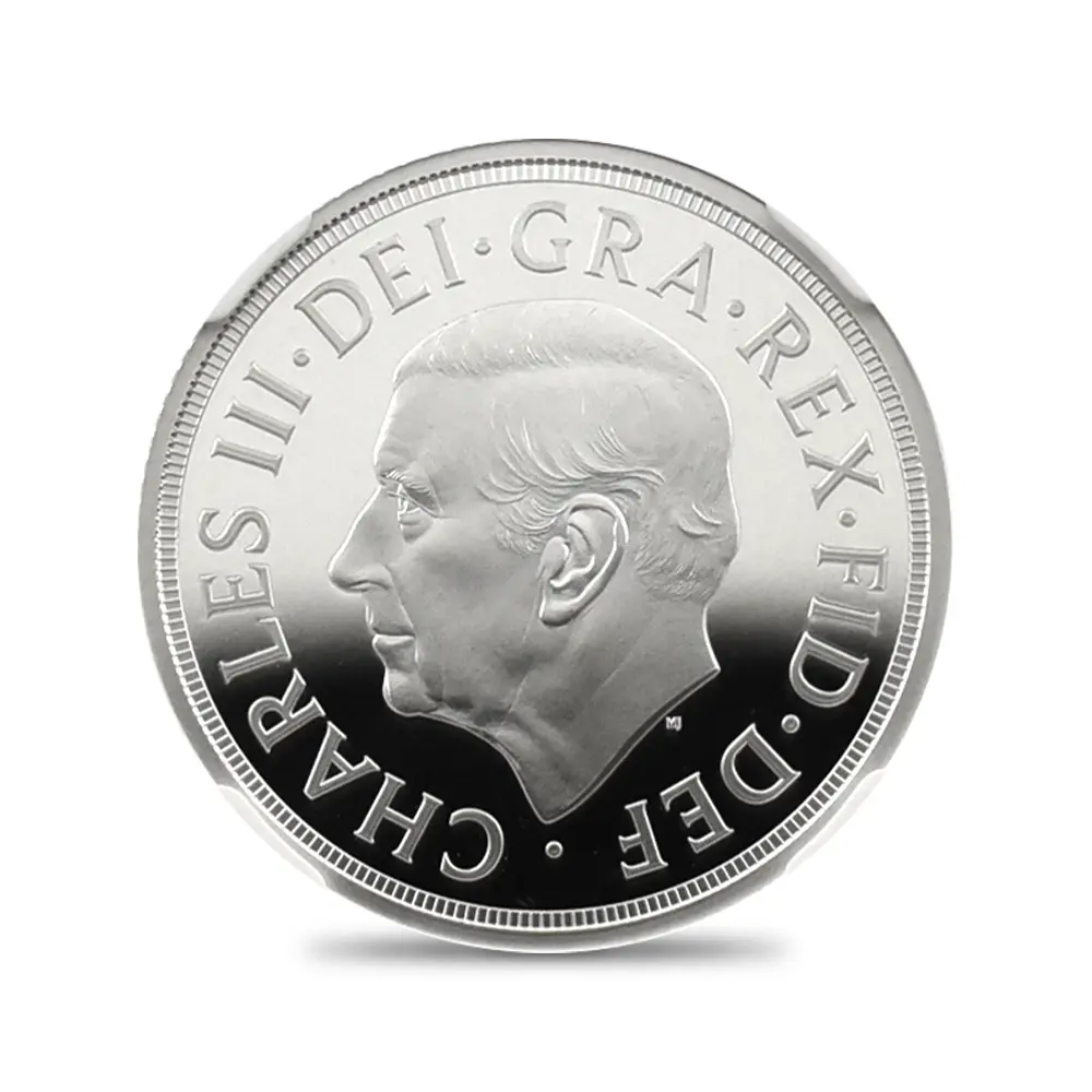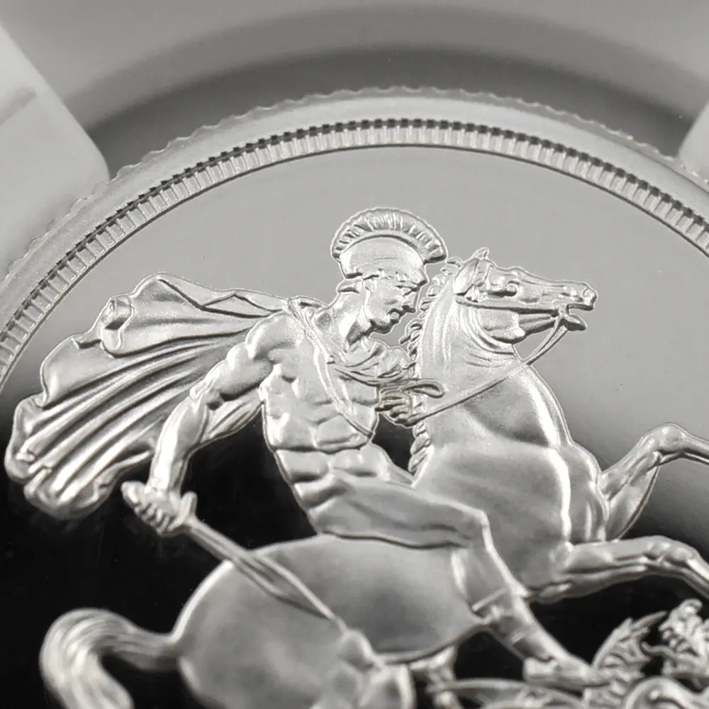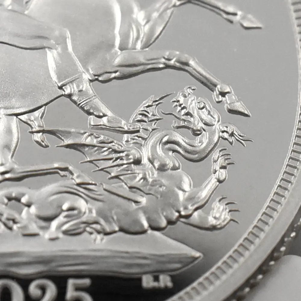 19世紀初頭に奇跡的な復活を果たしたソブリン金貨。その後もハノーヴァ朝の国王を始め、歴代英国君主たちの庇護の下に最上位に君臨する英国金貨としての名声を保ち続けました。中でも1936年に即位した伝説の英国王エドワード8世の僅か11か月の在位期間の後にごくわずかな数のみ発行されたソブリン金貨は、オークション史上最も高値を付けた英国金貨の傑作として、その存在は今日、半ば伝説化しています。今回ご紹介させていただく商品は、2025年度のモダンコインとして本年発表されたソブリン貨の銀貨バージョンです。金貨の代名詞とされるソブリン貨ですが、ここに銀貨のバージョンが誕生したことは稀有な事例として英国貨幣史上に記録されることでしょう。コイン裏面には、19世紀初頭の新生ソブリン貨の誕生と共に産声を上げた英国貨幣デザインの永遠の定番「聖ジョージの竜退治」が刻まれています。近代以降の歴代君主たちのソブリン貨の裏面を代々彩ってきたこの名デザインは、ウィリアム・ワイオンと並んで19世紀前半の英国貨幣界での人気を二分した天才芸術家、ベネデット・ピストゥルッチ(1783-1855)畢生の大作として知られる意匠に他なりません。そしてコイン表面には、2022年の前英国王、エリザベス2世の崩御に際して英国王位を継承した新国王チャールズ3世の「公式第1コイン肖像」が掲げられています。ロイヤルミントの名匠マーティン・ジェニングスによる精緻な表現力を特徴とするこの気高いポートレートは、国王自身の推挙を得て英国貨幣界の新たな顔となりました。表面には君主の肖像、また裏面にはピストゥルッチの「聖ジョージの竜退治」と、至って典型的な2種のデザインを両面に描く当銀貨ですが、英国貨幣ならではの古典美を堪能するのにはうってつけであり、またソブリン貨の本質と今後の英国貨幣界の方向性を明確に示唆する第一級の芸術作品でもあります。