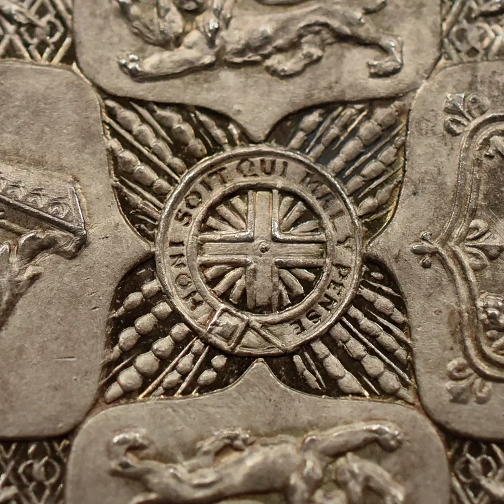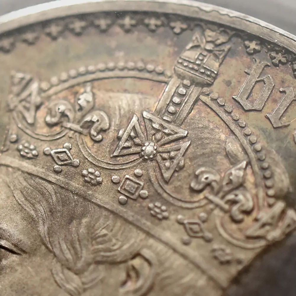 表面の女王のポートレートに見られる装飾品や衣装のデザインに見られる絶妙なバランス感覚は、同様式特有の字体「ブラックレター」(𝕭𝖑𝖆𝖈𝖐𝖑𝖊𝖙𝖙𝖊𝖗)による周囲の碑文との見事なまでの統一感によって強調されるという一種の芸術的効果を生んでいます。そしてその造形美は、裏面に刻まれている連合王国3国の国章を模った十字型の紋章、さらにはその周囲の、これもまたブラックレターで刻まれた格調高い碑文からも伺うことができます。ワイオンの才能の賜物と言っても過言では無いこのコイン両面の秀逸なデザインは、英国コイン上におけるゴチックリバイバルの好例として貨幣界における伝説となり、その後「世界で最も美しい英国銀貨」の異名を取るほどの例外的な高評価を確立するに至りました。