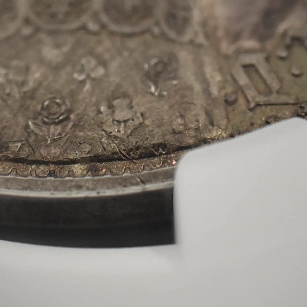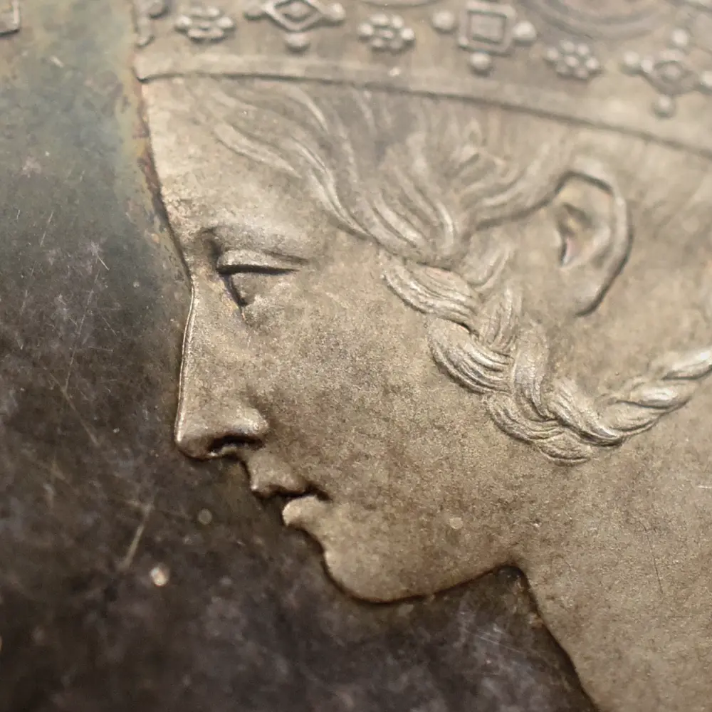 今回ご紹介させていただく作品は、発行初年度の1847年にリリースされました同作品の「プレーン・エッジ」タイプの名品です。デザインやエッジの刻印が若干異なる数種類のバージョンの存在が確認されている「ゴチッククラウン」ですが、中でもこのタイプのものは同デザインの原型を示す傑作と位置付けられており、高い評価を得ています。