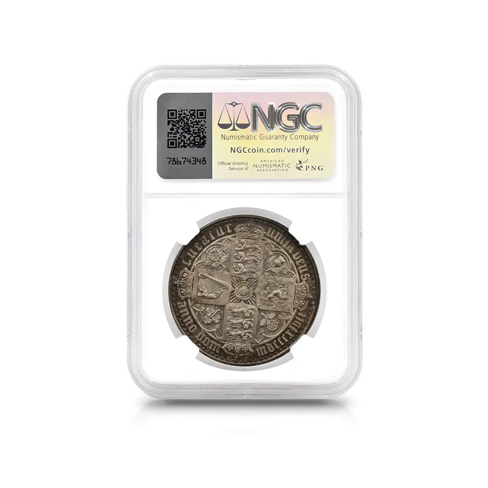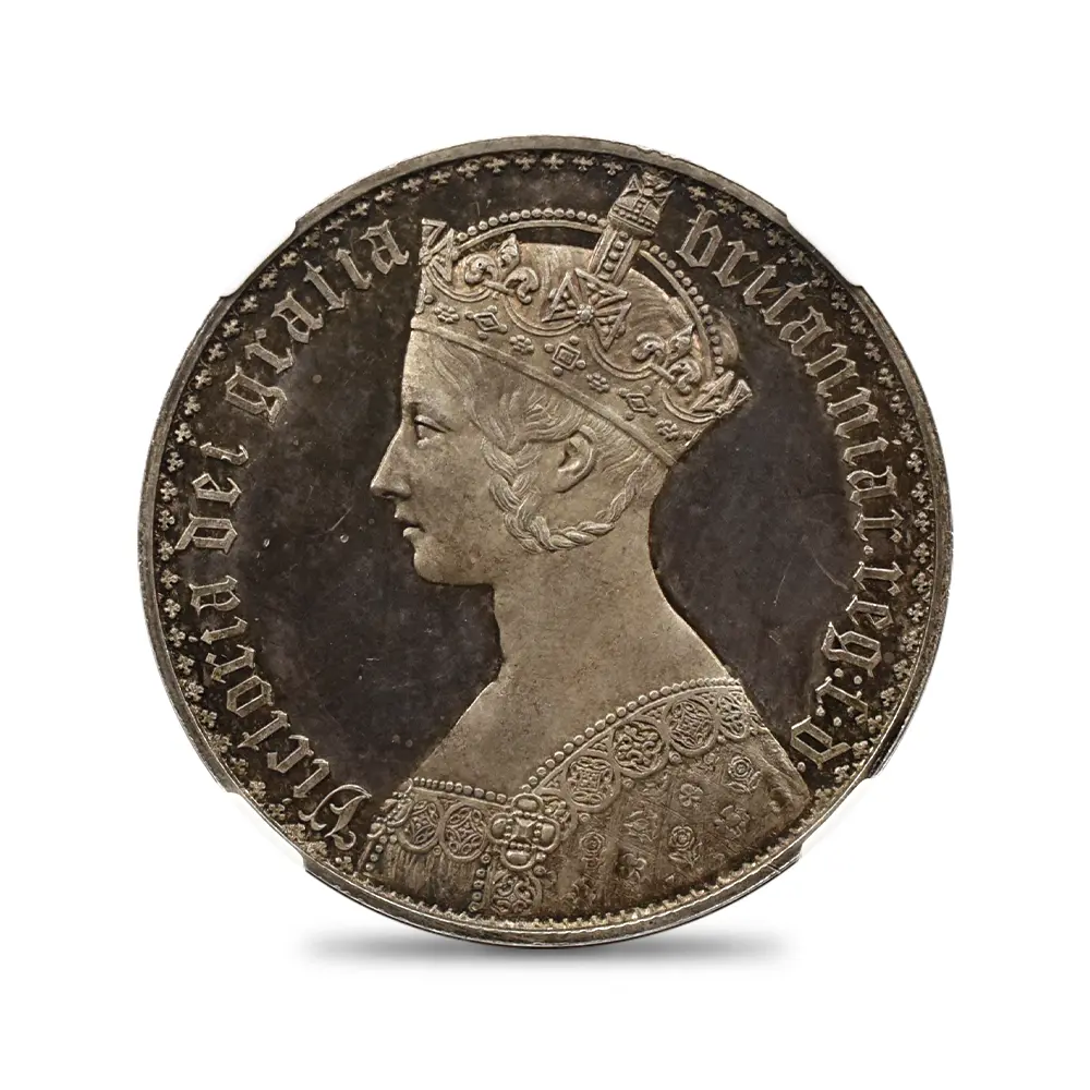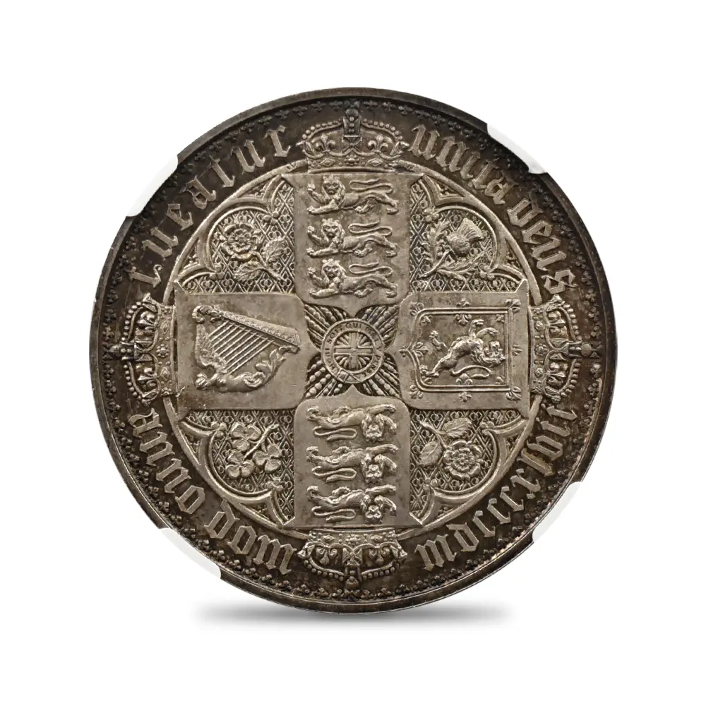 透徹した美しさを見せる表面のヴィクトリア女王の肖像と荘重な趣を湛えた裏面の連合王国各国の国章を特徴とする英国貨幣随一の名品「ゴチッククラウン」は、ヴィクトリア期の英国貨幣界において新たな方向性を示唆した記念すべき作品として永遠の価値を有するものです。