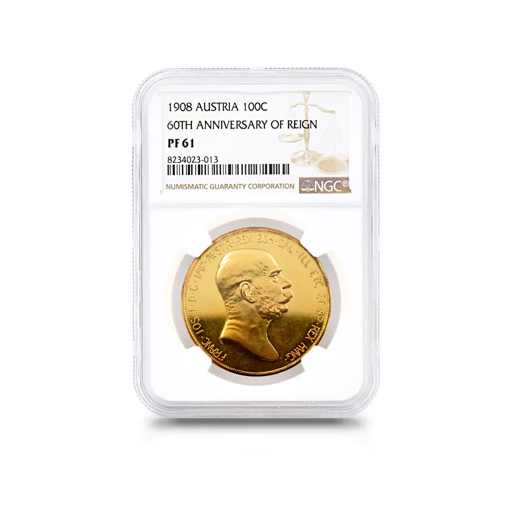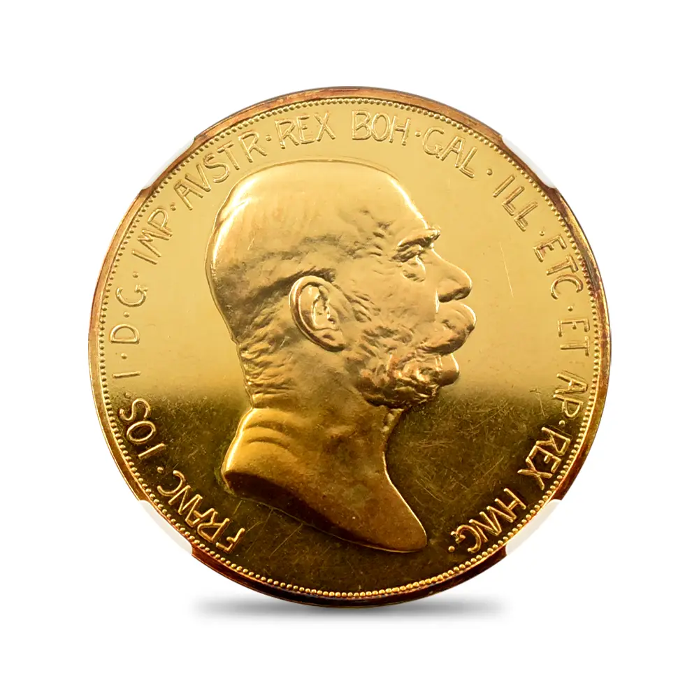 1908年に発行された当金貨は、中央ヨーロッパに一大帝国を築き上げたハプスブルグ家最後の皇帝フランツ・ヨーゼフ1世の即位60周年を寿ぐ究極の記念貨です。