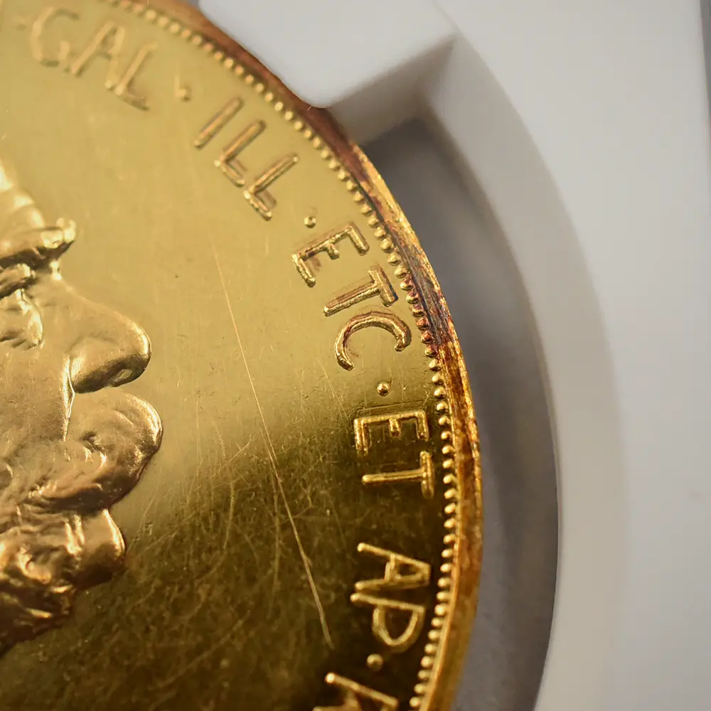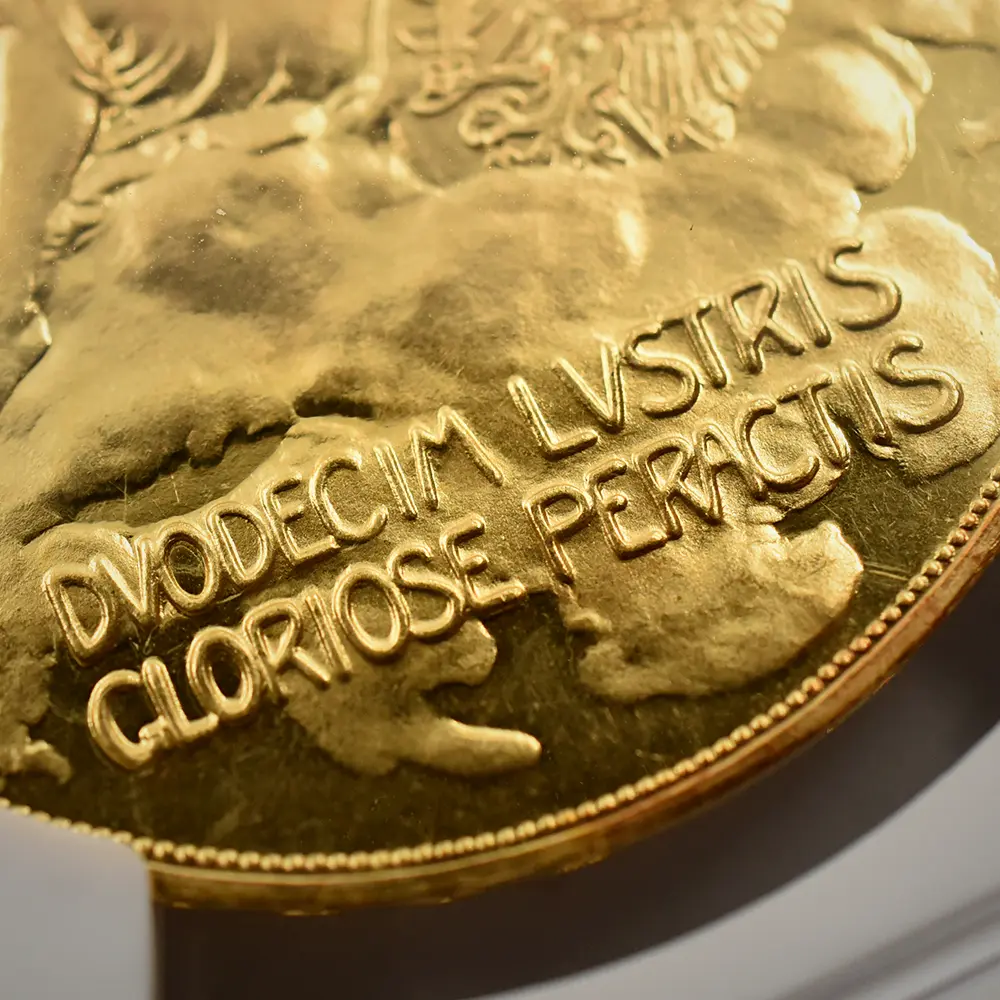 裏面には通称「雲上の女神」と呼ばれる右手にオリーブの若木を、左手にオーストリア・ハンガリー帝国の国章「双頭の鷲」を掲げる崇高な女神像が描かれています。そしてその下部には「60年間にわたる栄光の功績」を意味するラテン語碑文が刻まれており、この至高の60周年に無限の光を投げかけています。その際立った美しさと歴史的価値により、コインマニア垂涎の名品として単独で特筆されるべき一枚です。
