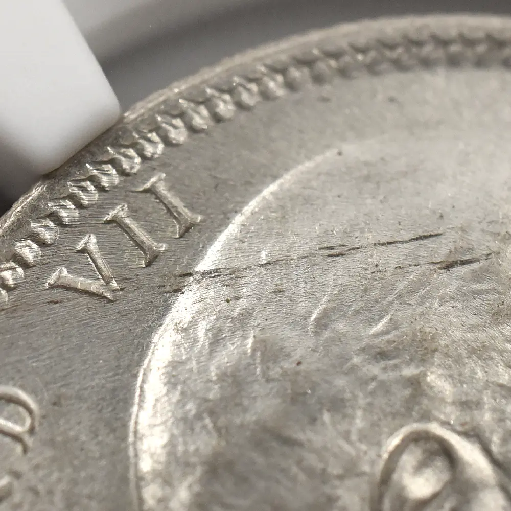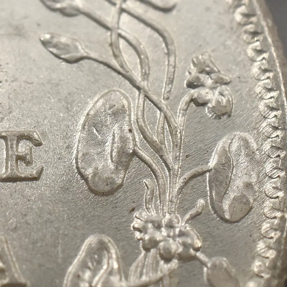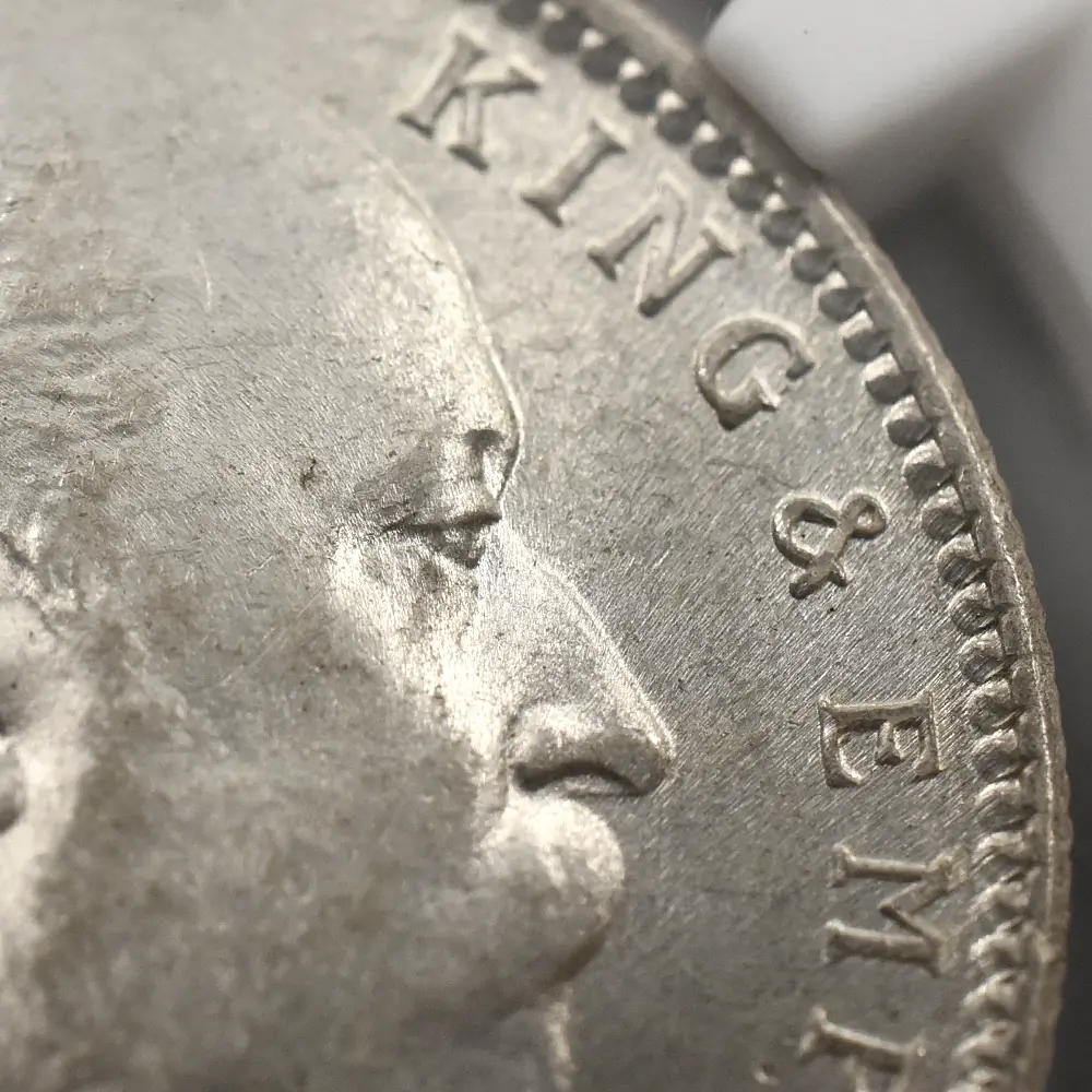 1901年の1月のヴィクトリア女王の崩御に際して王位を継承したエドワード7世。女王の喪が明けたよく1902年に挙行された王の戴冠式は、その後の歴代国王のそれとは比較にならないほどの豪華絢爛たる威容でした。第一次世界大戦によって事実上の衰退期を迎えることになるヨーロッパ各国の王室ですが、それ以前に開催されたエドワード7世の戴冠式には当時のヨーロッパを代表する王族がほぼ全員参列し、20世紀最初にして歴史上最後の厳粛な儀式となりました。今回ご紹介の作品は、王が崩御した年1910年発行の英領インドによるルピー銀貨です。コイン表面には、右向きのエドワード7世の自然な肖像が描かれています。20世紀初頭に制作されたコイン肖像の最高傑作とされるこの作品の制作者は、当時のロイヤルミントで活躍していた国王お気に入りのデザイナー、ジョージ・ウィリアム・デ・ソールズであり、1902年に発表されてから王の崩御の年、つまり当コインが発行された発行された1910年までの間、短いながらも英国コインの表面を彩ってきたものです。王の肖像の周囲には、「国王にして皇帝エドワード7世」と、英領インドの流通貨においては当時一般的であった英語の碑文が刻まれています。皇帝の称号は母ヴィクトリアから受け継いだものですが、女王自身は1877年にグラッドストーン首相が提案した新たな法案の可決によってインド皇帝位を有し、インド女帝となった背景がありました。コイン裏面を見ますと、まず上部の王冠に目が行きます。そして中央には「1ルピー・インド」の文言が付されており、当時の英領インドでの流通貨であることが分かります。さらに1910年の発行年が刻まれており、その左右には植物を模した装飾性豊かなデザインがバランスよく配されています。伝統美と共に20世紀初頭らしいすっきりとして意匠が特徴的な当ルピー銀貨は、同時代のヨーロッパにおいて目覚ましい発展を遂げたエドワード7世時代の大英帝国の遺産として、21世紀に継承された歴史遺産であると断言できます。