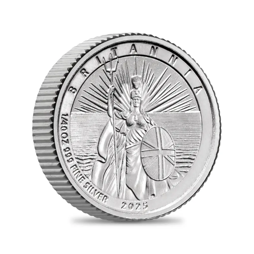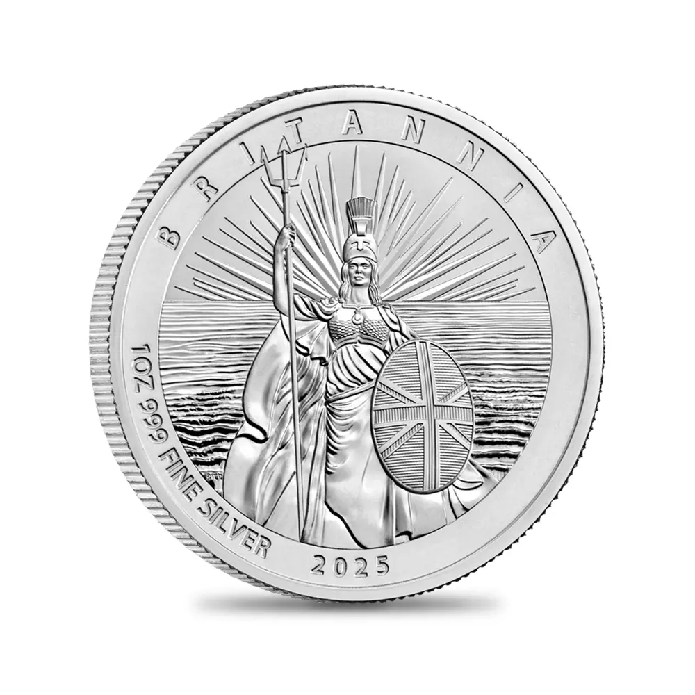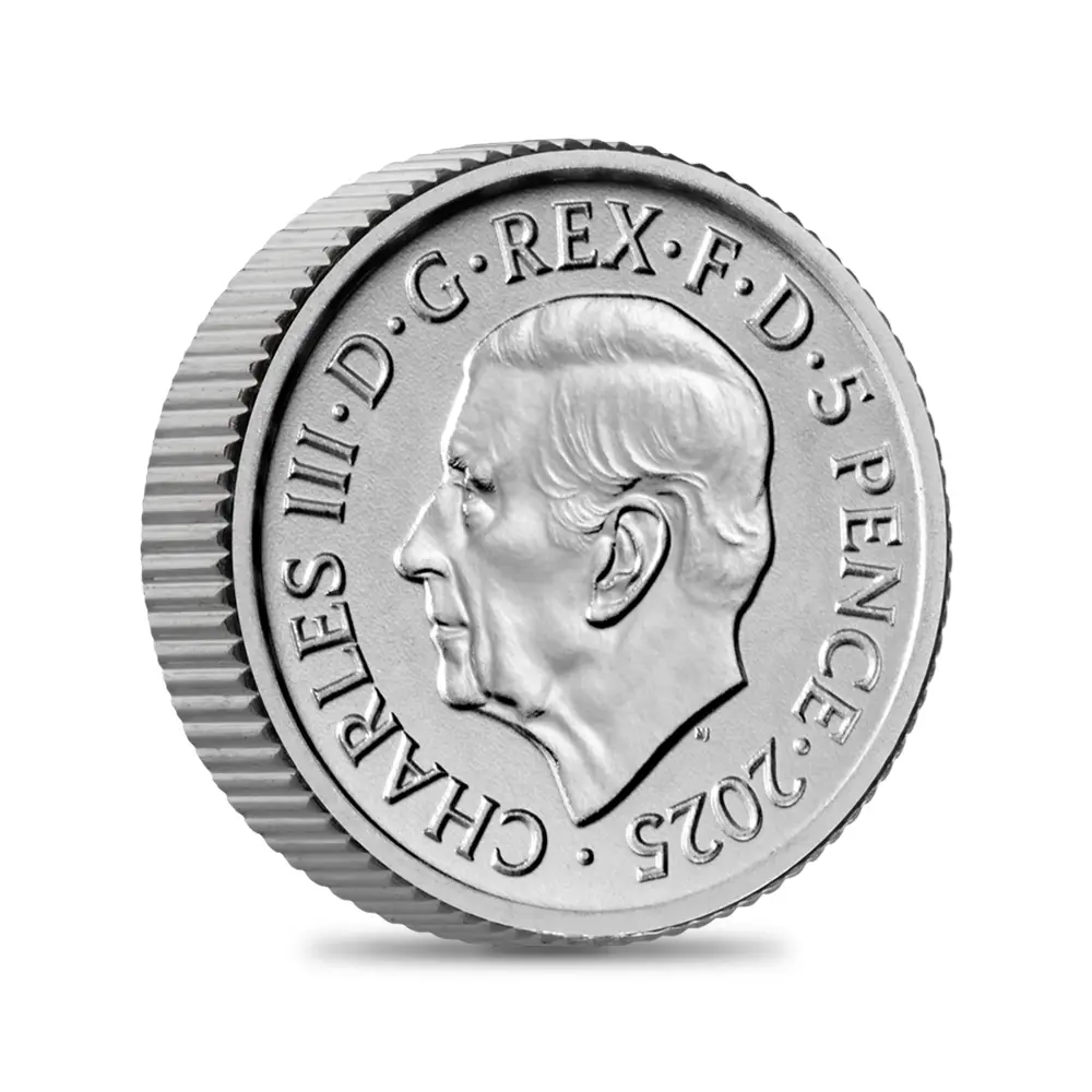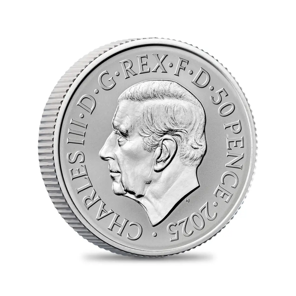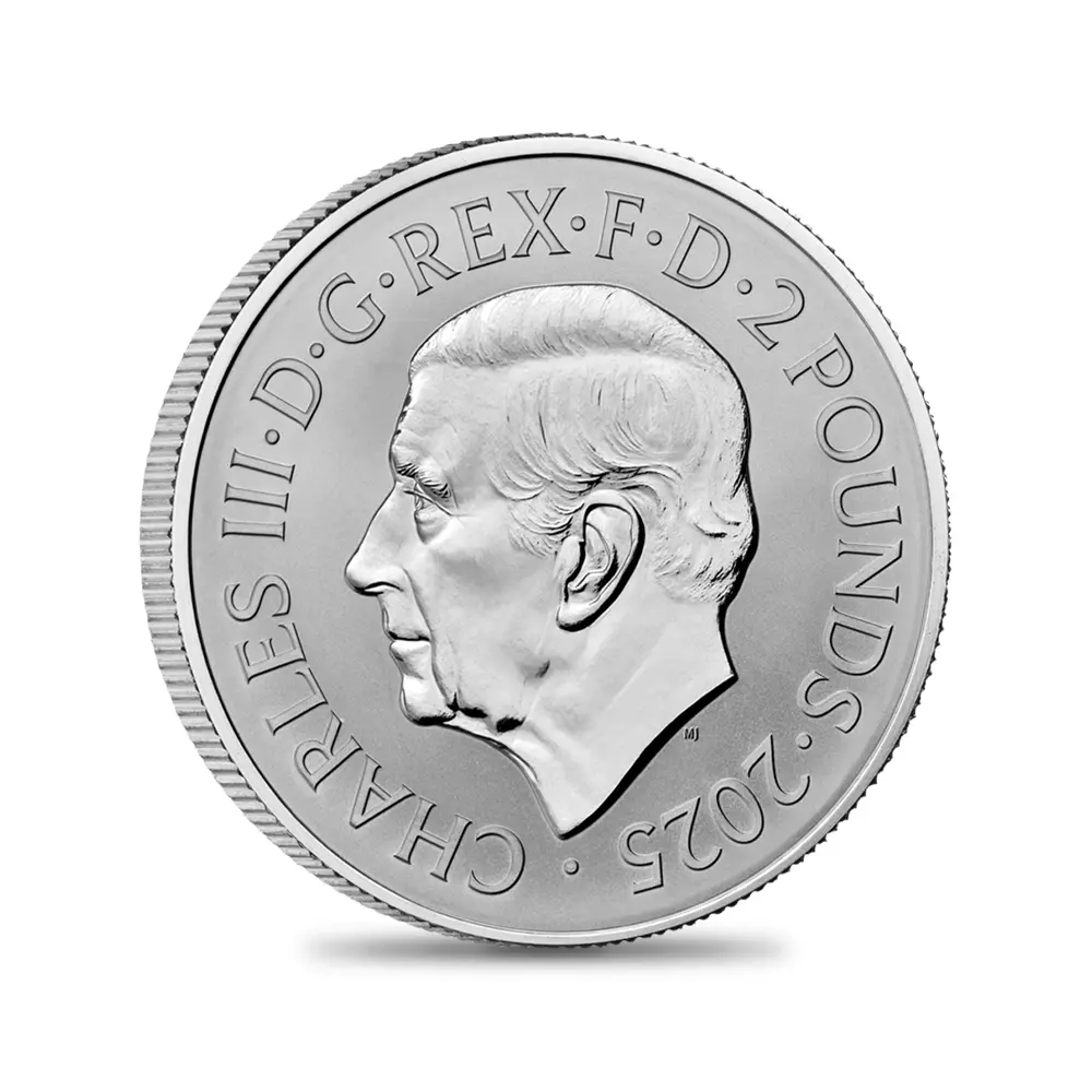 毎年同じデザインによって発行され続けている地金型ブリタニアコインとは異なり、記念コイン版のブリタニアコインは毎年新しいデザインが発表され、世界的な注目を集めています。本年2025年度版のブリタニアコインをご紹介させていただきます。コイン裏面の待望のブリタニア像は毎年新たなデザインによってスポットを浴びますが、本年度のブリタニアは海を背景として正面向きで描かれており、荘厳な印象を我々に与えるものです。正に英国の化身と呼ぶにふさわしい威厳を身にまとった神々しいいまでの存在感が圧巻です。この斬新な意匠は、ロイヤルミントに所属する実力派デザイナーの一人、ブラッドリー・モーガン・ジョンソンが新たに制作したものであり、氏の芸術性とデザイン力を存分に堪能することができる傑出した作品です。コイン裏面には、2023年5月6日に戴冠式が挙行されたばかりの新英国王チャールズ3世の「公式第1コイン肖像」が描かれています。左向きのその穏やかな横顔からは、王の穏やかな人格と世界に関する見識の高さを窺うことが可能です。グレートブリテン島を象徴する女神と王室の権威を表裏に掲げる当コインは、英国にとって伝統の継承がいかに重要であるかを我々に語りかけてくるかのようです。