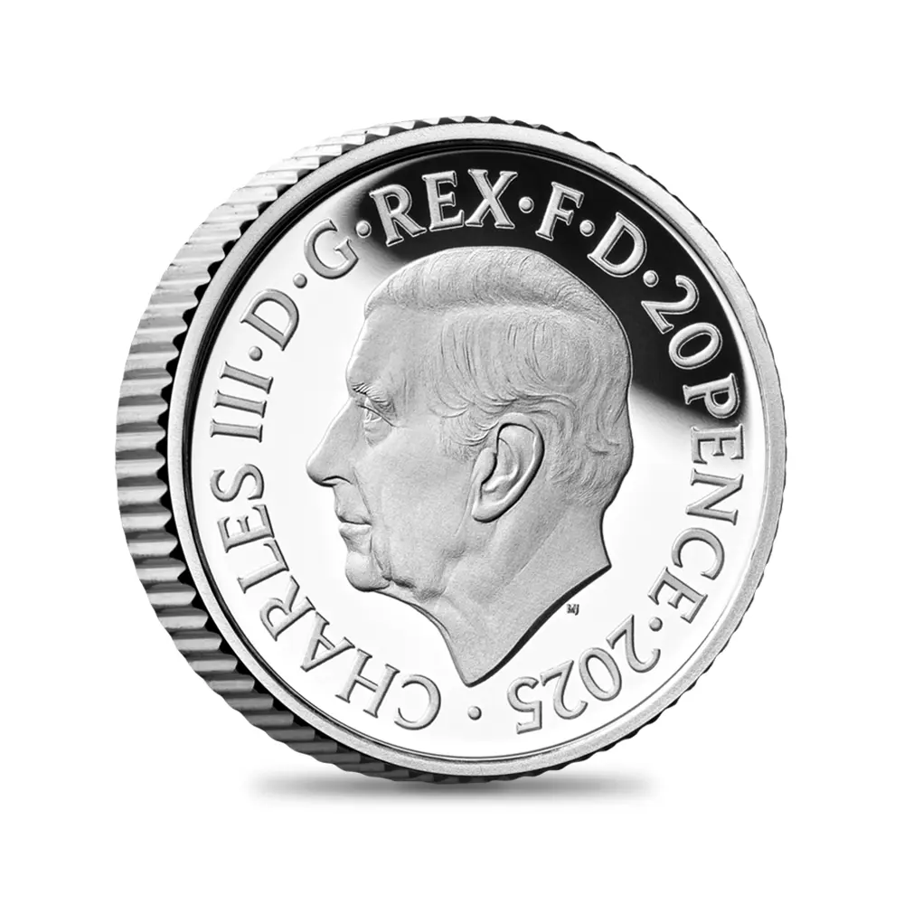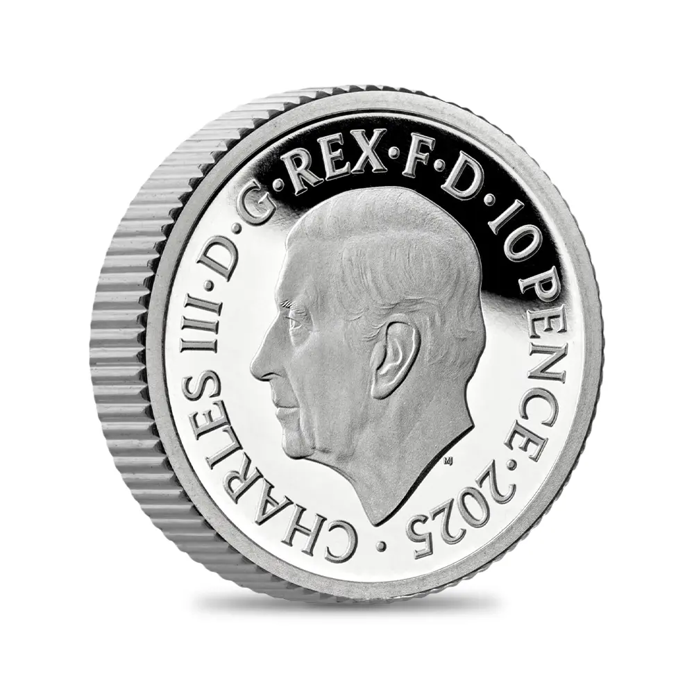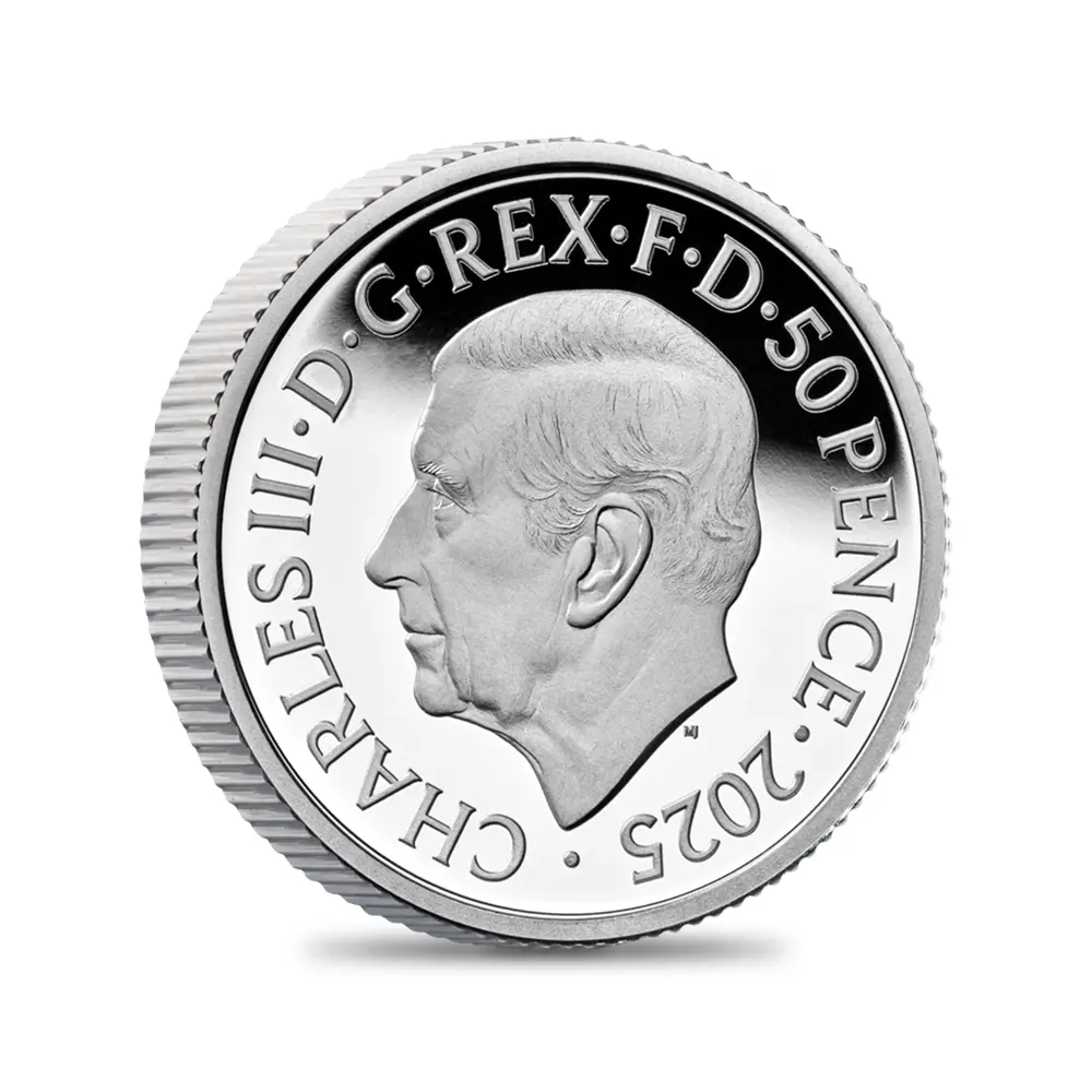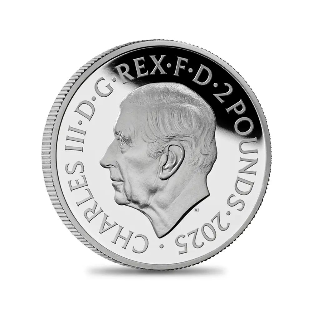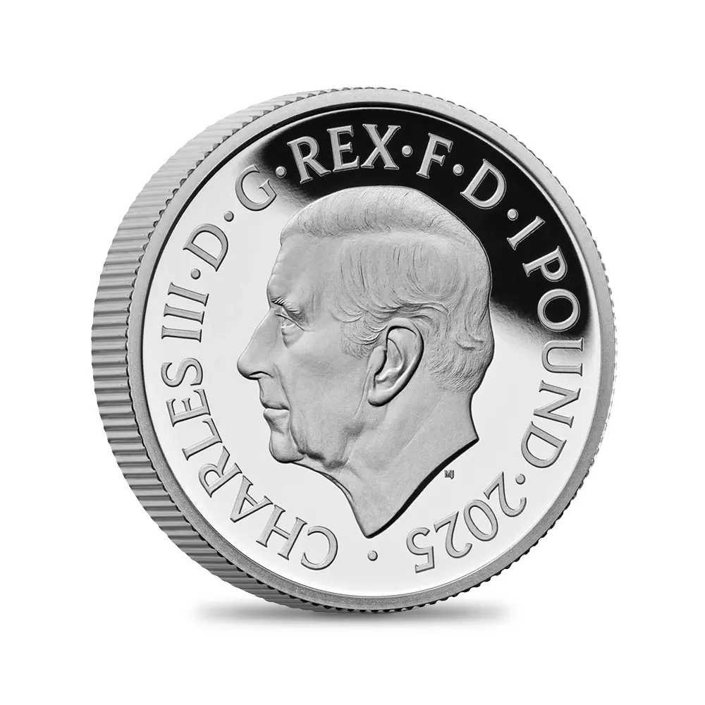 毎年同じデザインによって発行され続けている地金型ブリタニアコインとは異なり、記念コイン版のブリタニアコインは毎年新しいデザインが発表され、世界的な注目を集めています。本年2025年度版のブリタニアコインをご紹介させていただきます。コイン裏面の待望のブリタニア像は毎年新たなデザインによってスポットを浴びますが、本年度のブリタニアは海を背景として正面向きで描かれており、荘厳な印象を我々に与えるものです。正に英国の化身と呼ぶにふさわしい威厳を身にまとった神々しいいまでの存在感が圧巻です。この斬新な意匠は、ロイヤルミントに所属する実力派デザイナーの一人、ブラッドリー・モーガン・ジョンソンが新たに制作したものであり、氏の芸術性とデザイン力を存分に堪能することができる傑出した作品です。コイン裏面には、2023年5月6日に戴冠式が挙行されたばかりの新英国王チャールズ3世の「公式第1コイン肖像」が描かれています。左向きのその穏やかな横顔からは、王の穏やかな人格と世界に関する見識の高さを窺うことが可能です。グレートブリテン島を象徴する女神と王室の権威を表裏に掲げる当コインは、英国にとって伝統の継承がいかに重要であるかを我々に語りかけてくるかのようです。