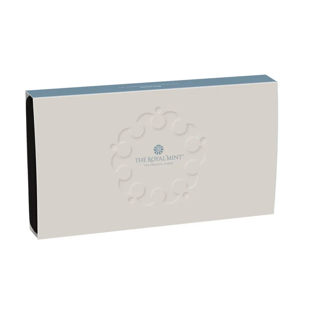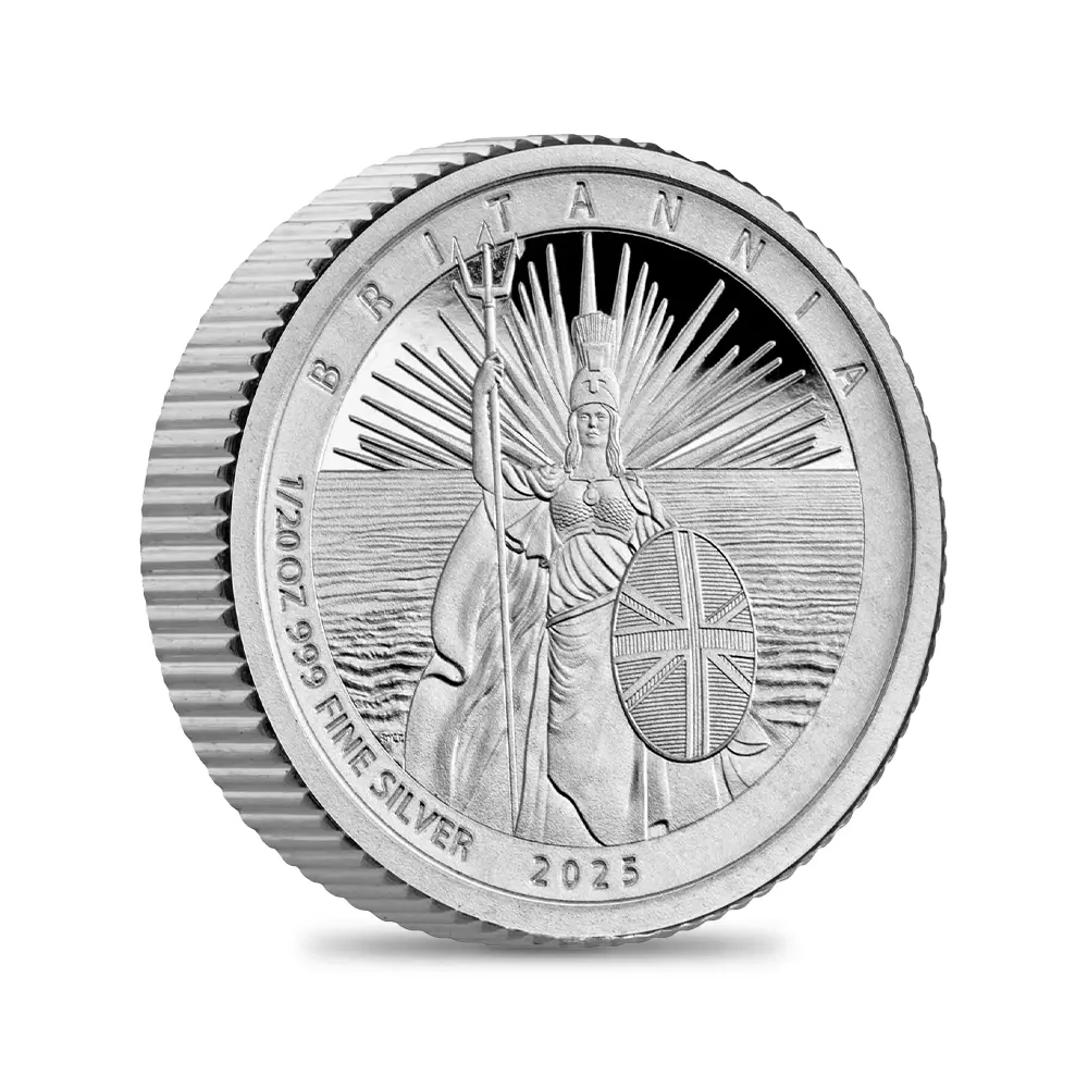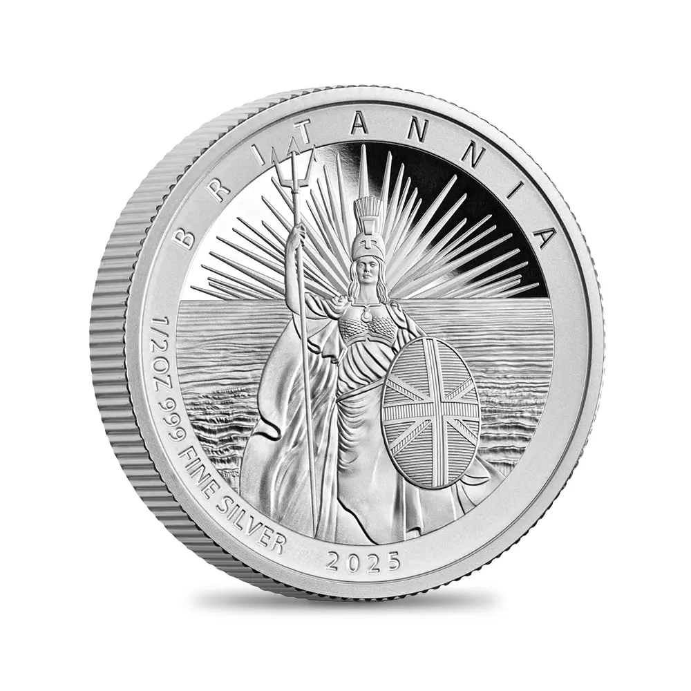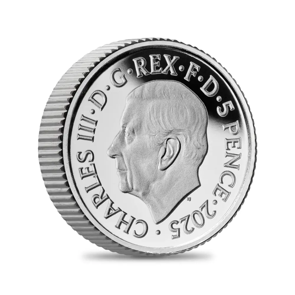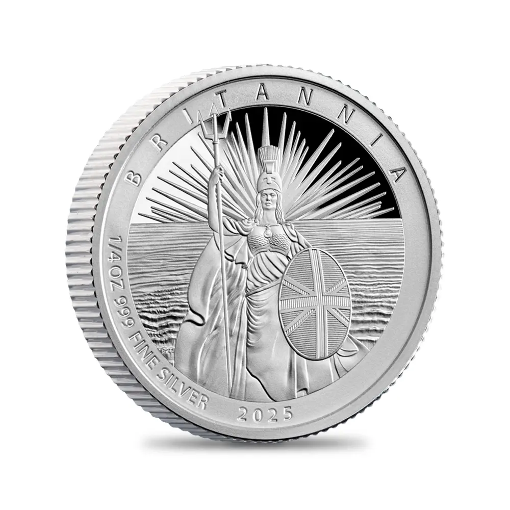 毎年同じデザインによって発行され続けている地金型ブリタニアコインとは異なり、記念コイン版のブリタニアコインは毎年新しいデザインが発表され、世界的な注目を集めています。本年2025年度版のブリタニアコインをご紹介させていただきます。コイン裏面の待望のブリタニア像は毎年新たなデザインによってスポットを浴びますが、本年度のブリタニアは海を背景として正面向きで描かれており、荘厳な印象を我々に与えるものです。正に英国の化身と呼ぶにふさわしい威厳を身にまとった神々しいいまでの存在感が圧巻です。この斬新な意匠は、ロイヤルミントに所属する実力派デザイナーの一人、ブラッドリー・モーガン・ジョンソンが新たに制作したものであり、氏の芸術性とデザイン力を存分に堪能することができる傑出した作品です。コイン裏面には、2023年5月6日に戴冠式が挙行されたばかりの新英国王チャールズ3世の「公式第1コイン肖像」が描かれています。左向きのその穏やかな横顔からは、王の穏やかな人格と世界に関する見識の高さを窺うことが可能です。グレートブリテン島を象徴する女神と王室の権威を表裏に掲げる当コインは、英国にとって伝統の継承がいかに重要であるかを我々に語りかけてくるかのようです。