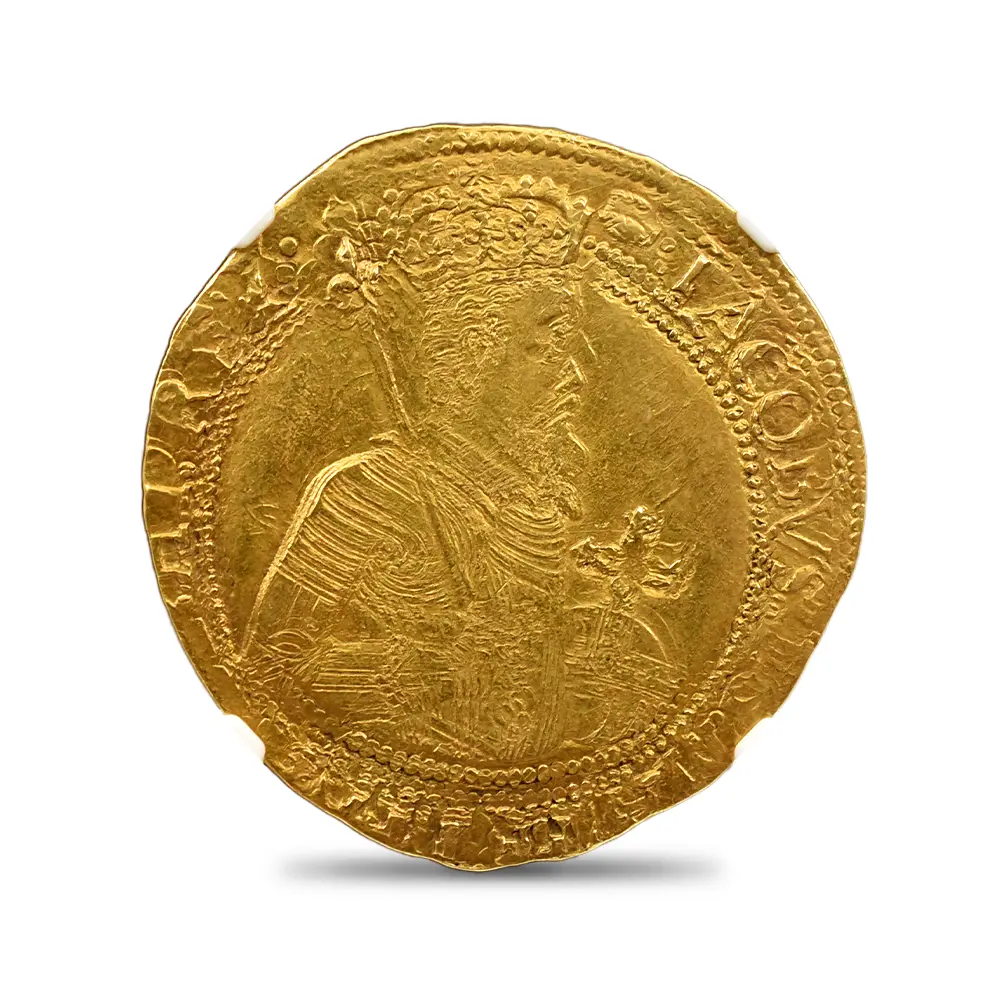 当コインの発行年はおよそ1615年から1616年頃と推定されます。表面には有冠右向きのジェームズ1世の壮麗なコインポートレートが掲げられています。絶対王政の守護者として歴史に名を刻む国王の肖像だけに芸術性豊かに仕上げられており、満艦飾の趣を特徴とする豪華な内容となっています。国王の両手には歴代国王が戴冠式に際して用いる王室祭具の中の宝珠と王笏が見られ、ジェームズ1世の国王としての正当性を強調しています。
