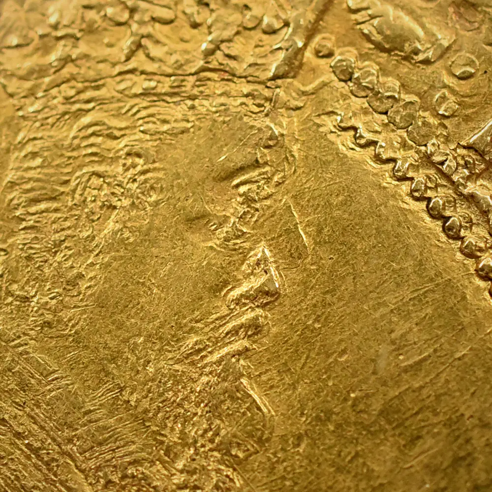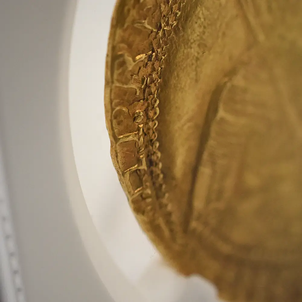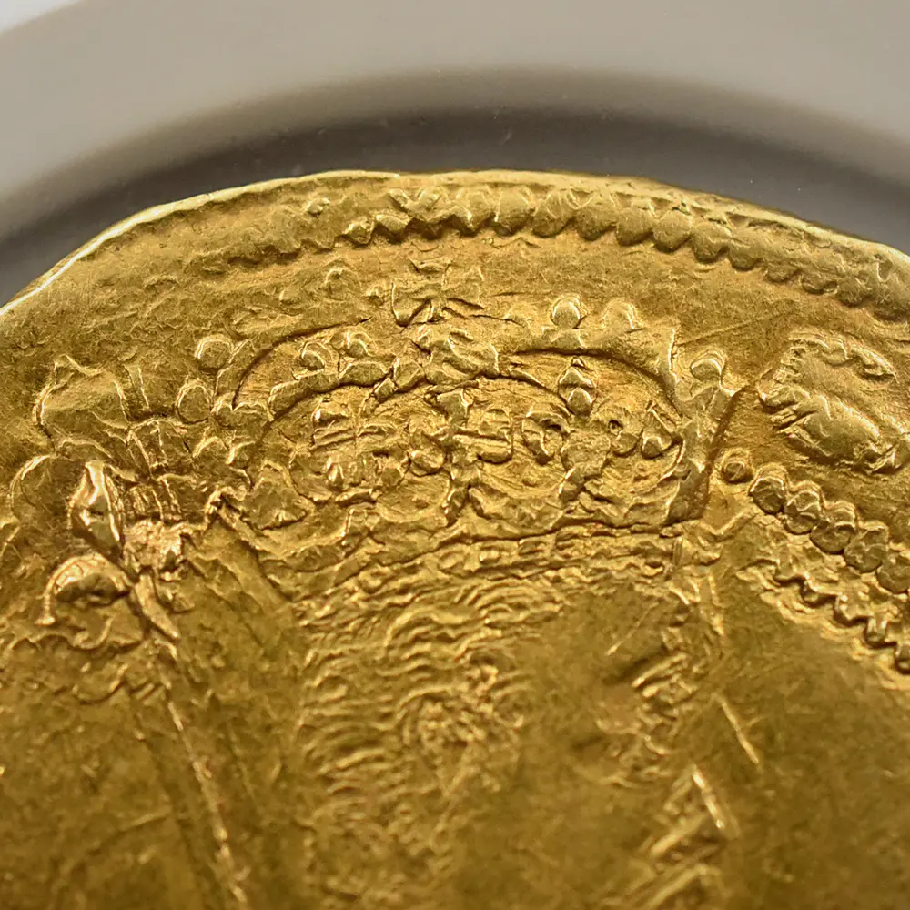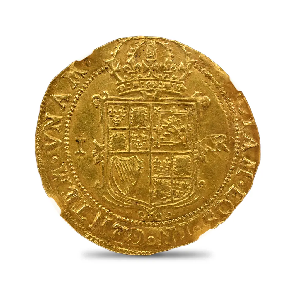 コイン裏面には王が治めたイングランド、スコットランド、アイルランド、フランスの国章を刻む盾形の紋章が掲げられており、その上部の大型の宝冠が王室の権威を余すところなくシンボライズしています。当金貨の「ユナイト」という名称についてですが、統合や統一を意味する語で、イングランド国王となったジェームズ1世が生涯にわたって宿願としたイングランドとスコットランドの連合王国としての統合を祈念して名付けられました。それまでに英国が製造していた法定金貨としては、ソブリン金貨がまず第一に挙げられることと思われますが、ユナイト金貨はそれに代わって誕生した極めて高い精度を誇る法定金貨として知られています。