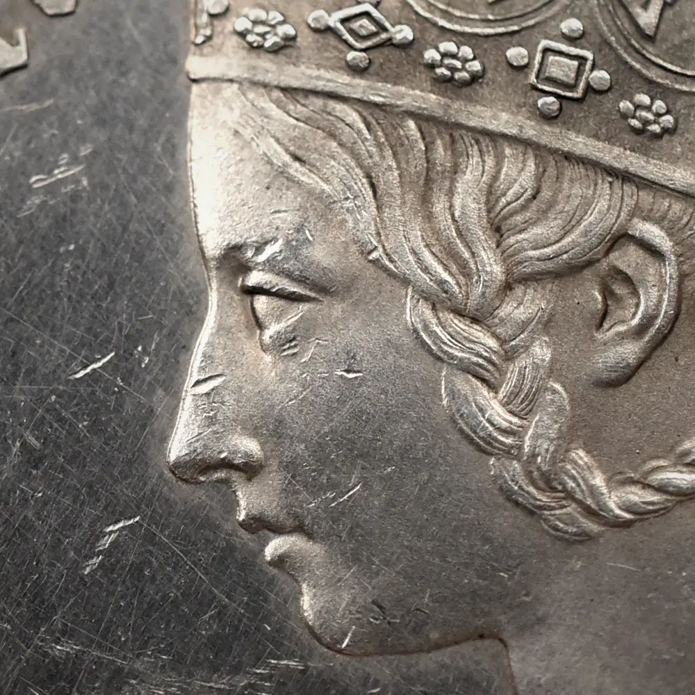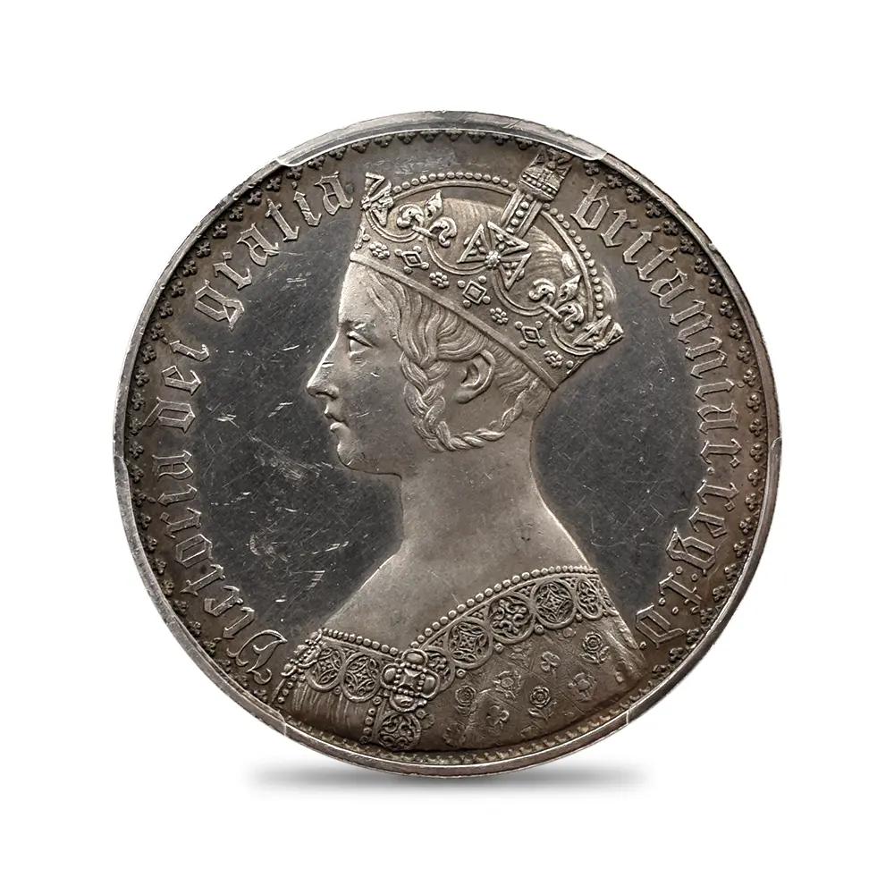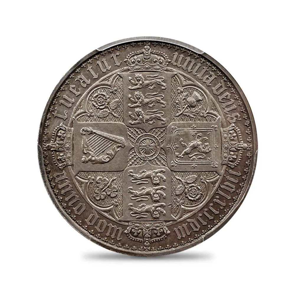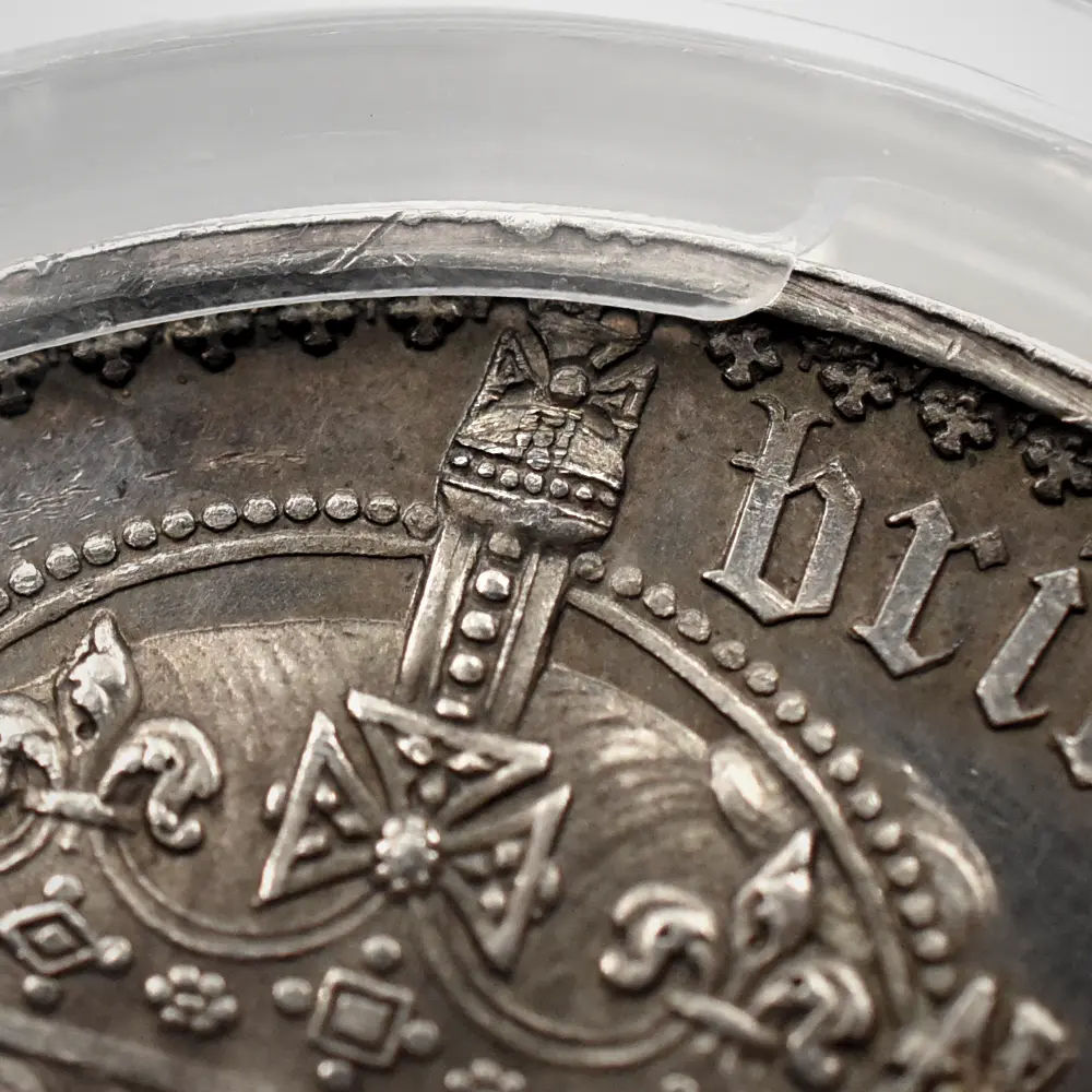 今回ご紹介させていただく作品は、1847年度版「ゴチッククラウン」の純銀プレーンエッジタイプです。このタイプを含めてわずか8000枚の限定発行であったことがよく知られている1847年度版「ゴチッククラウン」。シルバーの劣化の度合いが絶妙グラデーションを見せる当コインは、一世紀以上もの歳月を経て奇跡的に守り抜かれた名品中の名品に該当します。同年度版としましては「プレーンエッジ」と「アンデシモ」の二種のエッジ碑文タイプがよく知られていますが、こちらはシンプルな方で、エッジに碑文は見られません。英国貨幣に特化したオークションの開催によって世界的に知名度の高いスピンク社の書籍「English Silver Coinage」に情報が掲載されている同コインですが、同書籍の最新版によりますと、コインのレアリティー度を示す格付けにおいて上から4番目の稀少度を意味する「R4」が与えられておりコレクションに最適です。これからまだまだ価格の高騰が予測される「ゴチッククラウン」ですが、これらの点が今後の推移に有利に働くことは間違いありません。英国貨幣界を代表するヴィクトリア朝の絶品コイン「ゴチッククラウン」ですが、19世紀イギリスの王朝文化を今日に伝える芸術性豊かな貨幣として細く長く生きながらえて行くことでしょう。