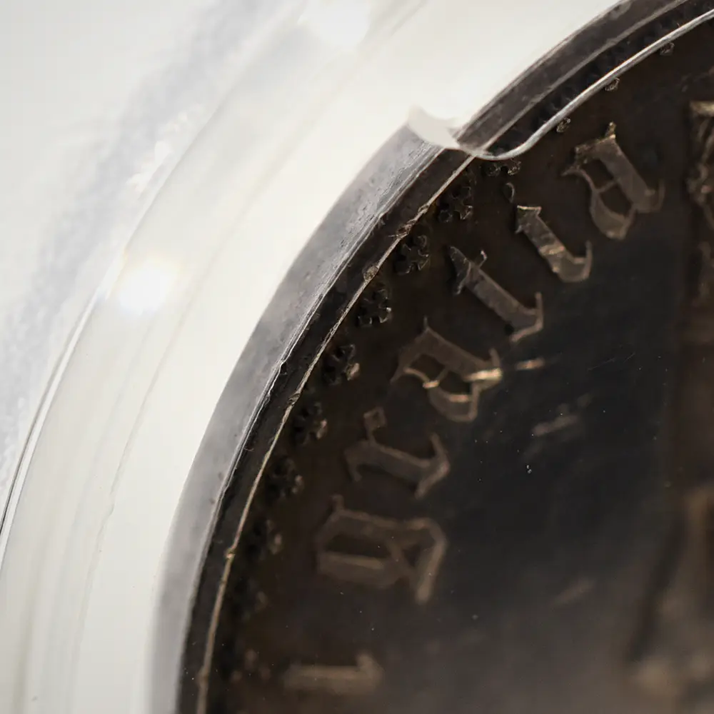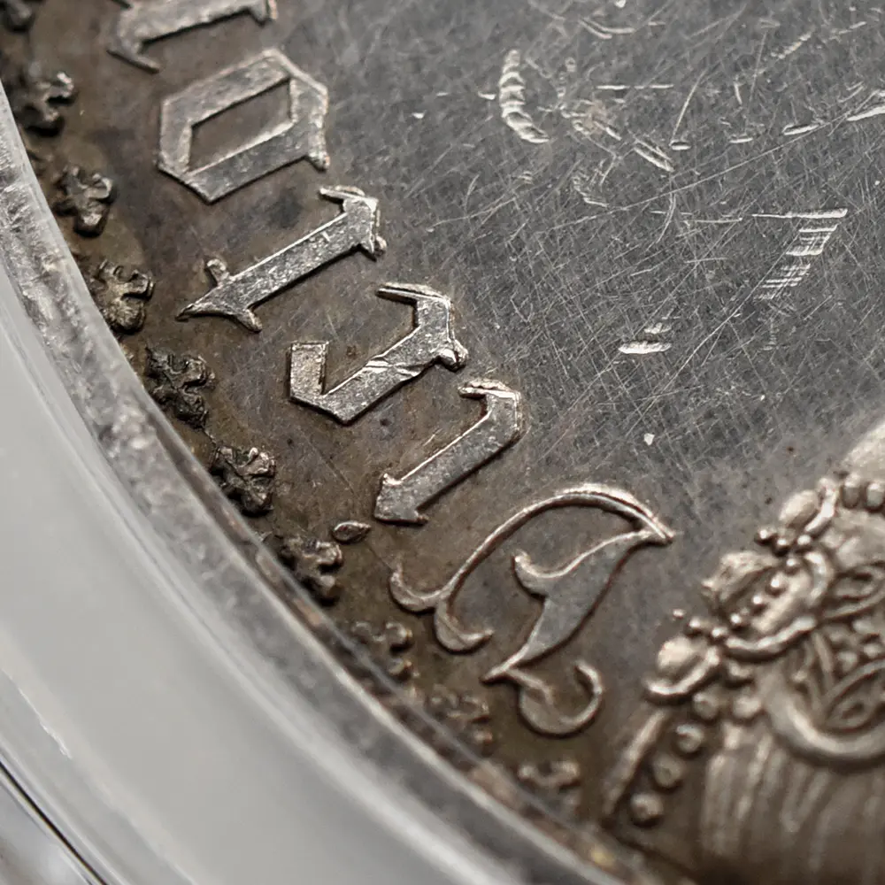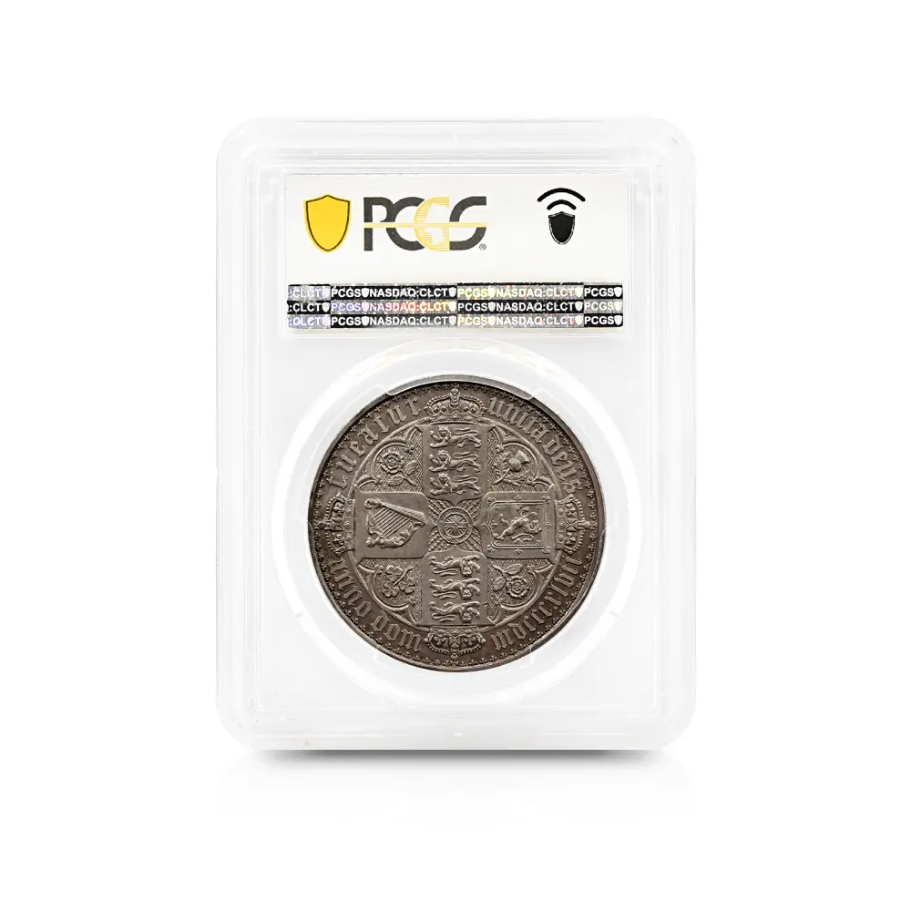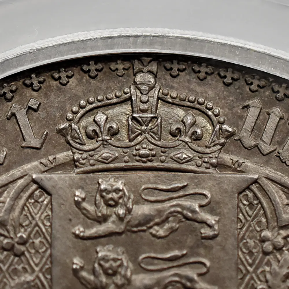 今回ご紹介させていただく作品は、1847年度版「ゴチッククラウン」の純銀プレーンエッジタイプです。このタイプを含めてわずか8000枚の限定発行であったことがよく知られている1847年度版「ゴチッククラウン」。シルバーの劣化の度合いが絶妙グラデーションを見せる当コインは、一世紀以上もの歳月を経て奇跡的に守り抜かれた名品中の名品に該当します。同年度版としましては「プレーンエッジ」と「アンデシモ」の二種のエッジ碑文タイプがよく知られていますが、こちらはシンプルな方で、エッジに碑文は見られません。英国貨幣に特化したオークションの開催によって世界的に知名度の高いスピンク社の書籍「English Silver Coinage」に情報が掲載されている同コインですが、同書籍の最新版によりますと、コインのレアリティー度を示す格付けにおいて上から4番目の稀少度を意味する「R4」が与えられておりコレクションに最適です。これからまだまだ価格の高騰が予測される「ゴチッククラウン」ですが、これらの点が今後の推移に有利に働くことは間違いありません。英国貨幣界を代表するヴィクトリア朝の絶品コイン「ゴチッククラウン」ですが、19世紀イギリスの王朝文化を今日に伝える芸術性豊かな貨幣として細く長く生きながらえて行くことでしょう。