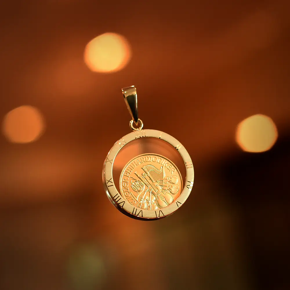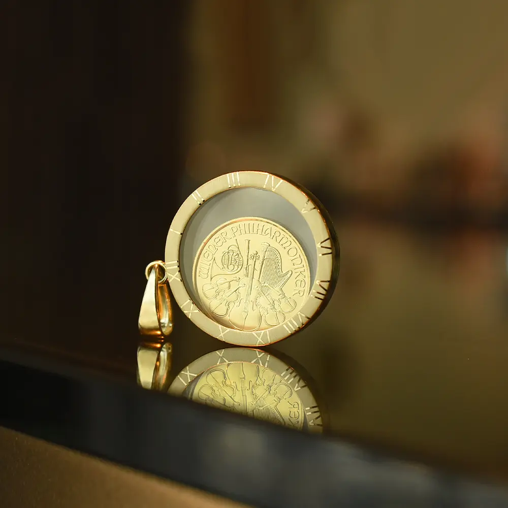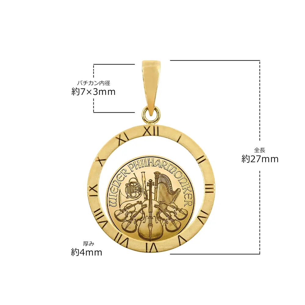 悠久の歴史を誇るオーストリア造幣局が創造した地金型コインの金字塔「ウィーンフィル地金型金貨」。音楽を創造する喜びを感じさせる同金貨両面の名デザインを恒久化する名プロジェクトをここにご紹介させていただきます。世界最高の音色美によって世界中の聴衆を魅了するウィーンフィルの演奏の壮絶な魅力は語り尽くせません。しかしオーストリア造幣局は同楽団の芸術性豊かなサウンドをコイン上にて視覚的に再現することに敢えて挑戦しました。その結果誕生したのが今回ご紹介させていただくウィーンフィル地金型金貨ガラス・フローティング・ペンダントです。コイン裏面にはハープやヴィオラを始めとするオーケストラを構成する管弦楽器がバランスよく配置されていて何度見ても飽きの来ないものです。またコイン表面にはウィーンフィルの本拠であり、ニューイヤーコンサートの会場でもあるウィーン楽友協会黄金の間正面に設置されている巨大なパイプオルガンが掲げられています。ニューイヤーコンサート当日のテレビ放映では色とりどりの花で飾り付けられた同会場内部と客席の様子が頻繁に映し出されますが、当コイン裏面のデザインを見ていますとコンサート会場の華やいだ空気が伝わってくるようです。ちなみに会場の楽友協会ですが、世界で最も音響効果の優れた木造のコンサートホールとして知られており、ニューヨークのカーネギーホールやアムステルダムのコンセルトヘボウと並んで「世界三大コンサートホール」と称され、クラシック音楽ファンにとってはいつの時代も憧れの場所でもあります。当ウィーンフィル地金型金貨ガラス・フローティング・ペンダントは、ニューイヤーコンサートが織り成す美と感動を集約する究極のアクセサリーです。コインデザインの鑑賞を妨げることの無い無色透明なガラス製のシールドは、実物資産としての、また美術品としての当地金型金貨を保護するのに適しているばかりか、内側のコインの心地よい揺れを堪能することも可能としています。またシールドの周囲には時計の文字盤のようなローマ数字が刻まれており、当作品に風格を与えています。実物資産としての金地金のコンディションの保持に優れながらもアクセサリーとしての機能性をも兼備している当ガラス・フローティング・タイプのペンダントは、これまでに空前の人気を博したウィーンフィル地金型金貨の21世紀における進化形として、今後一層の国際的な注目を集めることでしょう。