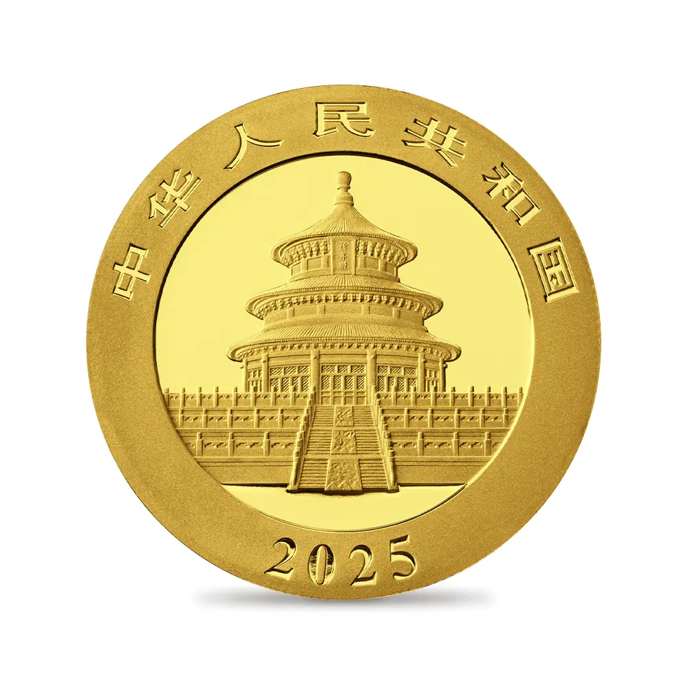 1982年以降毎年発行され、世界的な注目を集める中華人民共和国造幣局による「パンダ地金型コインシリーズ」。過去数十年間に及ぶ同国の経済的飛躍は目覚ましく、その正のイメージを何よりも的確に表現するものとして動物のパンダが取り挙げられることは誠に喜ばしいことと思われます。初発行年以来、同じデザインのみが踏襲されていた中国によるパンダ地金型コインですが、21世紀以降はパンダの成長を描くデザインがシリーズ化されて発表されて好評を博し、毎年異なるデザインによって投資家を始め、世界中のコインコレクターを魅了するようになりました。中国固有の動物として古来人気の高いパンダですが、これまでに中国政府はこの愛らしい動物を用いていわゆる「パンダ外交」を展開してきました。つまり、パンダを他国に貸し出すことによって両国の親善を図るというのが主要な目的であり、いかにパンダが世界的に愛顧の対象となる魅力を備えた動物であるかが分かります。主に笹などを主食とするパンダは、動物学的な分類によりますとジャイアント・パンダのことを指し、同名の他の種として知られるレッサー・パンダとは全く異なる種であることが分かります。コイン表面には、中国北京市に存在する歴史的な寺院として長い歴史を誇る天壇が描かれています。明清両王朝の歴代皇帝が五穀豊穣を祈念して建立したと伝えられるこの建造物は、歴史都市北京の顔として、また同市最大の観光スポットの一つとして注目を集めています。デザイン部の下部には発行年を示す2025の数字が刻まれ、その上部には簡体字によって国名が刻まれています。そして待望の裏面には、母親パンダと共に遊び戯れるかわいい2匹の子パンダたちが描かれており、微笑ましい温かさが同面全体から伝わっています。毎年発表されるパンダの図案は、現代中国の国家的魅力を何よりもシンボライズする表象としての芸術的価値を併せ持つものでもあります。同シリーズの今後の継続がますます楽しみですが、かわいいパンダたちが長きにわたって世界をあまねく魅了することでしょう。