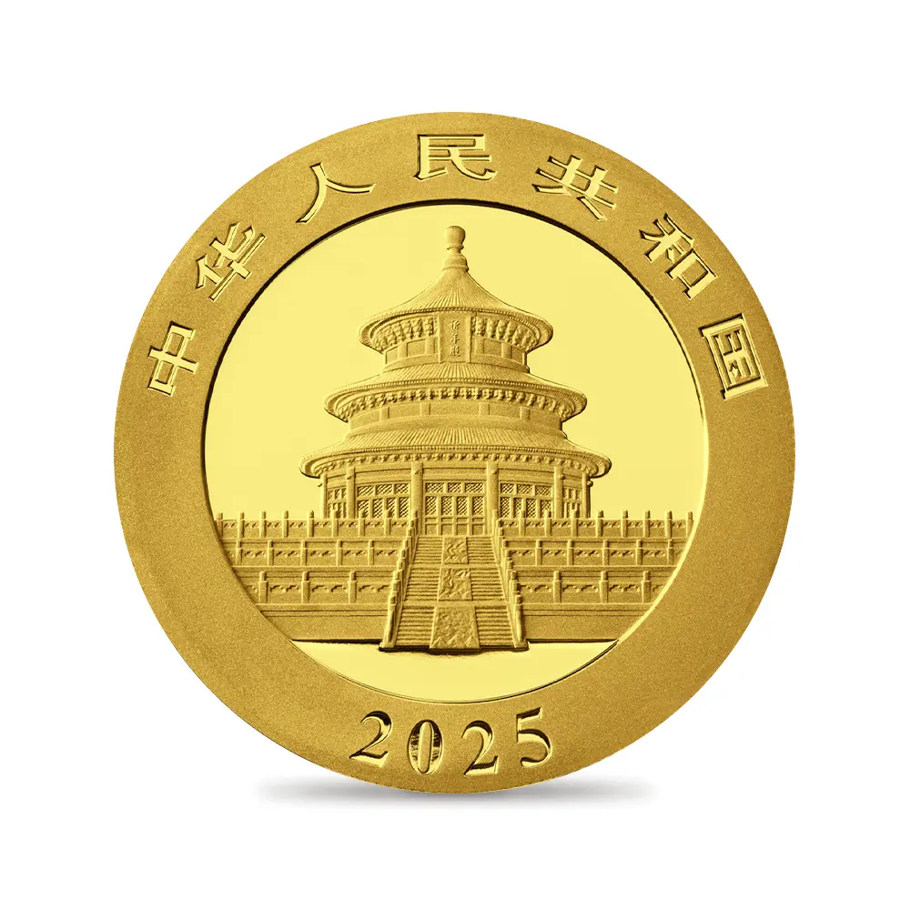 1982年以降毎年発行され、世界的な注目を集める中華人民共和国造幣局による「パンダ地金型コインシリーズ」。過去数十年間に及ぶ同国の経済的飛躍は目覚ましく、その正のイメージを何よりも的確に表現するものとして動物のパンダが取り挙げられることは誠に喜ばしいことと思われます。初発行年以来、同じデザインのみが踏襲されていた中国によるパンダ地金型コインですが、21世紀以降はパンダの成長を描くデザインがシリーズ化されて発表されて好評を博し、毎年異なるデザインによって投資家を始め、世界中のコインコレクターを魅了するようになりました。中国固有の動物として古来人気の高いパンダですが、これまでに中国政府はこの愛らしい動物を用いていわゆる「パンダ外交」を展開してきました。つまり、パンダを他国に貸し出すことによって両国の親善を図るというのが主要な目的であり、いかにパンダが世界的に愛顧の対象となる魅力を備えた動物であるかが分かります。主に笹などを主食とするパンダは、動物学的な分類によりますとジャイアント・パンダのことを指し、同名の他の種として知られるレッサー・パンダとは全く異なる種であることが分かります。コイン表面には、中国北京市に存在する歴史的な寺院として長い歴史を誇る天壇が描かれています。明清両王朝の歴代皇帝が五穀豊穣を祈念して建立したと伝えられるこの建造物は、歴史都市北京の顔として、また同市最大の観光スポットの一つとして注目を集めています。デザイン部の下部には発行年を示す2025の数字が刻まれ、その上部には簡体字によって国名が刻まれています。そして待望の裏面には、母親パンダと共に遊び戯れるかわいい2匹の子パンダたちが描かれており、微笑ましい温かさが同面全体から伝わっています。毎年発表されるパンダの図案は、現代中国の国家的魅力を何よりもシンボライズする表象としての芸術的価値を併せ持つものでもあります。同シリーズの今後の継続がますます楽しみですが、かわいいパンダたちが長きにわたって世界をあまねく魅了することでしょう。