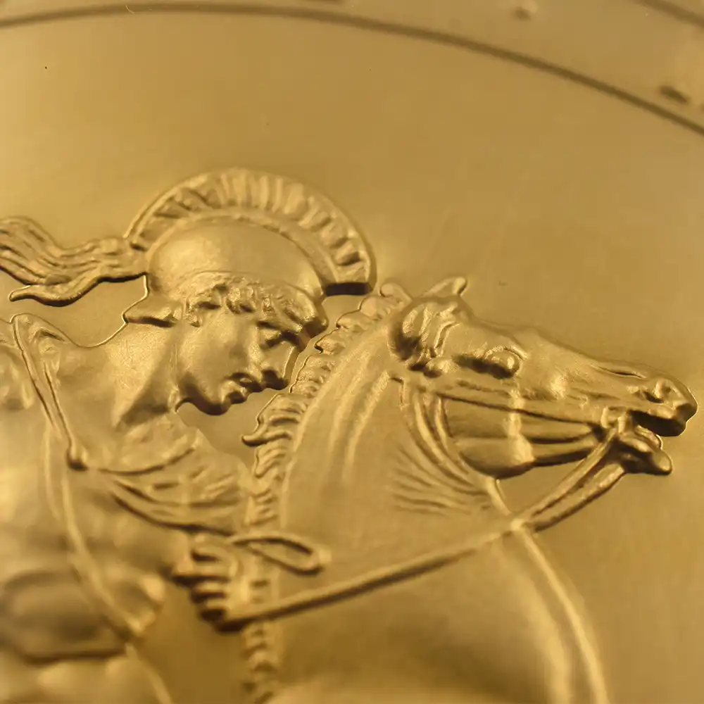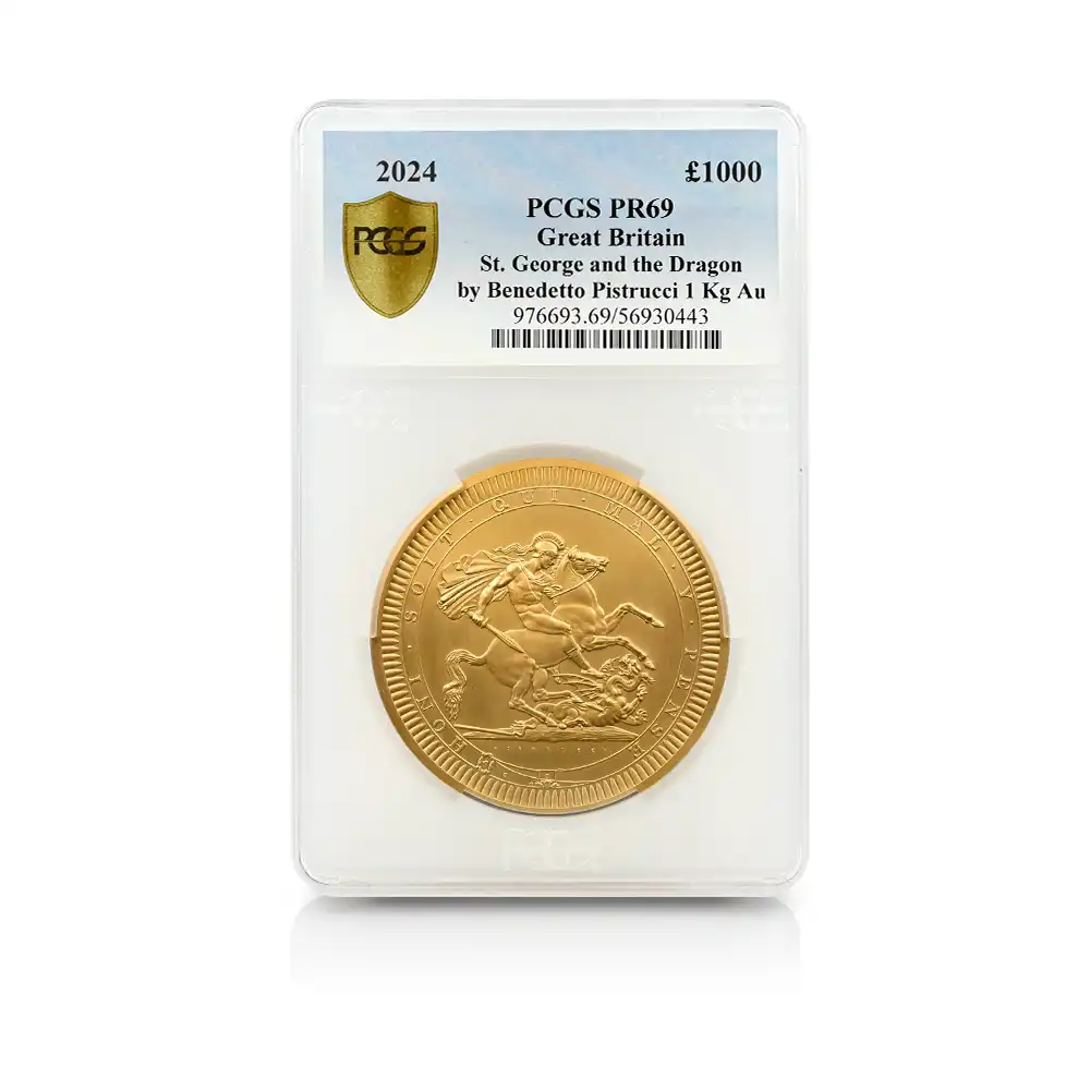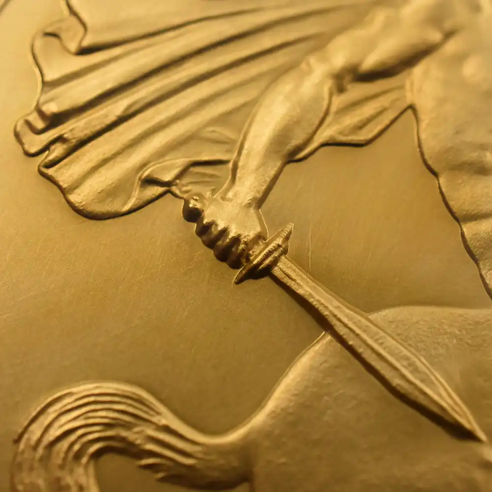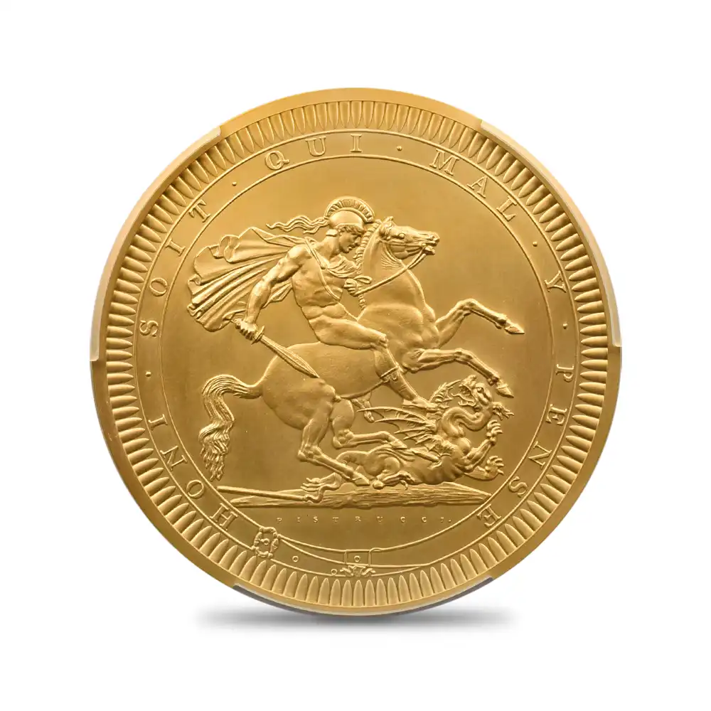 ©The Royal Mint 2022年9月8日のエリザベス2世の崩御に際して英国王位を継承した新国王チャールズ3世。「偉大なる彫刻家コレクション」の第4弾「ペティションクラウン」は、新国王を迎えたばかりの英国貨幣界が、モダンコイン屈指の人気コインシリーズの最新作として世に贈り、絶賛されました。それに続いてこの度解禁されることとなった第5弾は、ワイオンと並んで19世紀初頭の英国貨幣界を牽引した偉大なる彫刻家、ベネデット・ピストゥルッチ(1783-1855)の最高傑作「聖ジョージの竜退治」に捧げられます。ナポレオン戦争後の混乱の中、底知れぬ才能を秘めたこのイタリア人芸術家は、当時のロイヤルミント主任の招きに応じてイングランドに移り住み、そこを終生の地としました。ピストゥルッチの卓越した技量は当時のロンドンの上流階級の顧客層の愛顧を得て広まり、世に出たばかりのワイオンの職人技と双璧を成すほどに高く評価されていました。しかし二者の作風そのものは比較できない程に異なるものであり、また個性的でもありました。偉大なるコイン彫刻家一族の末裔として世に出たワイオンは生まれながらの職人肌の彫刻家であり、その仕事は非常に着実で安定していたと言われています。一方、ピストゥルッチはと言いますと、どちらかと言うと天才型の芸術家で、閃きに満ちた底光りするような強烈な作風を特徴としていました。ピストゥルッチが「聖ジョージの竜退治」の意匠を創造した頃の英国社会は、未だナポレオン戦争後の経済的荒廃から完全に脱却できていなかったものの、ロイヤルミントを中心とする英国貨幣界は金本位制を主軸とする新たな貨幣改革を推進する兆しを見せ始めていました。そのような社会背景の下に、一連の新たな貨幣の発行が急がれましたが、それらの新貨幣のデザインの一つとして採用されたのがこのピストゥルッチの「聖ジョージの竜退治」でした。古代ローマ時代の伝説の聖人ゲオルギウスの竜退治の場面を描くこの意匠は、古今東西の傑作コインの主題の中でも驚異的な人気を誇るものであり、同コレクションの第5弾として相応しいものであると言えます。また、ウィリアム・ワイオンとトマス・サイモンに続いて、ベネデット・ピストゥルッチの作品が選定されたことによって、歴史的コインコレクションとしての意義を強調しています。槍で悪の象徴であるドラゴンを退治する馬上の聖人の颯爽たる姿を、英国君主の仮の姿と見なすことも可能です。当復刻版の表面には、2023年5月6日に戴冠式を挙行したチャールズ3世の様式感溢れる「公式第1コイン肖像」が描かれています。コイン表裏に英国君主の威厳を掲げる当コインは、今日まで途切れることなく脈々と受け継がれてきた英国王室の未来永劫の安泰を象徴する新時代の傑作であると言えます。