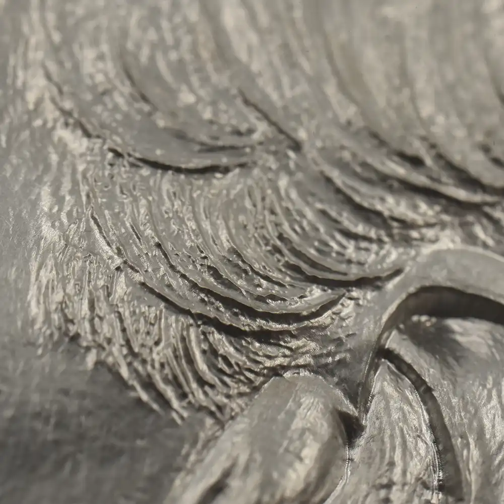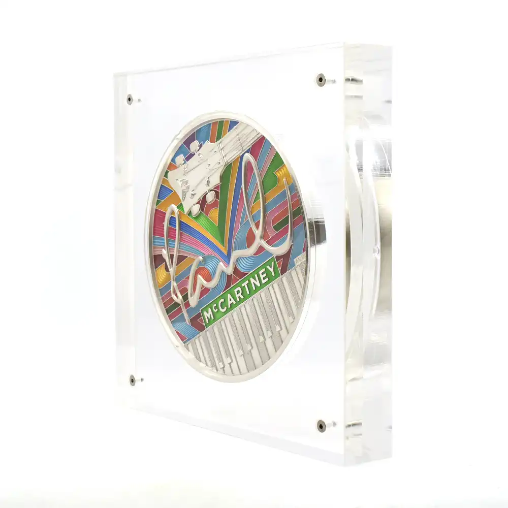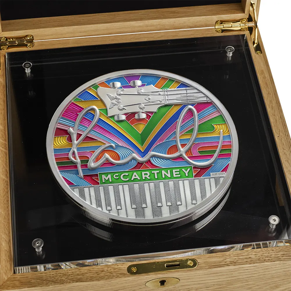 特別版専用ケースにはポール自身のサイン入りの真贋証明書が収められています。そしてコイン表面には、彼とほぼ同時代に若き日を送った現英国王チャールズ3世の「公式第1コイン肖像」が掲げられています。現代屈指のコイン肖像の一つに数えられるこの秀逸な作品は、2022年の代替わりに際して連合王国内のほぼすべての流通貨と記念貨の表面を飾ることになりました。現代ロイヤルミントを代表する名彫刻家の一人であるマーティン・ジェニングスの最高傑作とされるこのポートレートは、王族としてのチャールズ国王というよりは、一人の人間としての国王の温かさを前面に押し出した佳作であり、21世紀の新たな伝説の登場というより他はない出来栄えを誇るものです。そしてこの国王の肖像は、「ミュージック・レジェンド・コレクション」のこれまでの作品に対してと同じく、イギリスから世界に羽ばたき成功を収めた稀代のアーティスト、ポール・マッカートニーへの敬意と、その音楽性が世界に及ぼした功績に対する承認を強調する役割を果たしているように思われます。真に偉大なミュージシャンの音楽性を表現する色彩豊かな5キロの銀塊をどうぞ手に取ってお楽しみください。