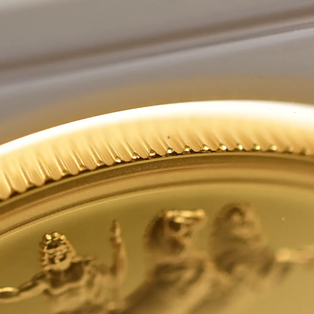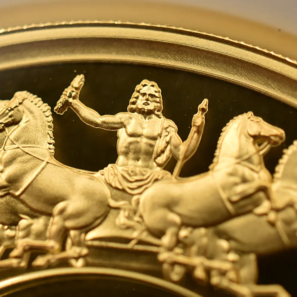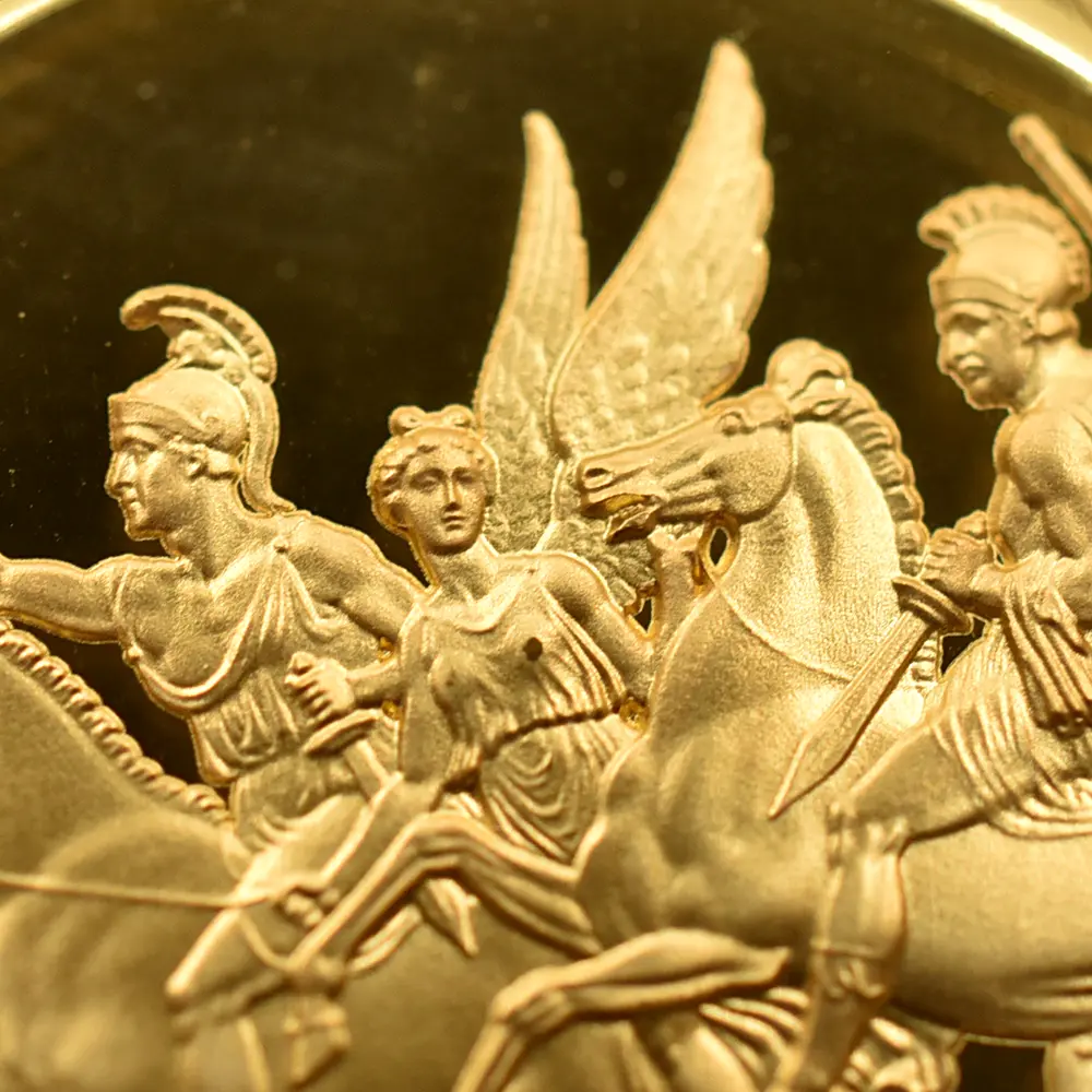 ©第6弾-連合国代表 & 第7弾-勝利 これまでに過去の歴史的なコインやメダルのデザインを復刻し、シリーズ化されたコレクションとしては傑出した成功を収めた「偉大なる彫刻家シリーズ」。とりわけ第1弾の「ウナとライオン」は高い評価を獲得し、単独でのモダンコインとしては短期間での好調な相場高騰を実現しました。その後も「スリーグレーセス」や「ゴチッククラウン」などの古典的な名作を次々と世に送り出した同シリーズでしたが、第6弾にして初となる古今東西のメダルの傑作「ワーテルロー・メダル」の解禁は、歴史的にも名高い同作品初のモダンコイン化ということで各界からの例外的な注目を集めました。19世紀初頭のナポレオン戦争における連合国側の勝利を浮き彫りにする同メダルの繊細華麗なデザインは、ウィリアム・ワイオン(1795-1851)と並んで19世紀初頭の英国貨幣界での人気を二分したイタリア・ローマ出身の大彫刻家ベネデット・ピストゥルッチ(1783=1855)が30年以上もの歳月をかけて完成させた第一級の芸術作品です。2024年に先にリマスターされた同メダル表面のデザインは、ナポレオン戦争の終盤戦に当たるワーテルローの戦いにおけるイギリス軍の圧倒的勝利を意匠化したもので、当時イギリスの摂政王太子であったジョージ4世とロシア皇帝アレクサンドル1世と並んで、連合国側の中枢として参加したオーストリア・プロイセン両国軍の代表の横顔が刻まれていて壮観の趣です。古代戦車チャリオットを様々なバリエーションによって描く周囲のデザインも見事であり、ピストゥルッチならではの美意識と表現力を感じさせます。19世紀初頭から10年以上もの長期戦となったナポレオン戦争が1815年のワーテルローの戦いによって閉幕を迎えた史実は、今もなお英国軍の勝利と共に伝説として語り継がれていますが、この優れた劇的効果を特徴とするデザインが通常の記念コイン上にではなく、より三次元的な立体性を可能とするメダルとして発表された点に大いなる意義を見出さずにはいられません。そしてこの度、同メダルのオリジナル裏面の意匠が「偉大なる彫刻家シリーズ」の第7弾として華々しくリリースされるに至ったことは。英国貨幣界の快挙として長きにわたって語り継がれることと思われます。