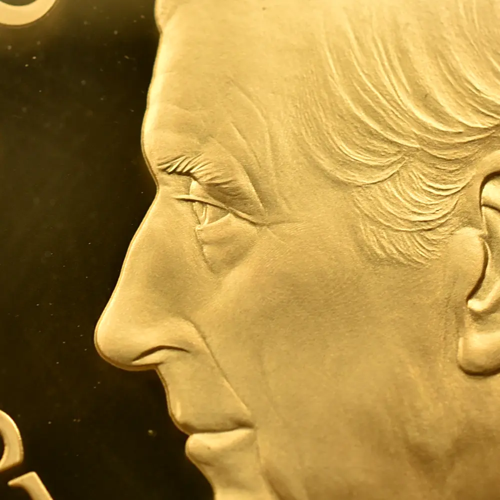 作品表面には、2022年9月の代替わりに際して英国王位を継承したチャールズ3世の「公式第1コイン肖像」が掲げられています。左向きの国王のポートレートからは、愁いを湛えた静寂感のある気品が感じられ、優れた油彩画に見入るような感覚を覚えます。写真のような写実性を見せる同作品は、21世紀初頭を代表するコイン肖像の傑作として、今後長きにわたって高評価を保持し続けることでしょう。栄光の足跡を裏面に刻む同メダルの解禁は、第6弾として先に発表された同メダル表面の意匠と共に、英国貨幣界の新たな伝説として今後脈々と継承されて行くことでしょう。