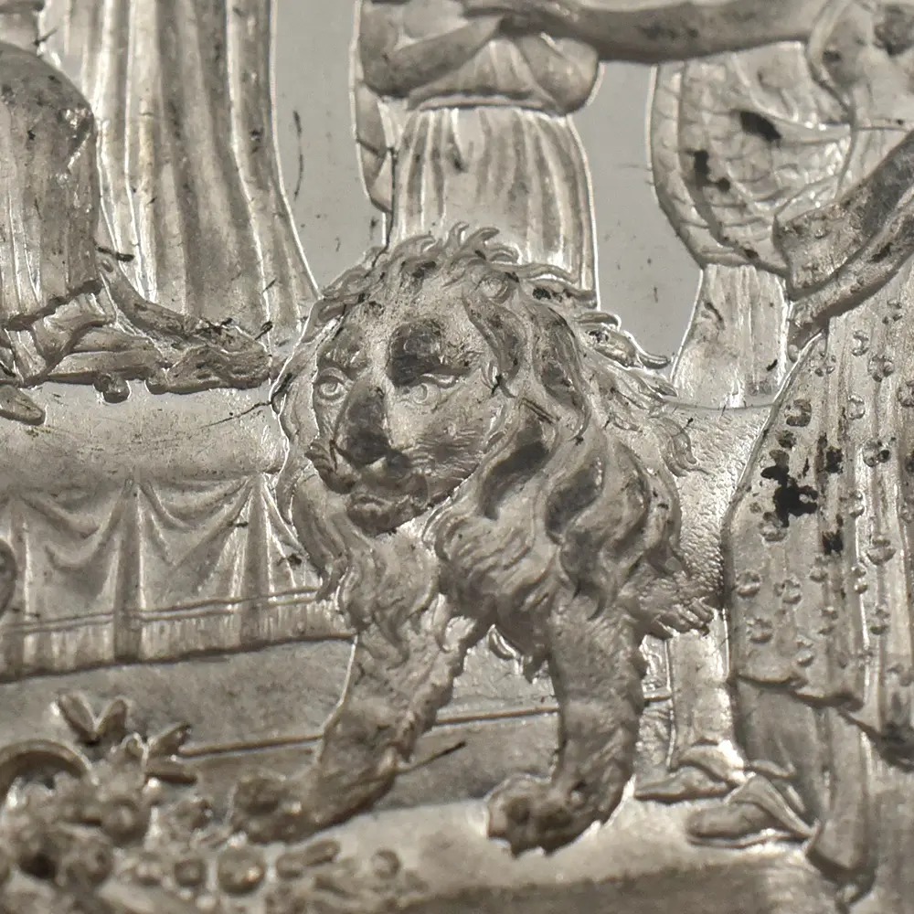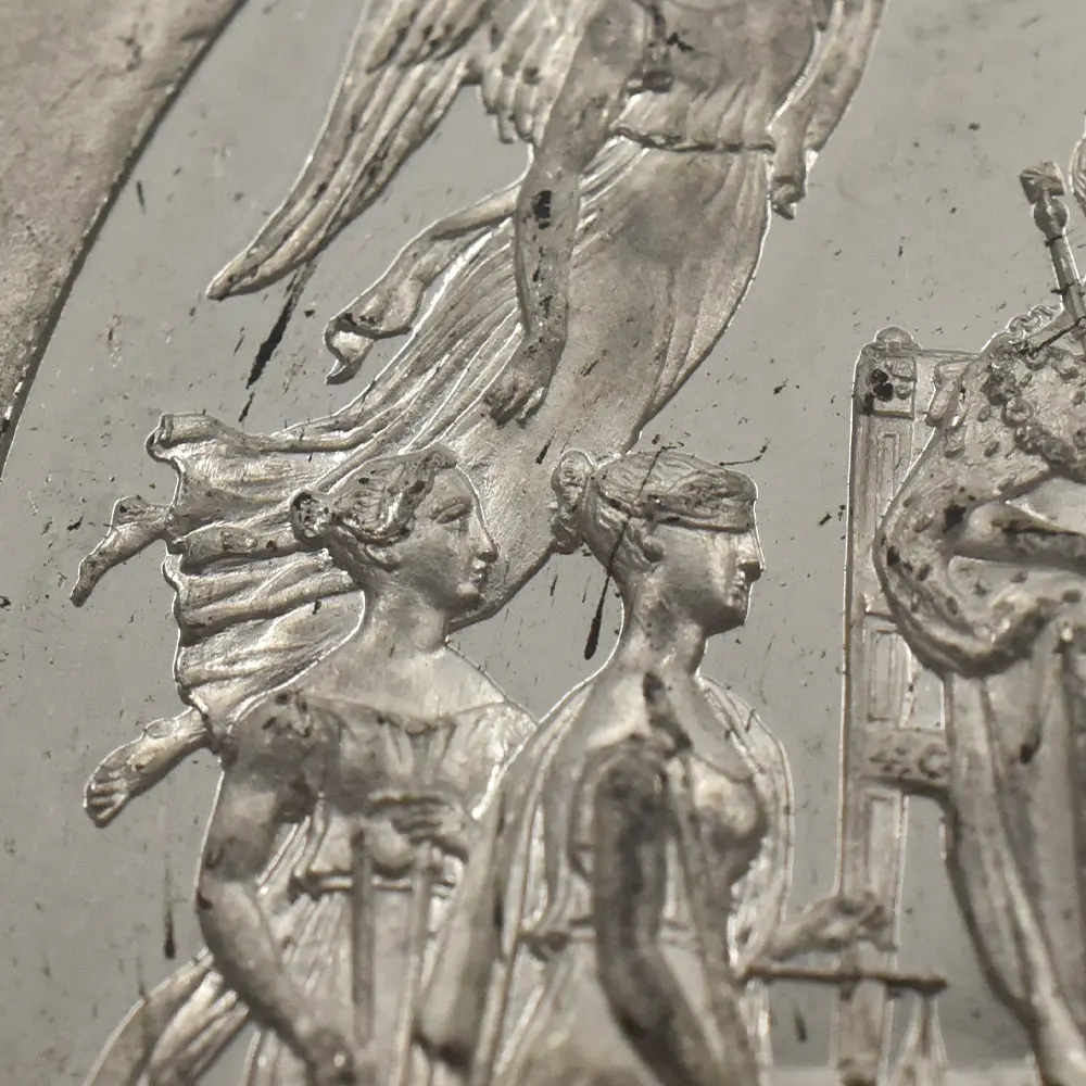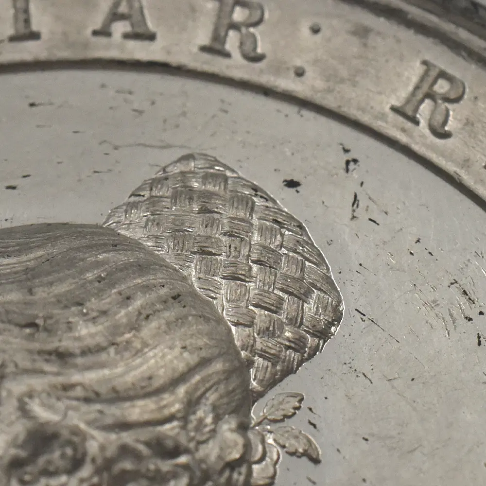 今回ご紹介させていただく作品は、ヴィクトリア女王の即位の翌年、1838年に挙行された戴冠式を祝して発行された戴冠記念メダルです。当時としても大変珍しいホワイトメタル(錫の化合物)を素材とするアニバーサリーメダルの好例であり、独特の素材感がデザインの秀逸性を効果的に浮き彫りにしている芸術作品でもあります。ヴィクトリア女王の公式コイン肖像は63年の治世下において全3種が発表されており、それらの中でも「ヤングヘッド」の通称で知られている「第1肖像」は、18歳当時の女王の瑞々しい横顔を浮かび上がらせる魅力的なポートレートとして、今日なおも絶大なる人気を誇る傑作です。当コインポートレートにも確かに「ヤングヘッド」との類似性が認められますが、頭の後ろで束ねられたシニョンと草花を編んで作ったリース(花輪)を頭上に冠する点が当ポートレート独自の特徴であり、また眼目となっています。肖像の周囲には格調高いラテン語の碑文が刻まれており、「神の恩寵によるヴィクトリア・大英帝国女王」と読むことができます。また裏面にはブリタニア等の女神たちとライオンに見守られて王冠を戴く女王の座像が中央に位置し、英国史上の一大イベントとしてのヴィクトリア女王の戴冠式の様子を精密に図案化しています。ラッパなどの楽器を携えて空中を飛翔する天使の姿が場面全体に華を添えています。裏面上部には「ヴィクトリア大英帝国女王陛下」の一文が見られ、さらに下部には女王の誕生年月日1819年5月24日の日付と、即位した1839年6月20日の日付が刻印されています。その後の女王の治世の安泰を何よりも予見させるこの装飾性豊かな意匠は、若年にして大英帝国を率いることになった偉大なる君主の思い出に捧げられるヴィクトリアン・アンティークメダルの知られざる名品に違いありません。