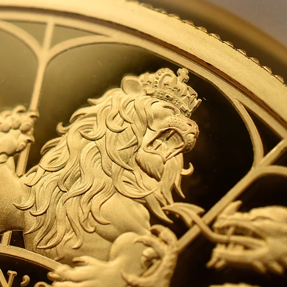 今や伝説であると言っても過言では無いウェストミンスター寺院を会場とした1953年のエリザベス2世の戴冠式ですが、当日、寺院のエントランスの両側に歴代英国君主を代々守護すると伝えられる全10種の守護獣の彫像が建立されていたことを記憶している人は今日、意外と少ないかもしれません。架空と実在から成るこれらの動物たちは中世以降の各王朝時代を象徴するシンボルとして誕生し、王の居住空間を彩る図案に姿を変え、主に紋章や装飾用として用いられていました。その中でも特に有名なものとしては「イングランドのライオン」が挙げられますが、これは頭上に王冠を戴く格調の高い守護獣であり、その誕生以来、全英国史を通じて歴代国王の愛顧を受け今日に至ります。それぞれの動物がある一つの王朝の特定の国王と結びついていることを最大の特徴とすることから、いかに長い年月にわたってこれらが英国王室によって重用されてきたかを伺い知ることができます。今回ご紹介させていただく作品は、近年最大の成功を収めたこれら10種の守護獣を個々に描く英国モダンコイン・シリーズの大作「クイーンズビースト・コレクション」の最終章として発表された「コンプリ―ター=完全版」のタイトルで知られる名品です。全10種がリリースされた後の発表となったこのコイン上には守護獣全10種網羅されていることから、2021年度の英国モダンコイン界最大の話題となったことは記憶に新しく残っています。同シリーズの個々のコインのデザインによって完全にコインファンの心を掴んだ英国ロイヤルミントの若き俊英にして名デザイナー、ジョディ―・クラークに再び白羽の矢が立つことになりましたが、この完全版において彼は実に斬新なテクニックを披露するに至りました。中央にはエリザベス2世の肖像を据え、その周囲を10大守護獣が取り囲むというかつて無いほどに鮮烈なアプローチは、歴史と伝統を誇る英国貨幣界の新たな伝説となりました。1953年の戴冠式に際してエリザベス2世が相続することになったこれら10種の守護獣は、英国史上初の試みとなる当コインの発行によって一つの作品として完結し、恒久化される運びとなりました。1000年以上もの長大なる歴史を誇る英国王室を象徴する当コインは、同じ歳月をコインの鋳造に捧げて来たロイヤルミントの栄光の歴史を称える記念品でもあります。ここに現代英国貨幣界屈指の極品が遂に日の目を見ることとなりました。