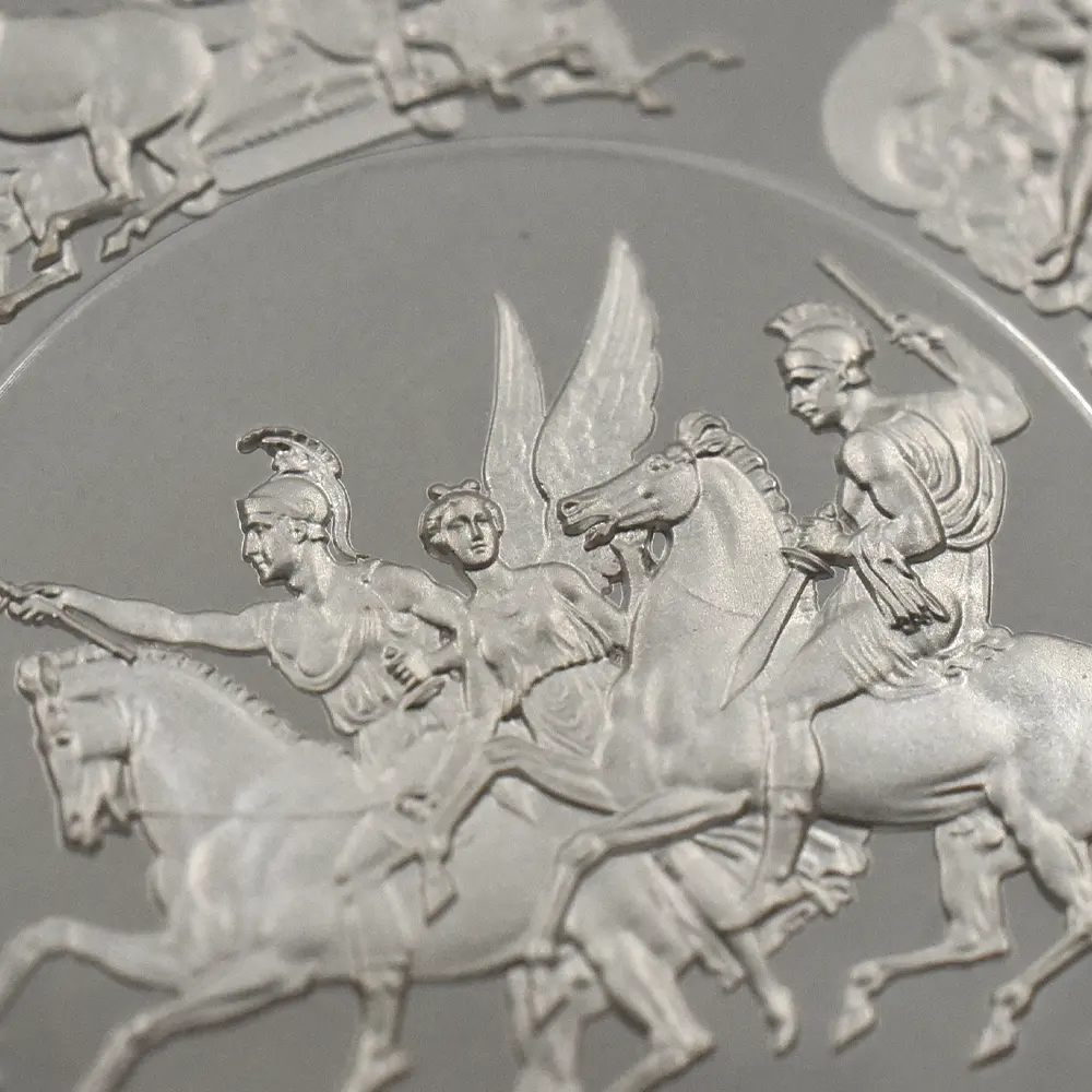 ©第6弾-連合国代表 & 第7弾-勝利 これまでに過去の歴史的なコインやメダルのデザインを復刻し、シリーズ化されたコレクションとしては傑出した成功を収めた「偉大なる彫刻家シリーズ」。とりわけ第1弾の「ウナとライオン」は高い評価を獲得し、単独でのモダンコインとしては短期間での好調な相場高騰を実現しました。その後も「スリーグレーセス」や「ゴチッククラウン」などの古典的な名作を次々と世に送り出した同シリーズでしたが、第6弾にして初となる古今東西のメダルの傑作「ワーテルロー・メダル」の解禁は、歴史的にも名高い同作品初のモダンコイン化ということで各界からの例外的な注目を集めました。19世紀初頭のナポレオン戦争における連合国側の勝利を浮き彫りにする同メダルの繊細華麗なデザインは、ウィリアム・ワイオン(1795-1851)と並んで19世紀初頭の英国貨幣界での人気を二分したイタリア・ローマ出身の大彫刻家ベネデット・ピストゥルッチ(1783=1855)が30年以上もの歳月をかけて完成させた第一級の芸術作品です。2024年に先にリマスターされた同メダル表面のデザインは、ナポレオン戦争の終盤戦に当たるワーテルローの戦いにおけるイギリス軍の圧倒的勝利を意匠化したもので、当時イギリスの摂政王太子であったジョージ4世とロシア皇帝アレクサンドル1世と並んで、連合国側の中枢として参加したオーストリア・プロイセン両国軍の代表の横顔が刻まれていて壮観の趣です。古代戦車チャリオットを様々なバリエーションによって描く周囲のデザインも見事であり、ピストゥルッチならではの美意識と表現力を感じさせます。19世紀初頭から10年以上もの長期戦となったナポレオン戦争が1815年のワーテルローの戦いによって閉幕を迎えた史実は、今もなお英国軍の勝利と共に伝説として語り継がれていますが、この優れた劇的効果を特徴とするデザインが通常の記念コイン上にではなく、より三次元的な立体性を可能とするメダルとして発表された点に大いなる意義を見出さずにはいられません。そしてこの度、同メダルのオリジナル裏面の意匠が「偉大なる彫刻家シリーズ」の第7弾として華々しくリリースされるに至ったことは。英国貨幣界の快挙として長きにわたって語り継がれることと思われます。