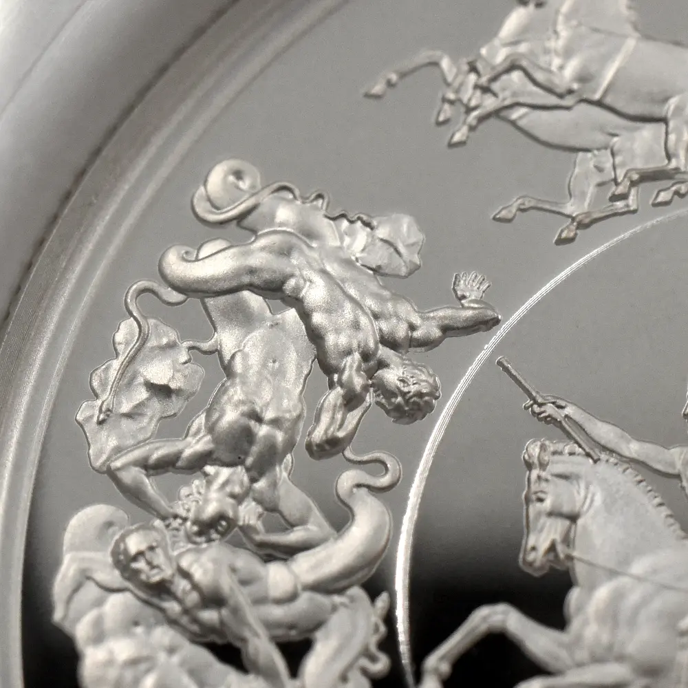 ©The Royal Mint 「偉大なる彫刻家シリーズ」の第7弾を数えるこの度の「ワーテルロー・メダル」裏面デザインの発表は、ピストゥルッチ畢生の大作として英国貨幣界に刻まれる同作品の全貌を世に伝える重要な役割を果たすものです。作品裏面には、前作と同様の戦闘シーンのバリエーションが連続的に描かれており、千変万化する戦意の高揚が見事に意匠化されていて圧巻です。戦闘シーンと言いますと、通常は残虐であったりすることが殆どではないかと思われますが、ピストゥルッチの感性に触れますと完璧にコントロールされた純粋な美感によってろ過され、一枚の絵画を見るかのような深い感動を与えます。