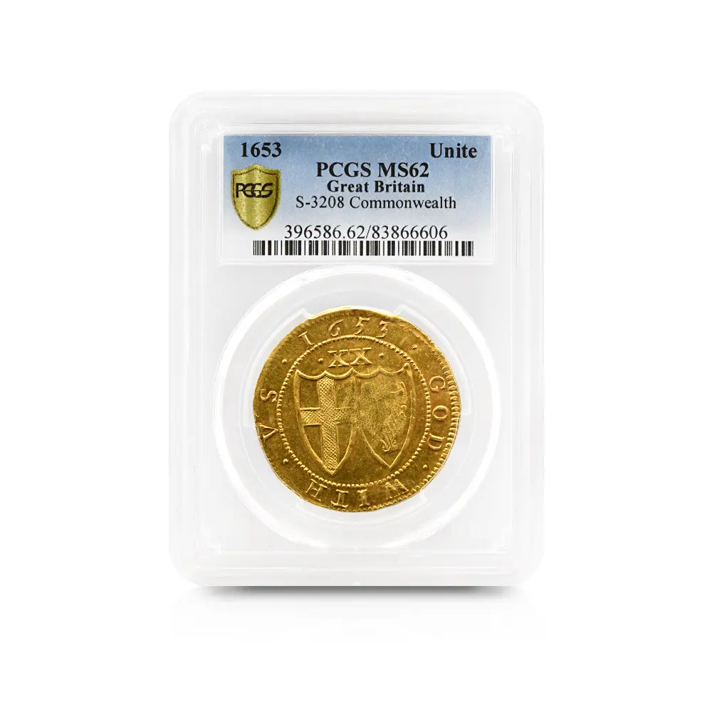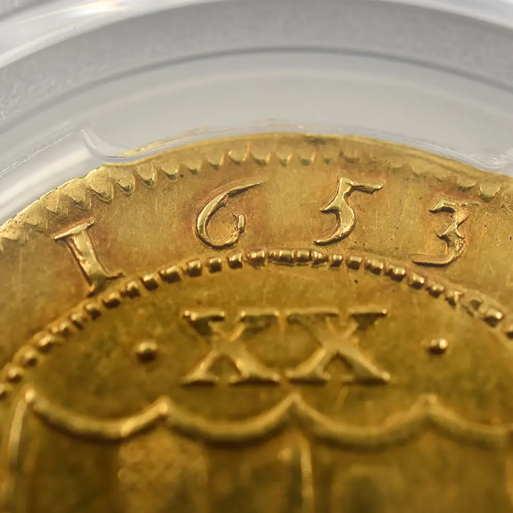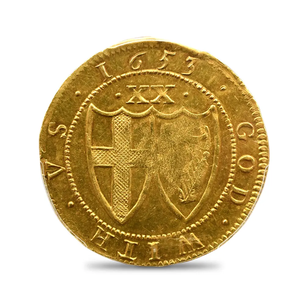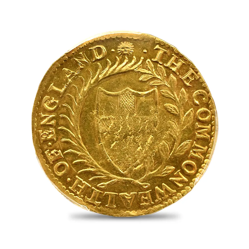 英国史上唯一の共和制を永遠に刻印する当金貨は、激動のコモンウェルス時代を象徴する歴史的遺産に他なりません。そして何よりも忘れてはならないことは、この体制の崩壊が、21世紀の現代にまで存続することになる英国王室のその後の安泰を確立したという事実です。当コインにはその矛盾に満ちた英国史上の不思議な一時代の名残が見られると共に、護国卿クロムウェルを中心に政権を樹立した議会派の活動初年度に発行されたという点が強調される貴重な作品です。表面中央にはイングランド共和国の盾とそれを取り囲む月桂樹と棕櫚のリースが描かれ、その上には太陽の形を模した独特のミントマークが掲げられています。ラテン語で刻まれることの多い17世紀当時発行のアンティーク・コインですが、表面の碑文は「イングランド共和国」と英語で表記されています。さらに裏面には共和国と同盟国アイルランドの盾の紋章が掲げられており、「神は我々と共に」とピューリタン的な心情をこれもまた英語で表現しています。この時代の全ての金貨は22金で制作されており、この金貨も例外ではありません。また銘文を英語のシンプルな文体で表記した最初期のコインでもあります。真に歴史的な事象である清教徒革命の果てに樹立したイングランド共和国の栄光と落日を同時にシンボライズする当コインは、英国貨幣史上最も歴史の一時代を象徴する名貨として、今後更に希少価値の高揚を実現することでしょう。