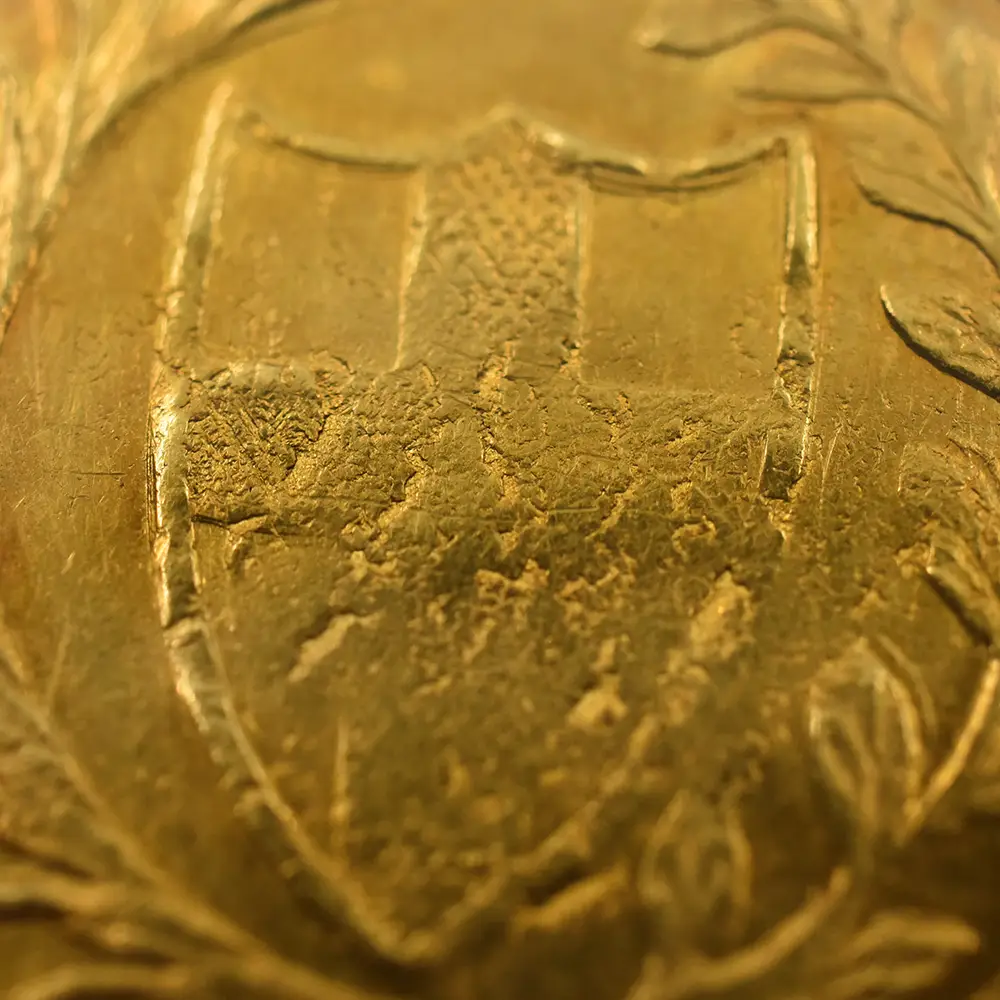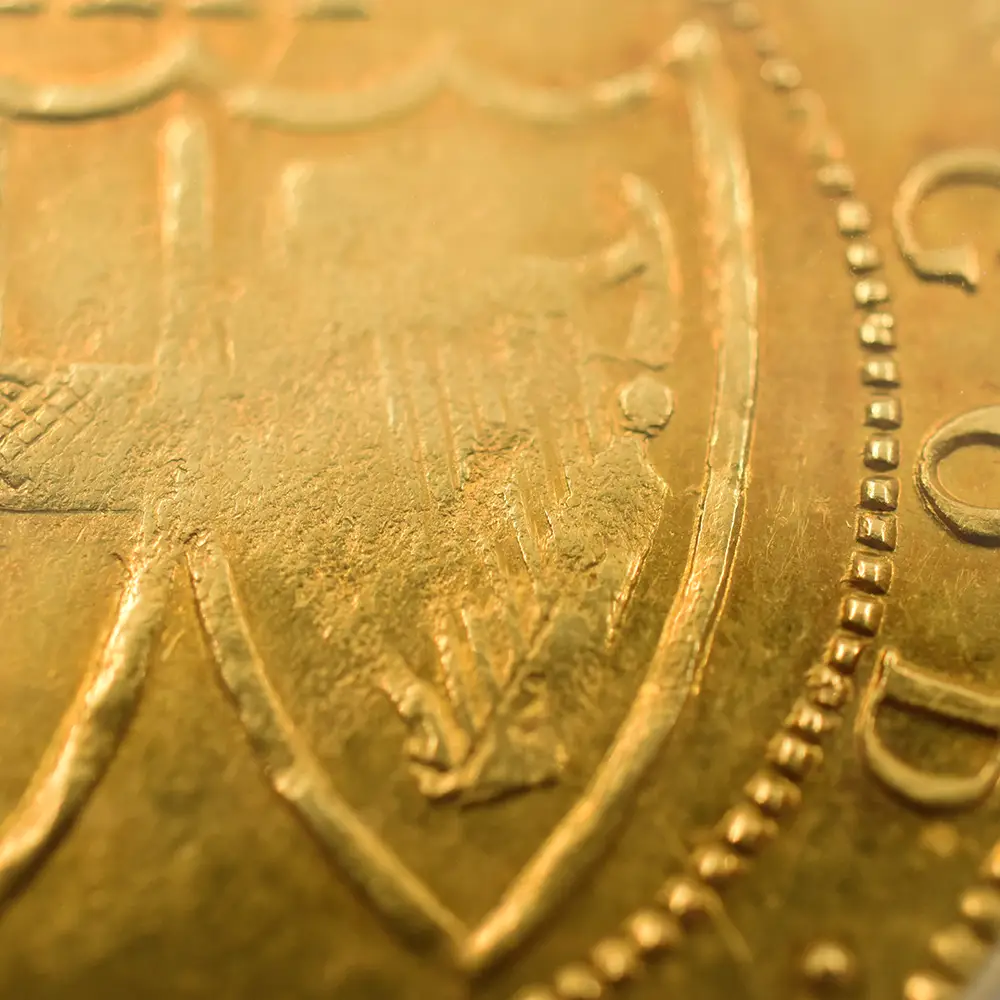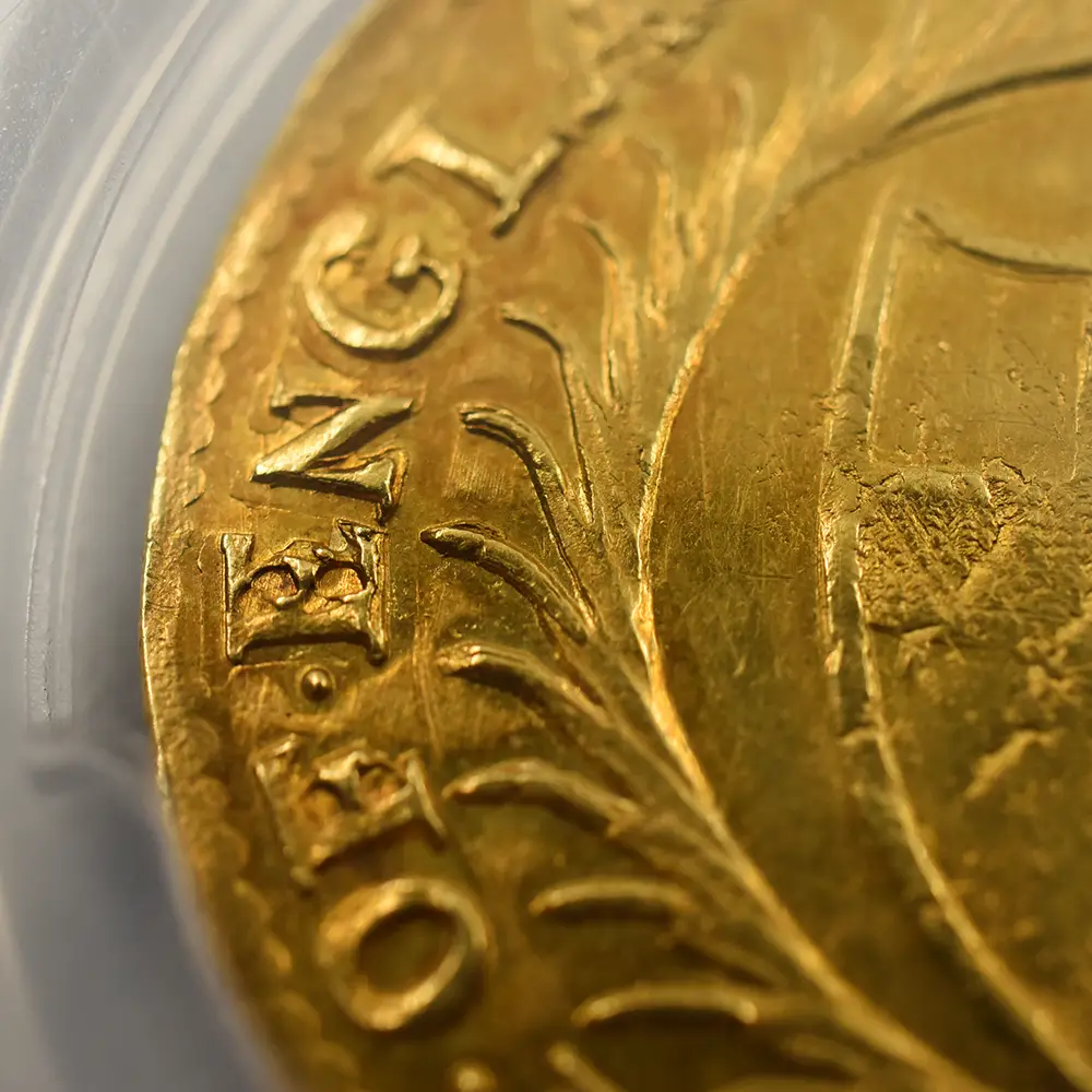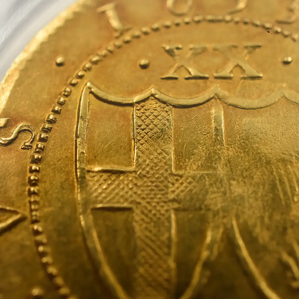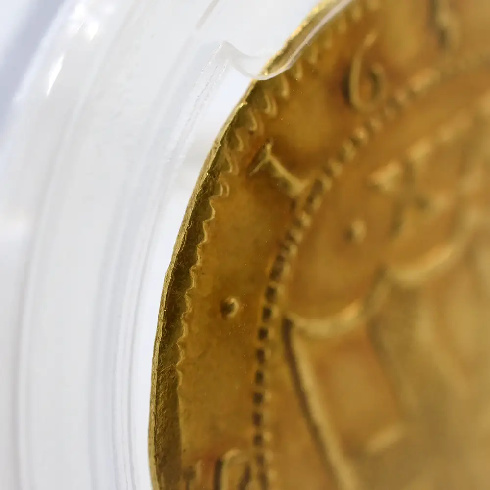 英国史上唯一の共和制を永遠に刻印する当金貨は、激動のコモンウェルス時代を象徴する歴史的遺産に他なりません。そして何よりも忘れてはならないことは、この体制の崩壊が、21世紀の現代にまで存続することになる英国王室のその後の安泰を確立したという事実です。当コインにはその矛盾に満ちた英国史上の不思議な一時代の名残が見られると共に、護国卿クロムウェルを中心に政権を樹立した議会派の活動初年度に発行されたという点が強調される貴重な作品です。表面中央にはイングランド共和国の盾とそれを取り囲む月桂樹と棕櫚のリースが描かれ、その上には太陽の形を模した独特のミントマークが掲げられています。ラテン語で刻まれることの多い17世紀当時発行のアンティーク・コインですが、表面の碑文は「イングランド共和国」と英語で表記されています。さらに裏面には共和国と同盟国アイルランドの盾の紋章が掲げられており、「神は我々と共に」とピューリタン的な心情をこれもまた英語で表現しています。この時代の全ての金貨は22金で制作されており、この金貨も例外ではありません。また銘文を英語のシンプルな文体で表記した最初期のコインでもあります。真に歴史的な事象である清教徒革命の果てに樹立したイングランド共和国の栄光と落日を同時にシンボライズする当コインは、英国貨幣史上最も歴史の一時代を象徴する名貨として、今後更に希少価値の高揚を実現することでしょう。