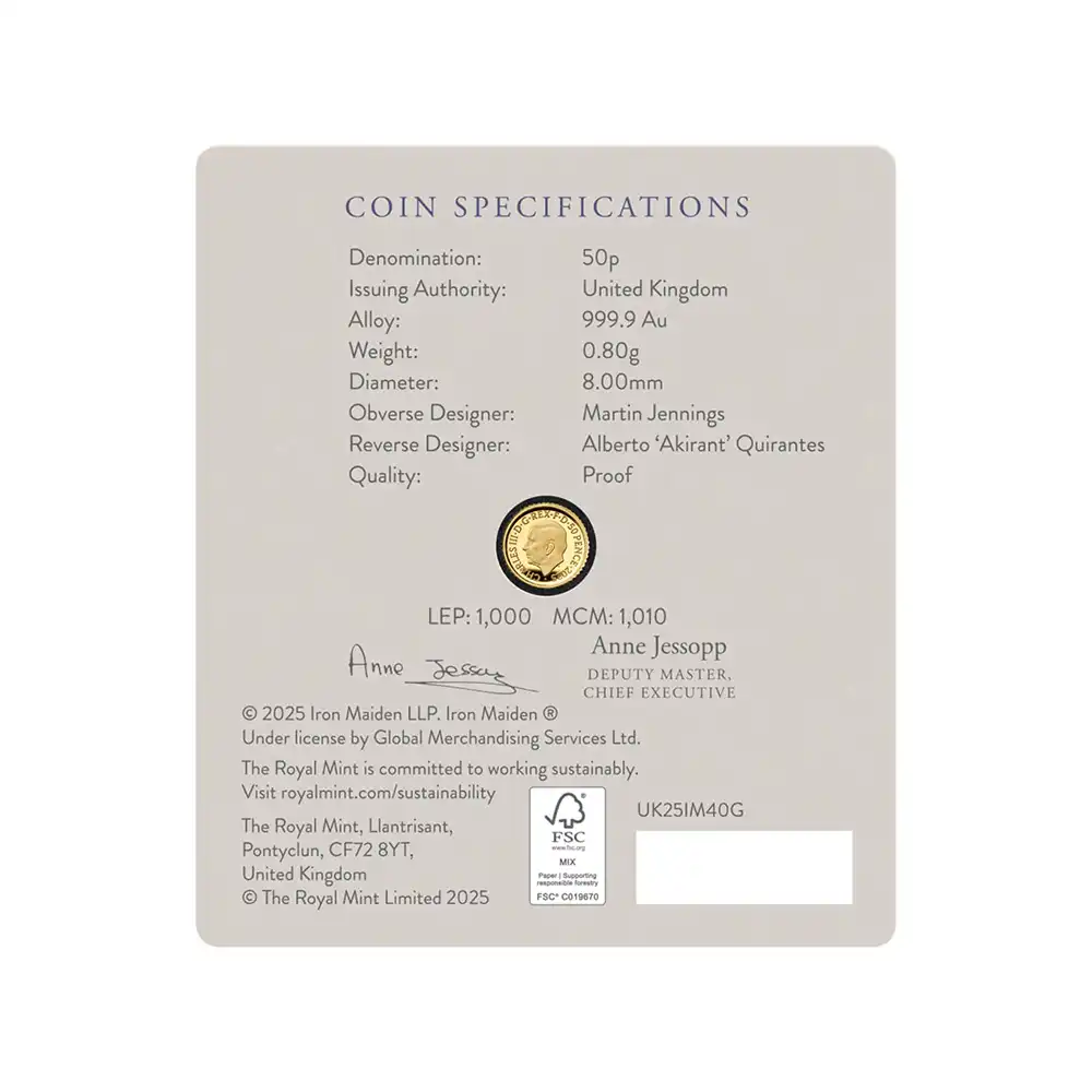 2025 チャールズ3世 ミュージックレジェンド第11弾 アイアン・メイデン 50ペンス1/40オンス プルーフ金貨 未鑑定 パッケージ付き【ご予約承り品】