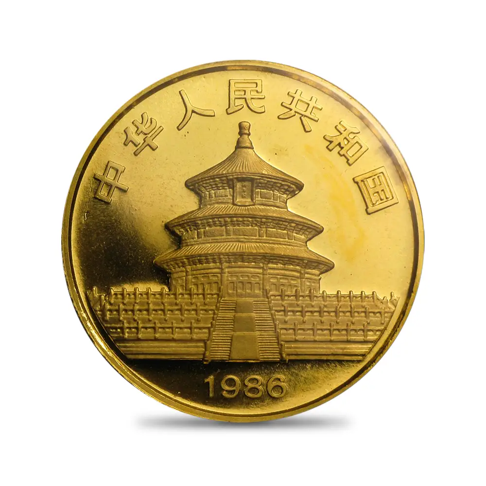 1982年の初登場以降、世界中のコインコレクターや投資家の垂涎の的となっている中華人民共和国の造幣公司の発行によるパンダ地金型金貨。人気の秘密は毎年新たに発表されるコイン表面のパンダのデザインであり、丸々としたかわいらしいパンダの姿は人間の幼子の仮の姿のようです。1982年に初発行となったパンダ地金型金貨ですが、1オンス、1/2オンス、1/4オンス、1/10オンス、1/20オンスの5種類のラインアップが用意されており、予算に合わせて選択できる点が重宝します。同コインが初めて世に出た1982年当時、地金型コインというものがまだ一般的に流通しておらず、南アフリカのクルーガーランド金貨やカナダのメープルリーフ金貨などが知られているに過ぎませんでした。そもそも一般人が金地金を保有するということ自体が稀であったため、これらのコインは驚異的なセールスを記録しました。その中でも中国のパンダ金貨は、デザインの秀逸性によって群を抜く存在として受け止められ、パンダのデザインそのものが中国のトレードマークとしての役割を果たしていたようなものでした。動物学的にはクマ科の大型動物に分類されるパンダですが、20世紀初頭まではアライグマの一種であるレッサーパンダこそが本物のパンダであると誤認されていたようです。これは本物のパンダを目にしたことのないヨーロッパ人たちが小型動物のレッサーパンダを本物を混同したことから生じたとされています。中華人民共和国の南部からベトナム北部にかけて生息する野生のパンダは、現在絶滅危惧種として行政によって保護の対象となっています。1949年に中華民国から中華人民共和国へと移行した中国の新たな国家的象徴として取り挙げられたパンダは、その後、政府の対外的政策の一環として諸外国に貸し出され、「パンダ外交」の真の主役としての役割を果たし今日に至ります。我が国日本においても1972年10月に結ばれに日中国交正常化の返礼という形で東京の上野動物園に二頭のジャイアントパンダ、ランランとカンカンが貸し出され、長年にわたって愛されていました。今回ご紹介させていただく作品は、100元1オンス・パンダ地金型金貨の1986年度版です。初発行から4年目に発行された当金貨は正真正銘のヴィンテージ品であり、地金型金貨ならではの高純度のゴールドの輝きが眩しい傑作です。コイン表面には正面を向いて4本足で立つ愛らしいパンダが描かれています。その周囲には竹林が形成されており、パンダが生息する普段の環境をリアルに暗示させます。コイン裏面には中国の正式国名と共に、北京市内に存在する最重要歴史的建造物の一つとして知られる天壇が描かれています。天安門や紫禁城と並んで有名なこのモニュメントは、元々1420年に明王朝第3代皇帝の永楽帝(在位:1402-1424)が造営し、その後、明王朝と清王朝の歴代皇帝たちが祭祀を行う場として発展を遂げました。敷地内の建築群の中でも古い歴史を誇る祈年殿は、皇帝が五穀豊穣を祈念する場として用いられていました。現代中国の代名詞として世界的に愛されるパンダを描く当ヴィンテージ金貨は、将来的な実物資産投資を象徴する新たな指標の一つとして、コインコレクターや投資家に重用されることでしょう。