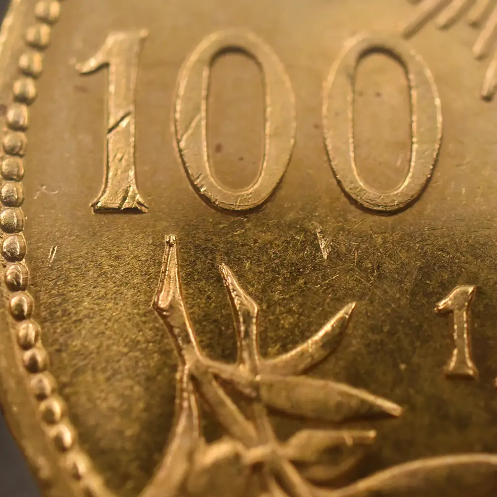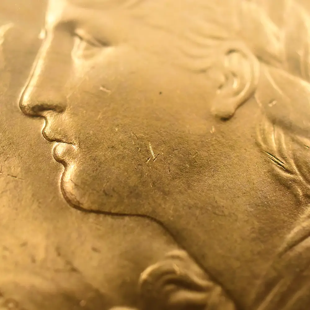 ヨーロッパにはそれぞれの国家を象徴する擬人化された女性像が存在します。イギリスのブリタニア、フランスのマリアンヌ、ドイツのゲルマニアが特に有名ですが、スイスのそれはあまり知られていないかもしれません。スイスを象徴する女性像とされるヘルヴェティア(Helvetia)と呼ばれる女性像は「スイスの母」とも称されることもあり、長い外套を身に纏いスイス国旗の盾を携えた姿で描写されることが一般的です。そして編み込まれた髪の毛とスイス連邦の結束の象徴であるリースを掲げているのが特徴です。神格化された女神像では無いものの、スイス国家の心の拠り所としてのヘルヴェティアの神々しい姿は、大自然の舞台であるスイスの国土を想起させるものがあります。そして実際にこの「ヘルヴェティア」の名は、擬人化される前からスイス西部の古称としてずっと存続していました。紀元前1世紀ごろにヘルウェティイ族と呼ばれるケルト系の民族が現在のドイツ南部からスイスに移住してきたことがこの名称の直接的な由来とされています。その後、同民族は北上するローマ人と接触することになり、紀元前58年にはカエサルの軍隊によってスイス内陸部に押し戻されます。また紀元前15年にはローマ帝国によって現在のスイスの地にヘルヴェティア属州が設置されます。アルプス山脈とジュラ山脈に囲まれた台地からなるこの古代ヨーロッパの中央地帯は、それ以降ローマ語のヘルヴェティアの名によって一般化され、今日なおもスイス連邦を意味する古語として詩的に用いられることもあります。このような歴史的背景から、スイスは今でも「Confederation Helvetica=ヘルヴェティア連邦」と呼ばれることもあります。ヘルヴェティアは長期間にわたって平和と繁栄を謳歌しましたが、紀元260年、ドイツ人の侵攻によってローマ人たちは国外に追いやられます。その後もフランク人やドイツ人が交互にこの地を支配下に置きましたが、最終的には1291年8月1日に現在のスイスの祖であるスイス連邦が成立します。女性像ヘルヴェティアは、中央ヨーロッパで長い歴史を誇るスイスに相応しい堂々たる貫録を特徴とします。今回ご紹介させていただくコインは、1897年の初発行以降、1949年までスイス連邦の法定通貨として発行されていた金貨の100フラン仕様のものです。10フランから100フランまでの3種が存在するバリエーション豊富な通貨ですが、52年間の間に5800万枚が発行されたことが記録されています。一般的には「ブレネリ金貨」の俗称によって知られているこのタイプの金貨ですが、この名はスイス人の女性名「フレニ(Vreni)」の愛称であり、「おおブレネリ」という有名なスイス民謡でも歌われています。歌の中ではスイスの湖のほとりに住む羊飼いの少女として印象的に描写されています。コイン表面には女性像ヘルヴェティアの左向きの肖像が美しく描かれており、当コインの眼目となっています。この作品は、ヌーシャテルのメダル制作家フリッツ・ユリス・ランドリーが1895年に制作した原画に基づいて制作されたものです。この見事な肖像ゆえに人気の高いブレネリ金貨ですが、少女の編み込まれた髪の毛が素朴な魅力を醸し出しており、また背後の山々の景色がスイスの大自然を想起させる点が最大の見どころです。少女の頭上にはスイスの古称であり少女像の名前でもある「Helvetia」の語が刻まれています。そして裏面には発行年1925年の西暦とスイスの国章、また100フランの額面価と植物のリースが添えられており、スイスの法定通貨ならではの格調の高さを見事に演出しています。なお100フラン貨幣は1925年のみの限定発行であり、発行枚数も5000枚のみであったことから極めて高い希少性を誇ります。清純なアルプスの乙女を表面に描く当100フラン金貨は、発行されてから本年で100周年を迎える正真正銘のアンティーク・ヨーロピアンコインの逸品であり、コインコレクター垂涎の傑作でもあります。